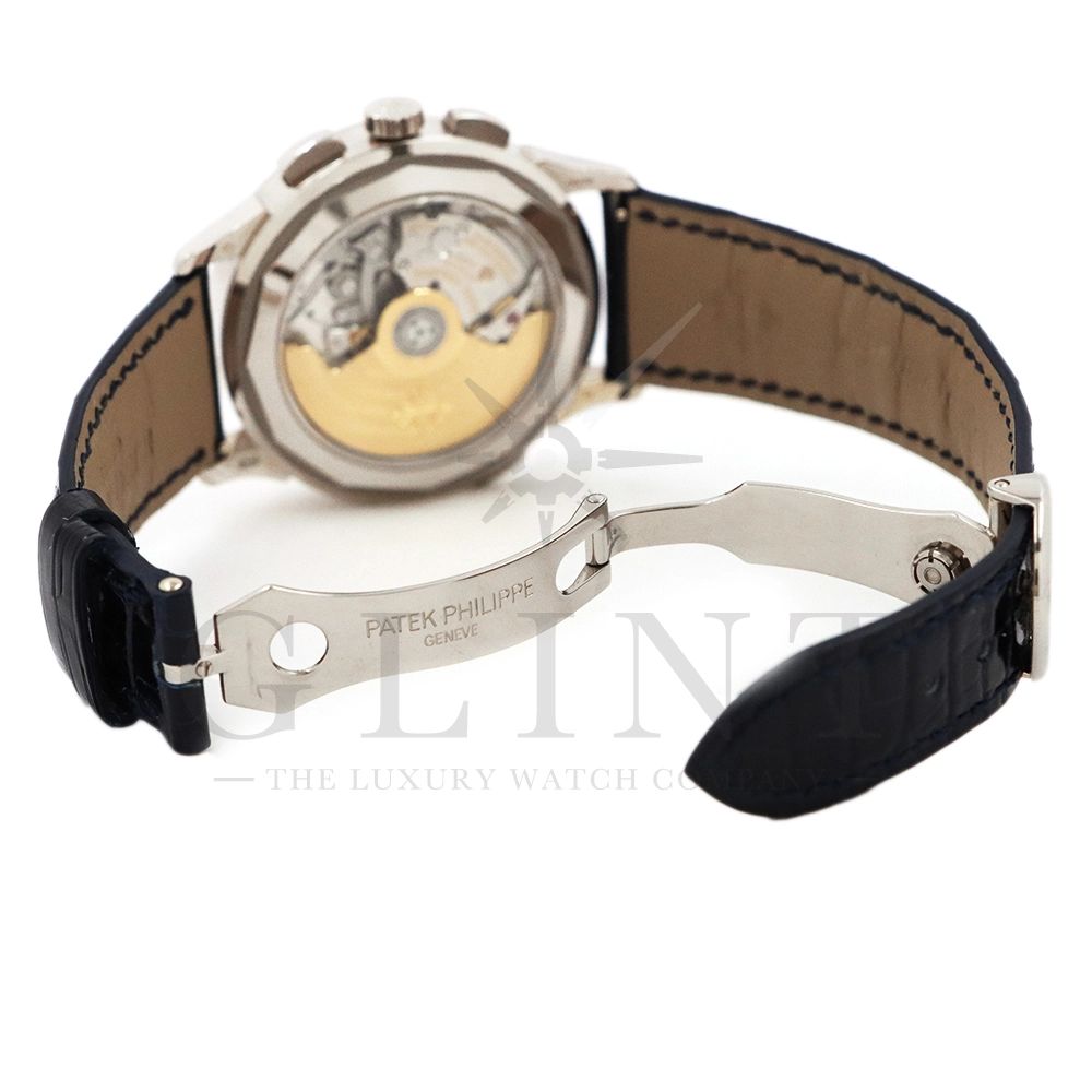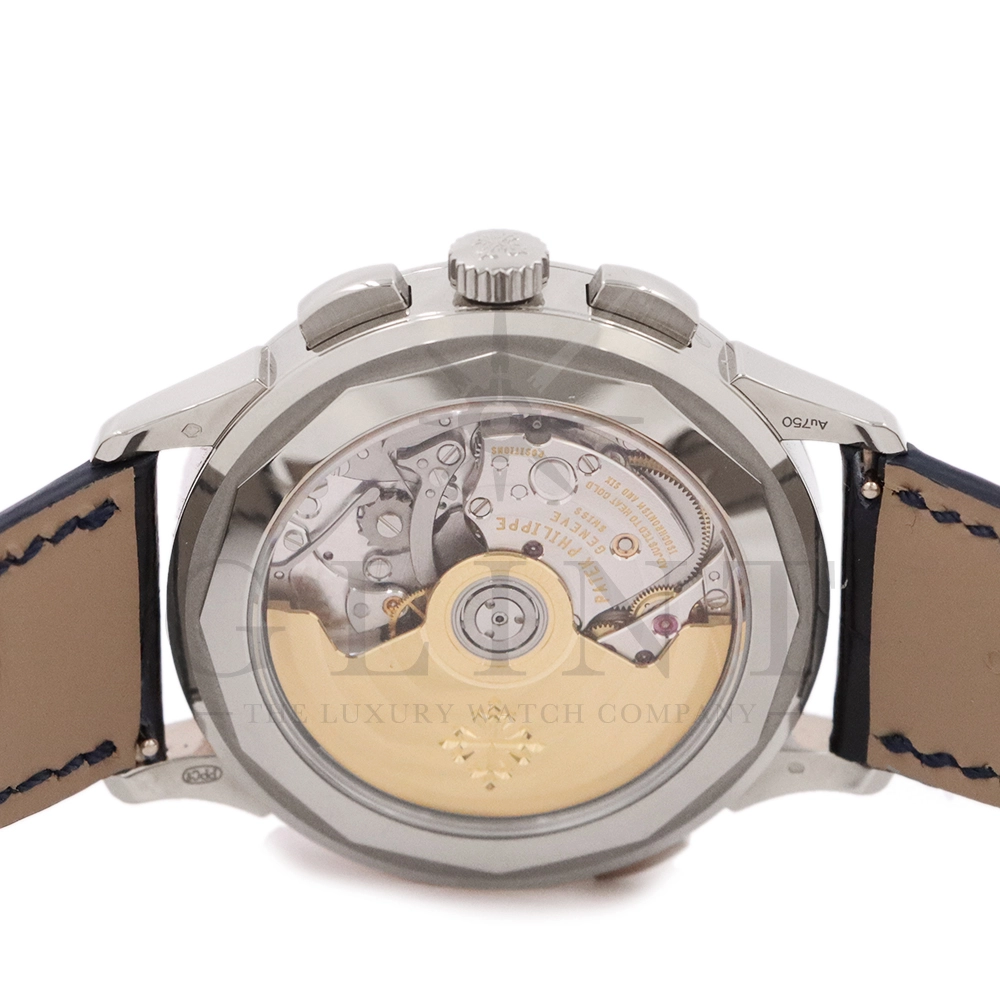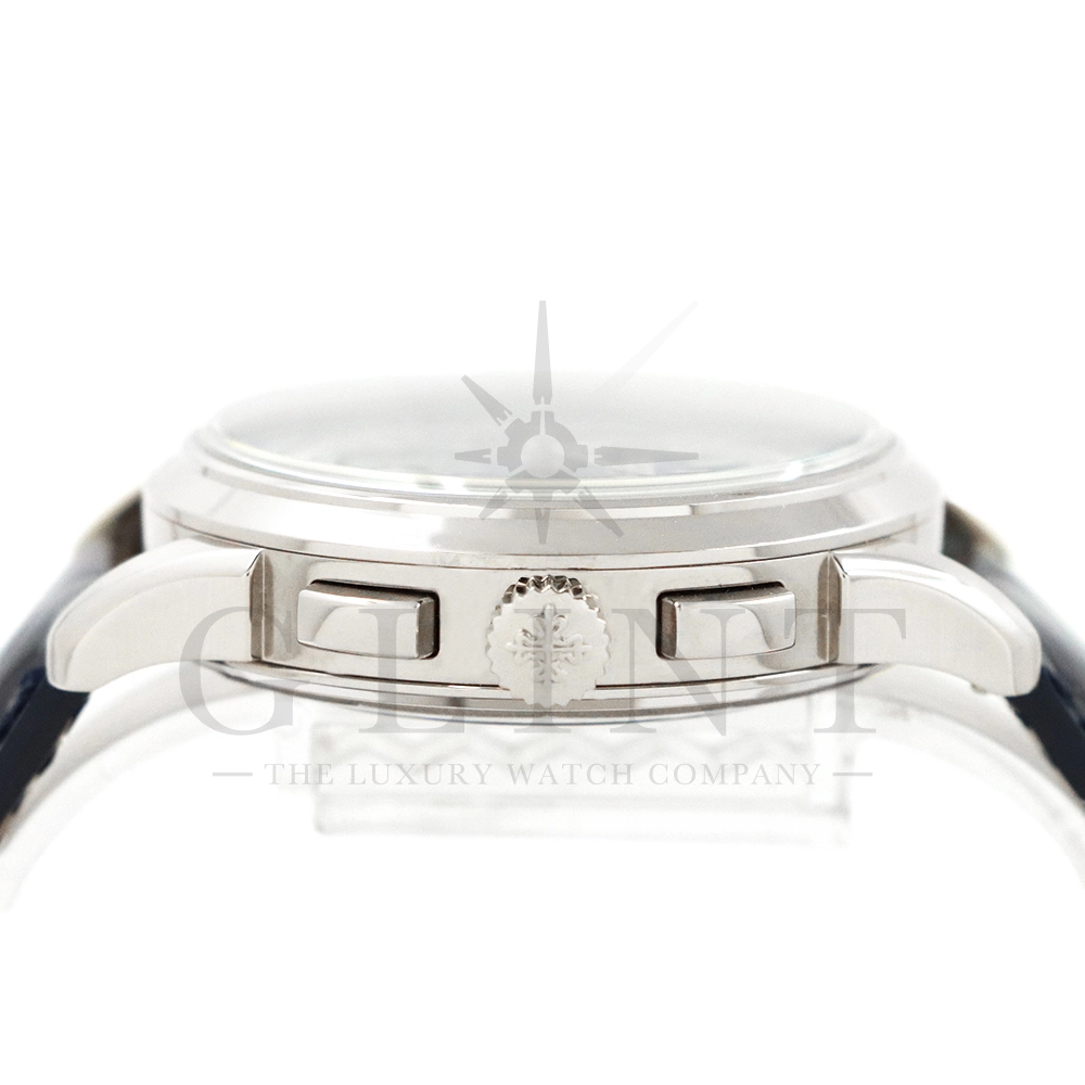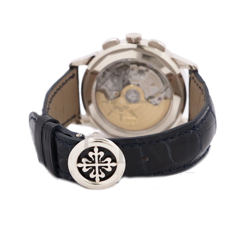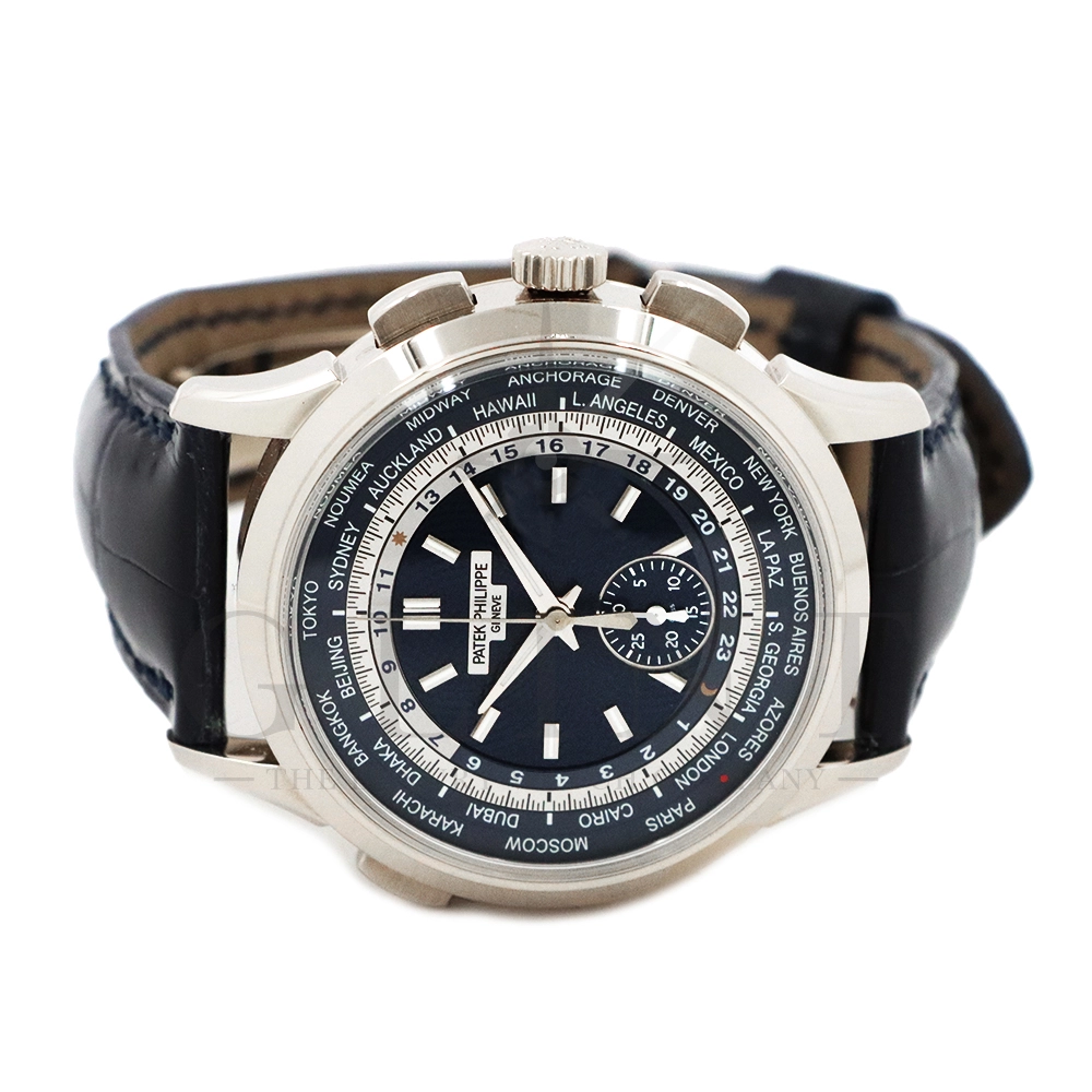 こちらはパテックフィリップ コンプリケーション ワールドタイム・クロノグラフです。パテックフィリップ史上初となるクロノグラフが搭載されたワールドタイム。2つの機能をこれまでにない新しい方法で統合したムーブメント「Cal.CH 28-520 HU」を搭載しています。垂直クラッチ搭載のフライバック付きで、クロノグラフの秒針を通常の秒針としての使用する事が可能です。文字盤にはブルー・オパーリンを採用し、ダイアルセンターにはギョーシェ装飾が施されております。センターダイアルの周囲に、二重の回転リングをもち、10時位置のプッシュボタン操作と同期すること(カップリング機構)で、世界24都市の現地時間が一目で読み取れるようにな。外周リングには、「24の都市名」が記載され、内周リングには「24時間表示の時間目盛」が記載され、視認性の高い仕上がりです。唯一無二の高級感を演出してくれる至極の一本です。