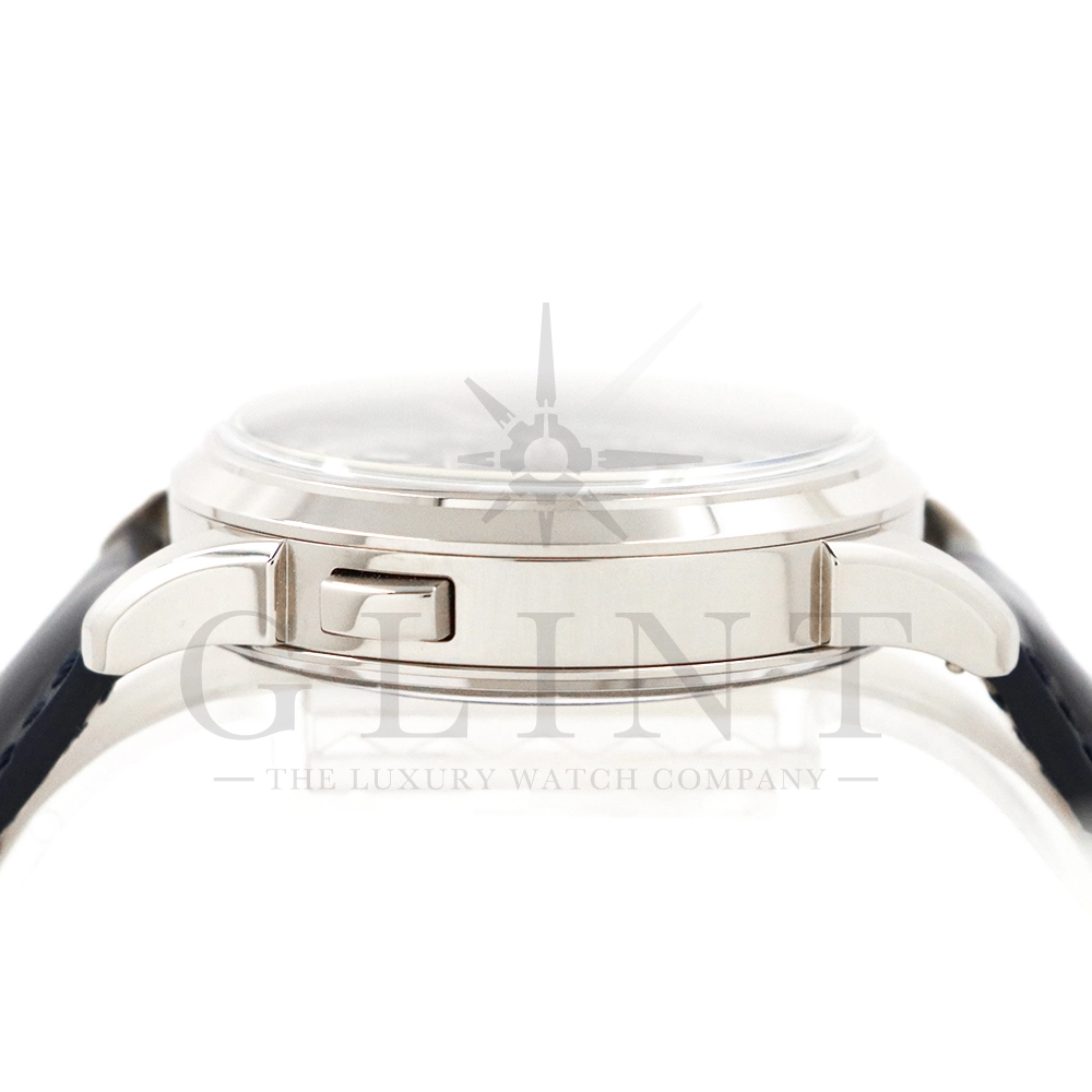 文字盤:ブルー・オパーリン、手仕上げのギヨシェ装飾、夜光付ゴールド植字インデックス