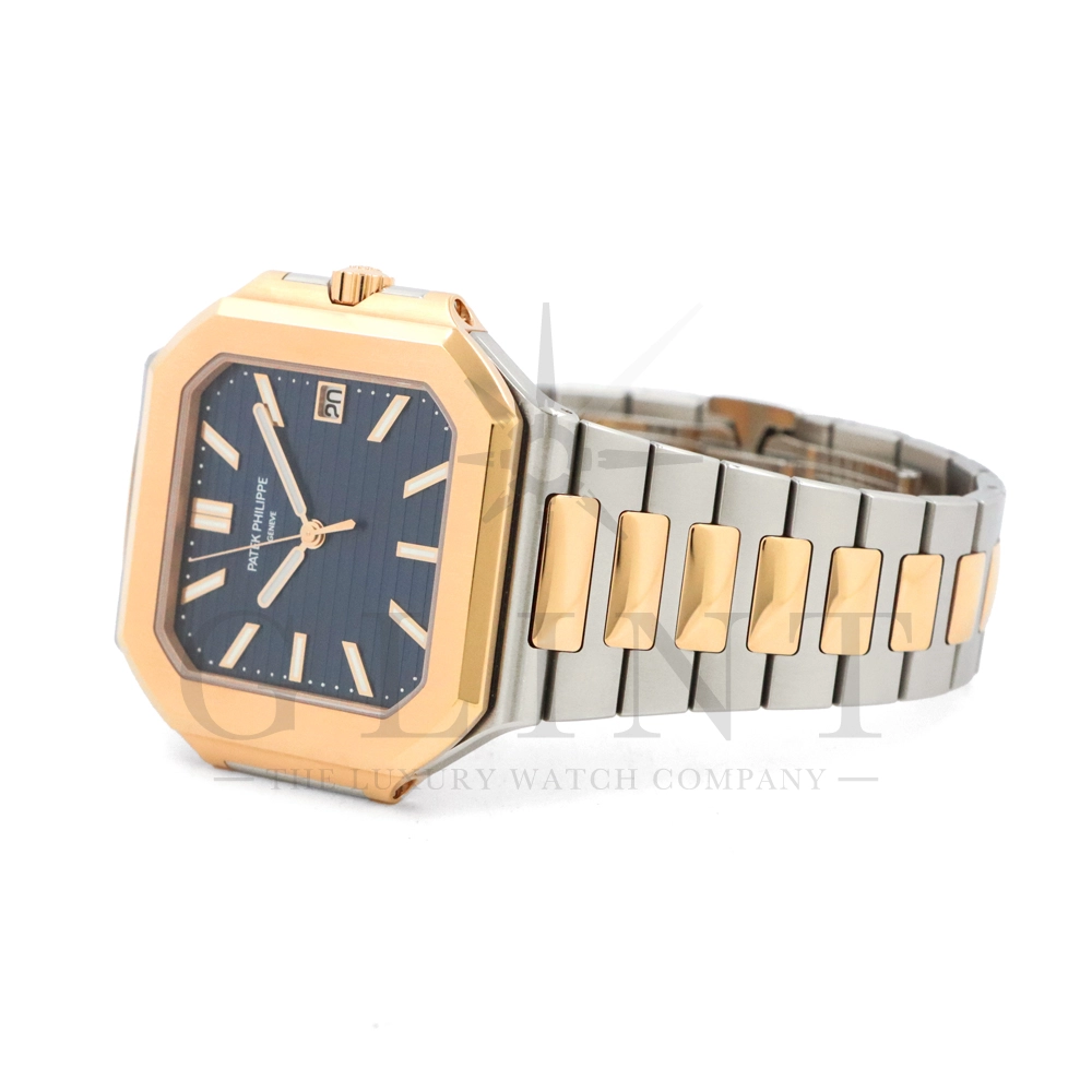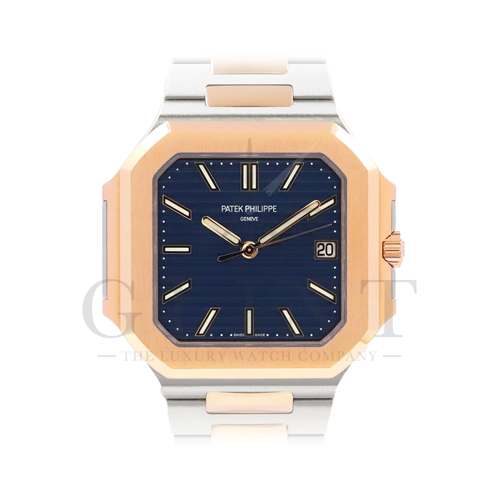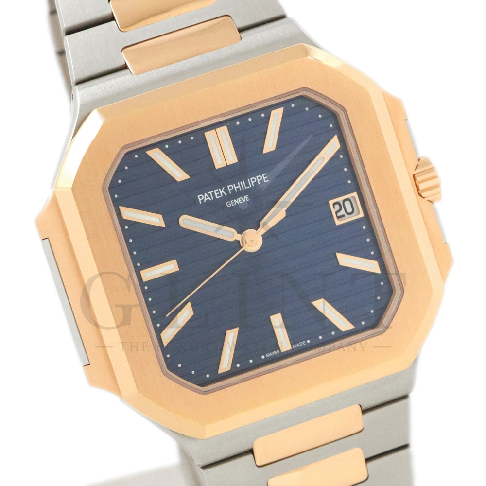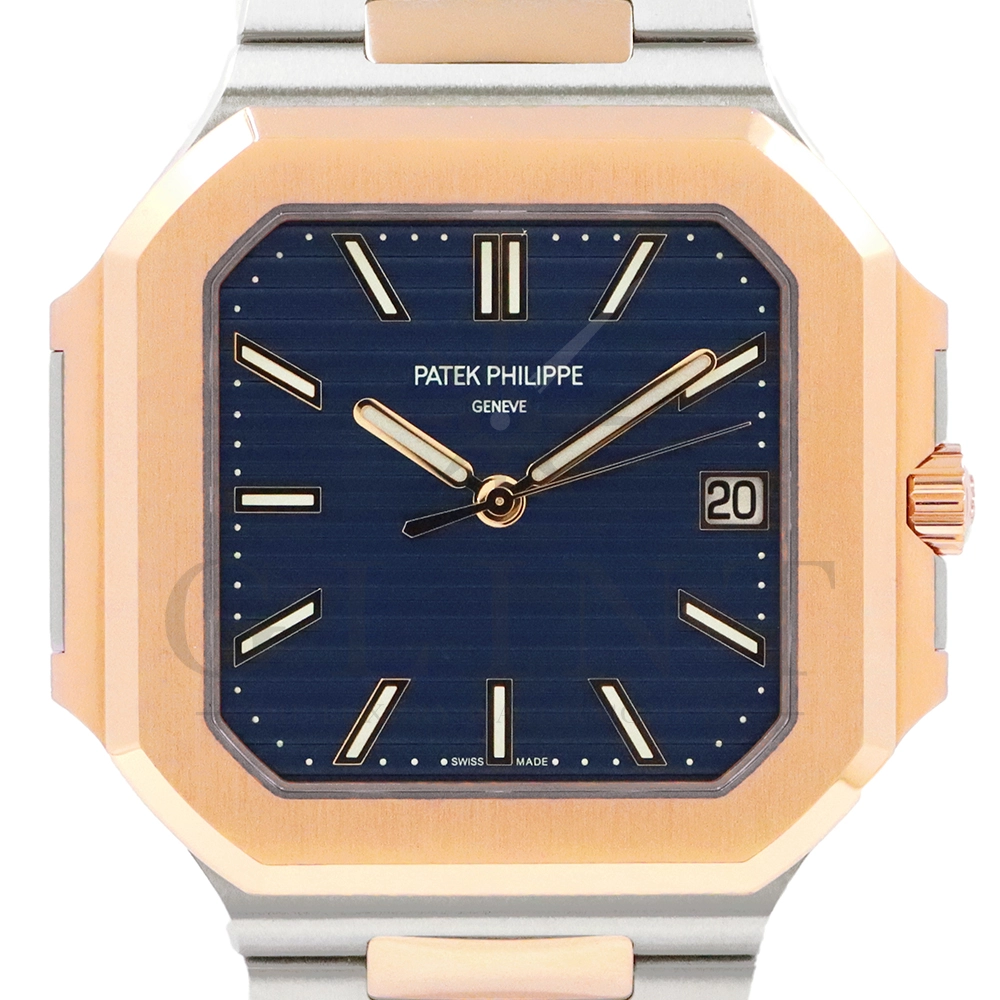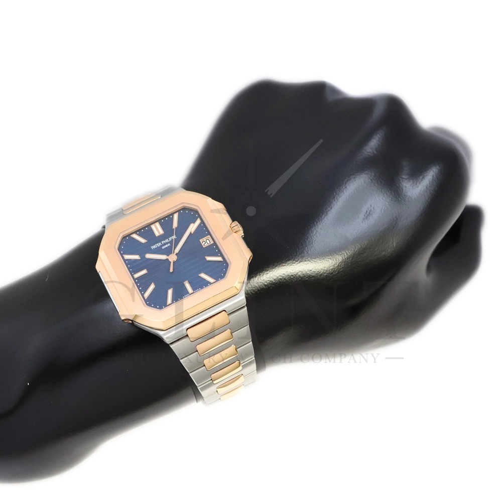 こちらはパテックフィリップ2024年新コレクション「Cubitus(キュビタス)」 5821/1AR-001です。大胆さとエレガンスのユニークな融合を体現した新しいコレクションは、45mmと少し大きめの丸みを帯びたスリムなスクエア型ケースになっており、手首にエレガントにフィットすることが特徴です。水平エンボス文字盤は、鮮やかなブルー・ソレイユカラー。ローズゴールド&ステンレススチール・ブレスレットには、ロック可能な調整システムを備え、快適性と安全性を保証する、特許取得のパテック フィリップ折り畳み式バックルが装着されています。さらに、ムーブメントには、ストップ・セコンド機能を備えたニューモデルのキャリバー26‑330 S Cを搭載。モダンで独自性溢れるデザインのまったく新しいローズゴールド&ステンレススチール・モデルにより、エレガントなスタイルをお楽しみいただる一本です。