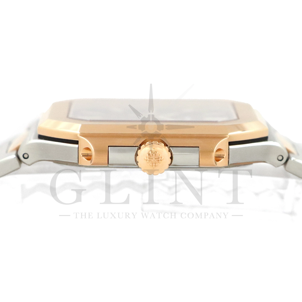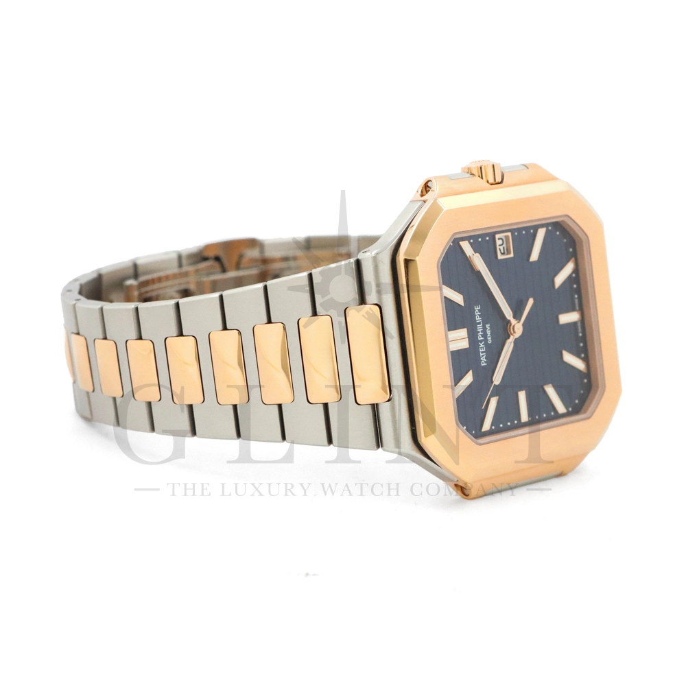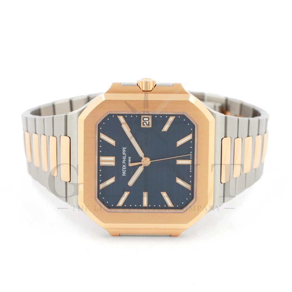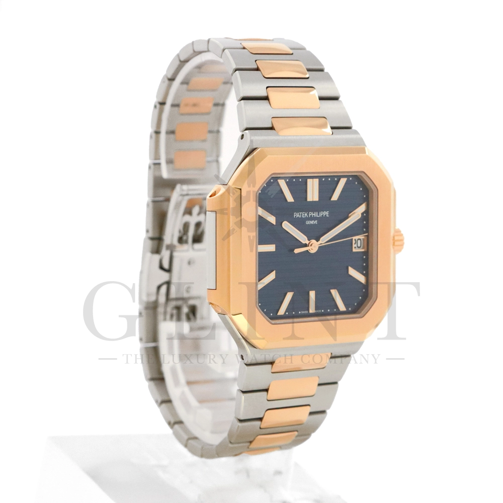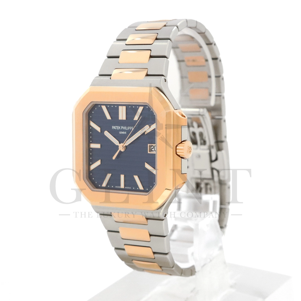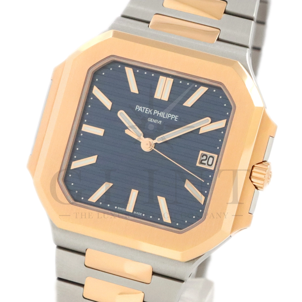こちらはパテックフィリップ2024年新コレクション「Cubitus(キュビタス)」 5821/1AR-001です。大胆さとエレガンスのユニークな融合を体現した新しいコレクションは、45mmと少し大きめの丸みを帯びたスリムなスクエア型ケースになっており、手首にエレガントにフィットすることが特徴です。水平エンボス文字盤は、鮮やかなブルー・ソレイユカラー。ローズゴールド&ステンレススチール・ブレスレットには、ロック可能な調整システムを備え、快適性と安全性を保証する、特許取得のパテック フィリップ折り畳み式バックルが装着されています。さらに、ムーブメントには、ストップ・セコンド機能を備えたニューモデルのキャリバー26‑330 S Cを搭載。モダンで独自性溢れるデザインのまったく新しいローズゴールド&ステンレススチール・モデルにより、エレガントなスタイルをお楽しみいただる一本です。
