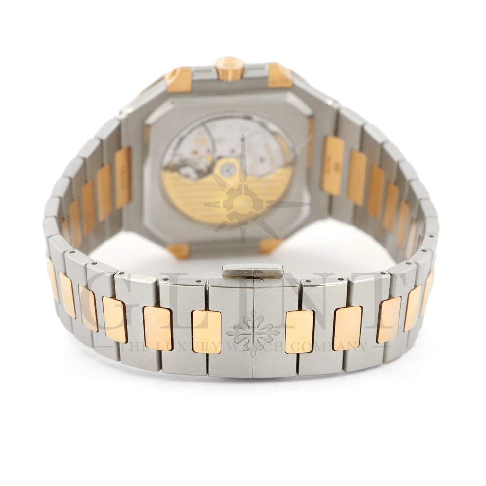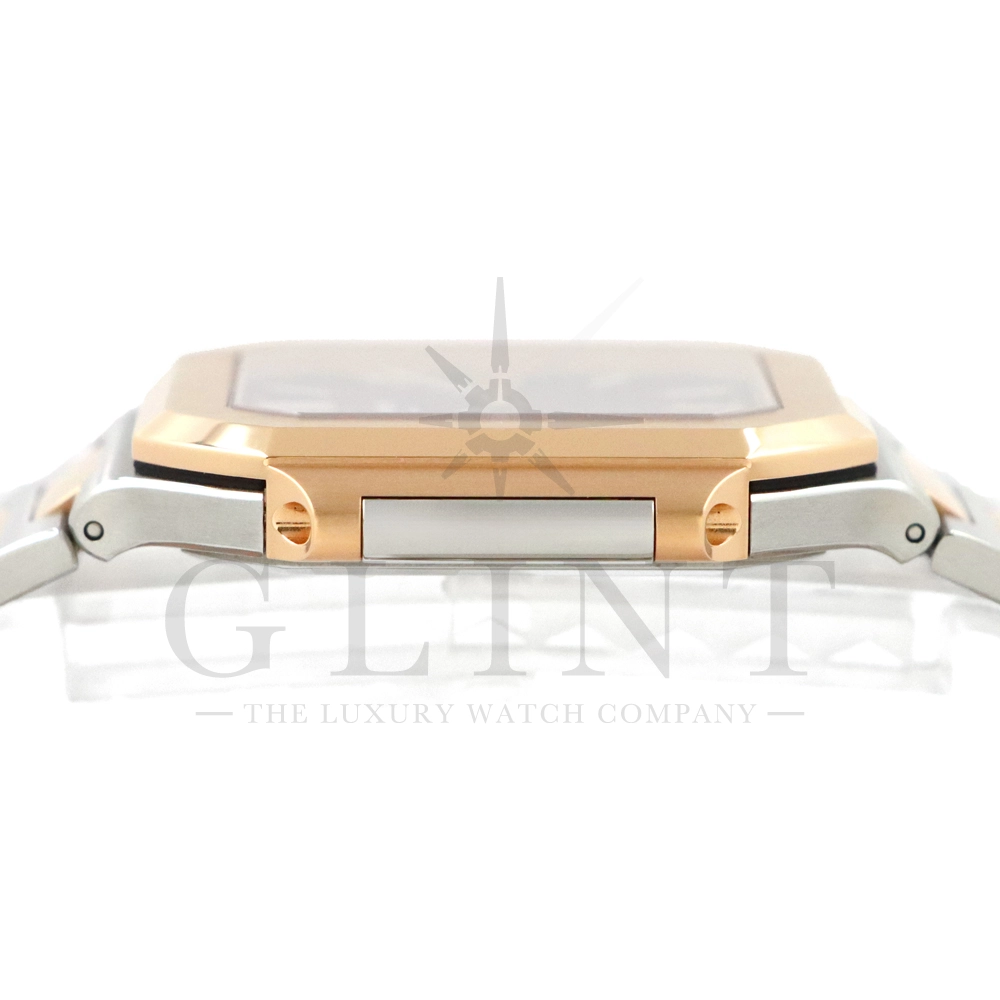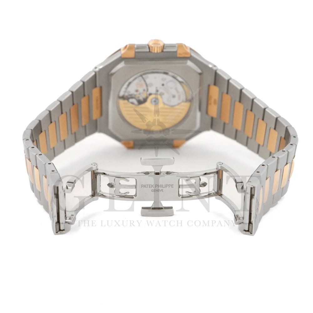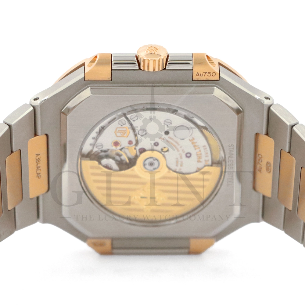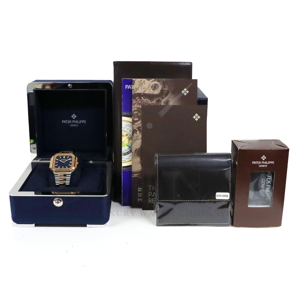 こちらはパテックフィリップ2024年新コレクション「Cubitus(キュビタス)」 5821/1AR-001です。大胆さとエレガンスのユニークな融合を体現した新しいコレクションは、45mmと少し大きめの丸みを帯びたスリムなスクエア型ケースになっており、手首にエレガントにフィットすることが特徴です。水平エンボス文字盤は、鮮やかなブルー・ソレイユカラー。ローズゴールド&ステンレススチール・ブレスレットには、ロック可能な調整システムを備え、快適性と安全性を保証する、特許取得のパテック フィリップ折り畳み式バックルが装着されています。さらに、ムーブメントには、ストップ・セコンド機能を備えたニューモデルのキャリバー26‑330 S Cを搭載。モダンで独自性溢れるデザインのまったく新しいローズゴールド&ステンレススチール・モデルにより、エレガントなスタイルをお楽しみいただる一本です。