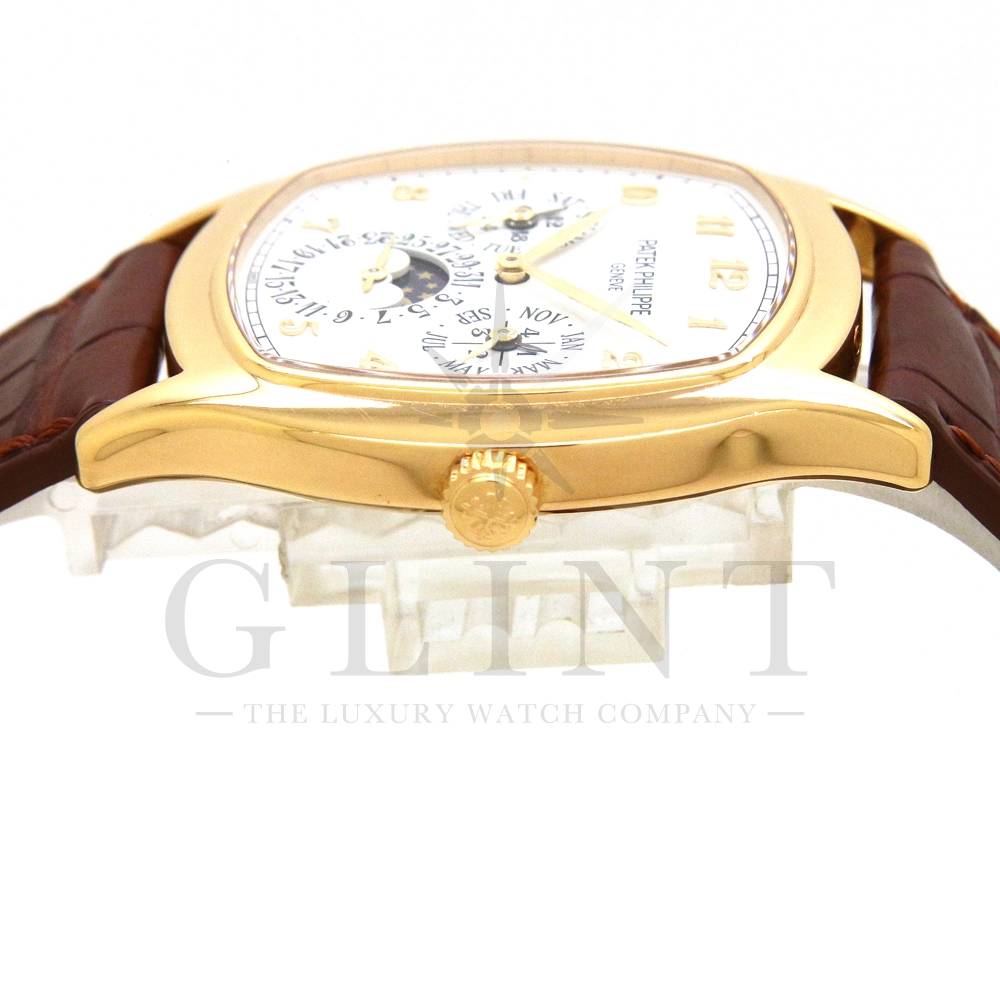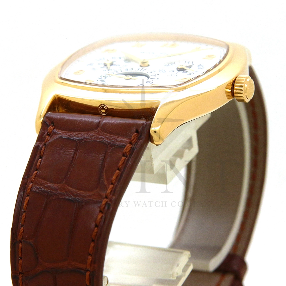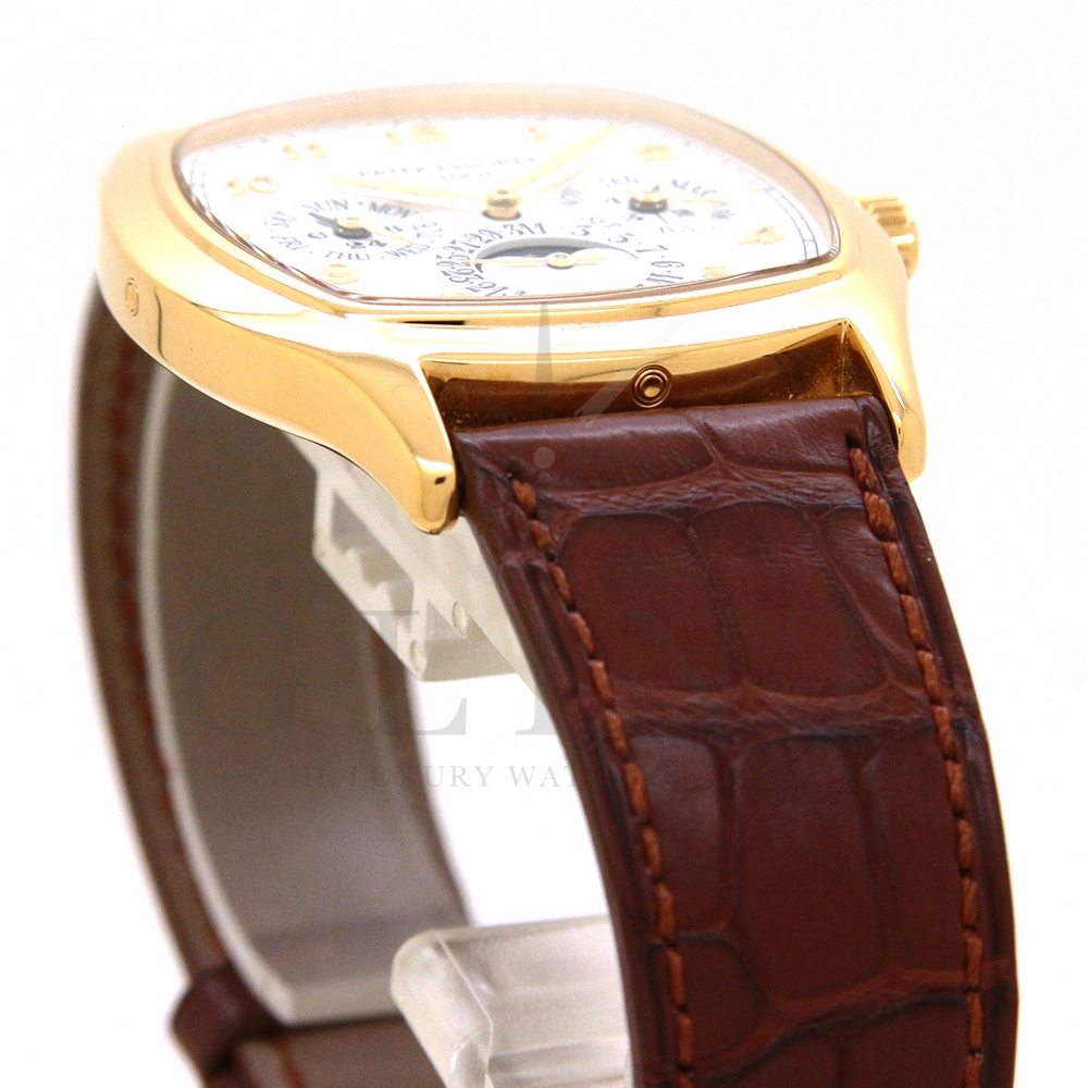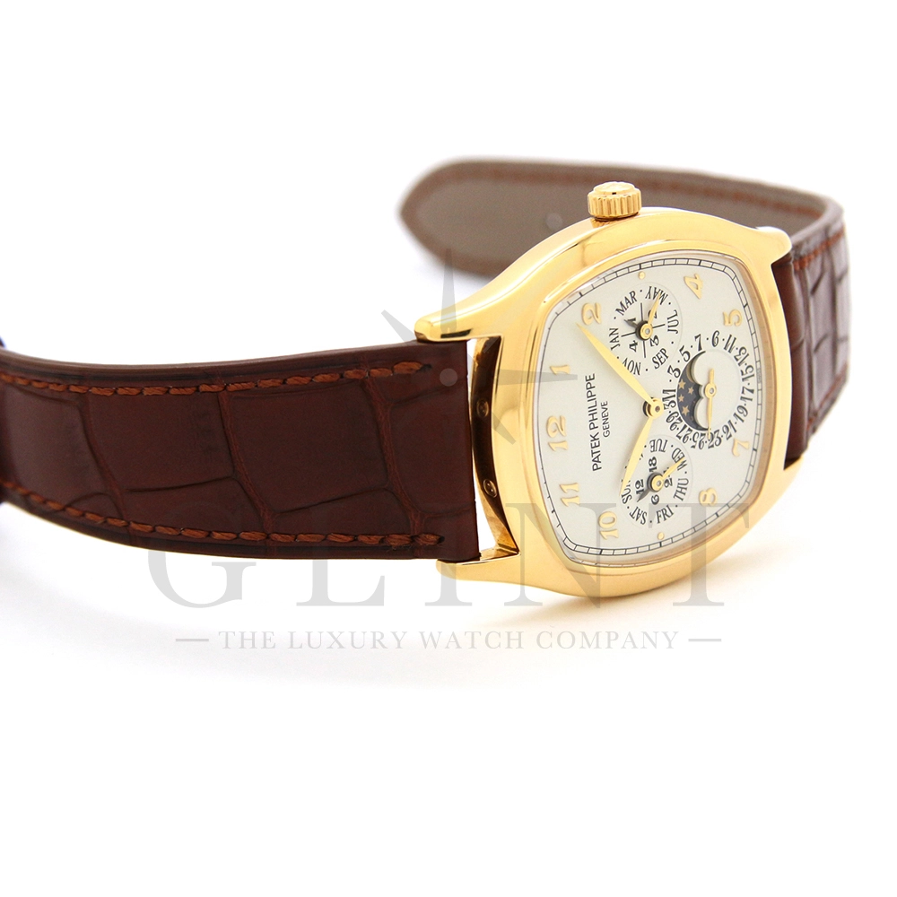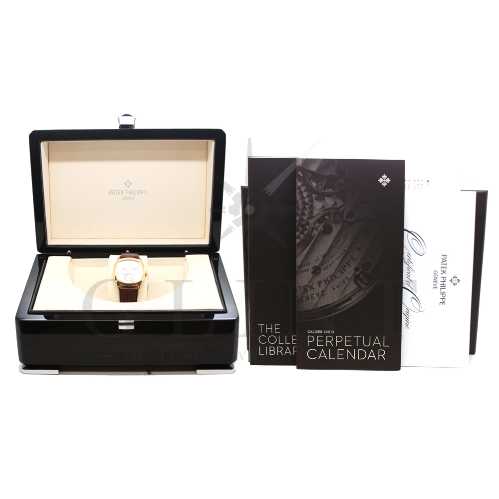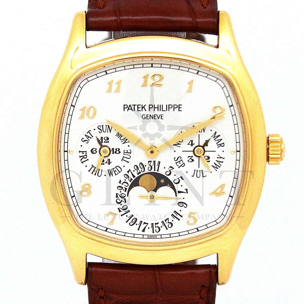 パテックフィリップ グランドコンプリケーション パーペチュアルカレンダー Ref.5940J-001です。その名の通り、日付の調整が不要で閏年まで計算してくれる複雑機構の一つ。ケース素材にはイエローゴールドを使用しており、華やか高級感を与えてくれる仕上がりに。文字盤にはパーペチュアルカレンダー、ムーンフェイズと3つのインダイヤルがレイアウトされております。これだけの機能を搭載した自動巻きモデルにも関わらず、超薄のケース厚を実現できるのもパテックフィリップだからこそ成せる業。伝統的に脈々と受け継がれてきたパテックフィリップのパーペチュアルカレンダーモデルは、いつの時代も色褪せることが無い魅力が備わった最高級の一本です。