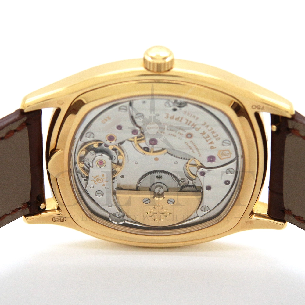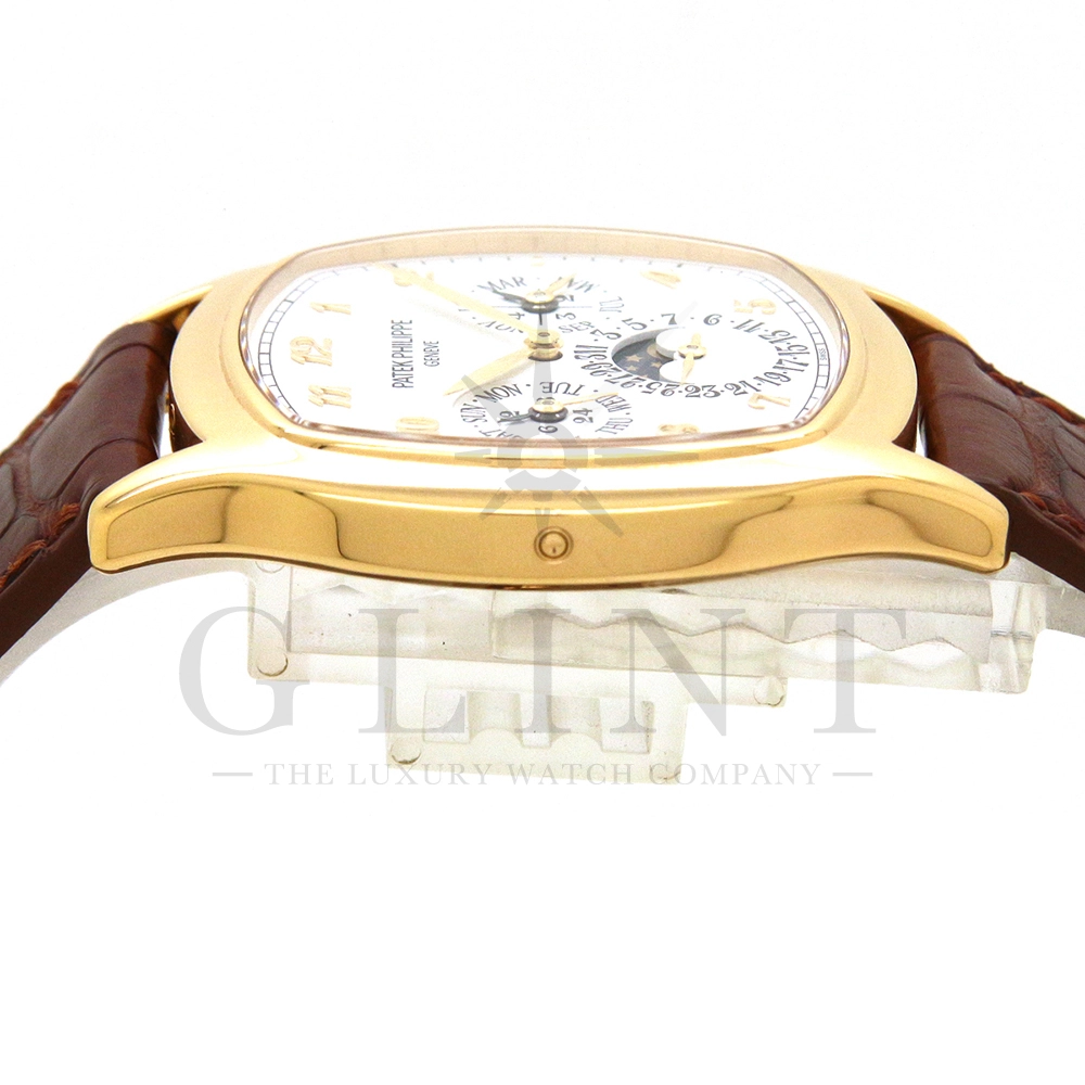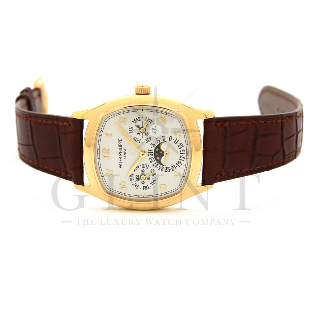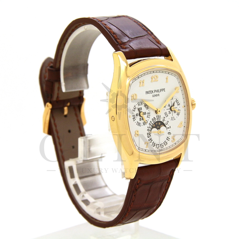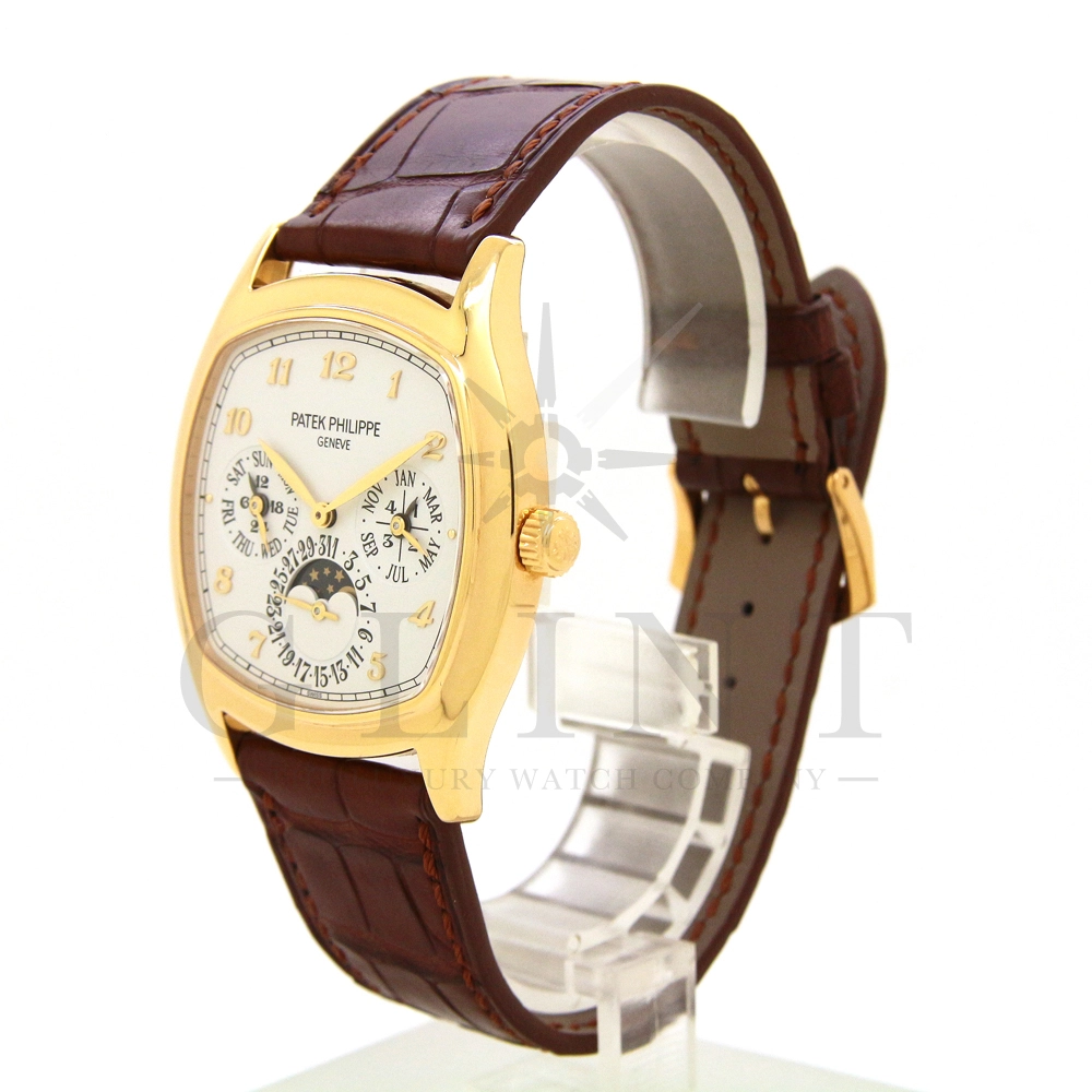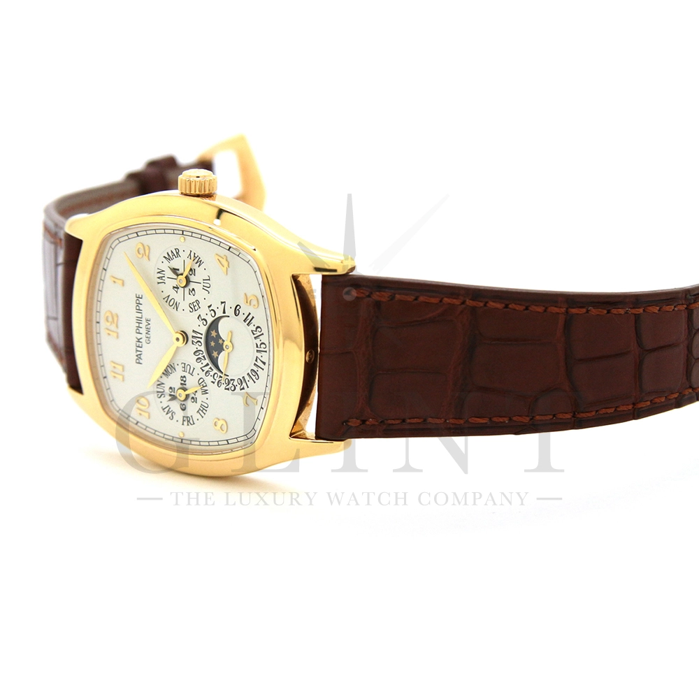 パテックフィリップ グランドコンプリケーション パーペチュアルカレンダー Ref.5940J-001です。その名の通り、日付の調整が不要で閏年まで計算してくれる複雑機構の一つ。ケース素材にはイエローゴールドを使用しており、華やか高級感を与えてくれる仕上がりに。文字盤にはパーペチュアルカレンダー、ムーンフェイズと3つのインダイヤルがレイアウトされております。これだけの機能を搭載した自動巻きモデルにも関わらず、超薄のケース厚を実現できるのもパテックフィリップだからこそ成せる業。伝統的に脈々と受け継がれてきたパテックフィリップのパーペチュアルカレンダーモデルは、いつの時代も色褪せることが無い魅力が備わった最高級の一本です。