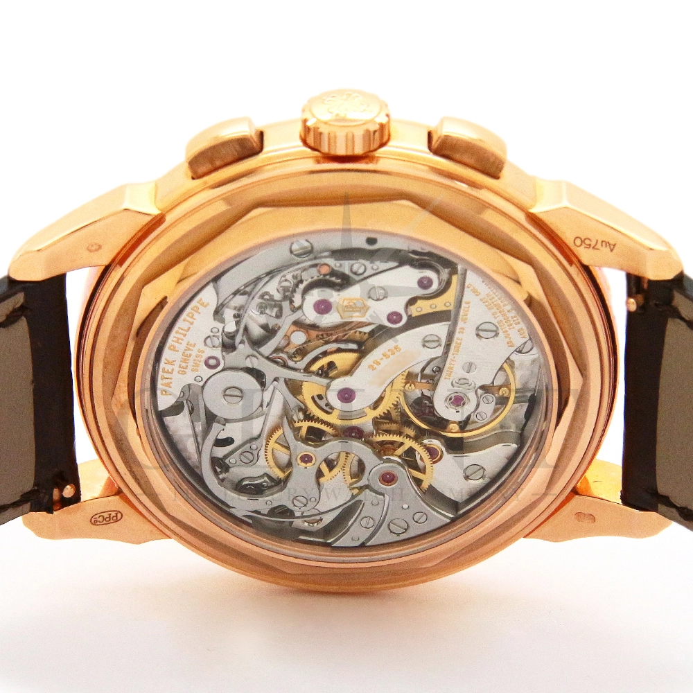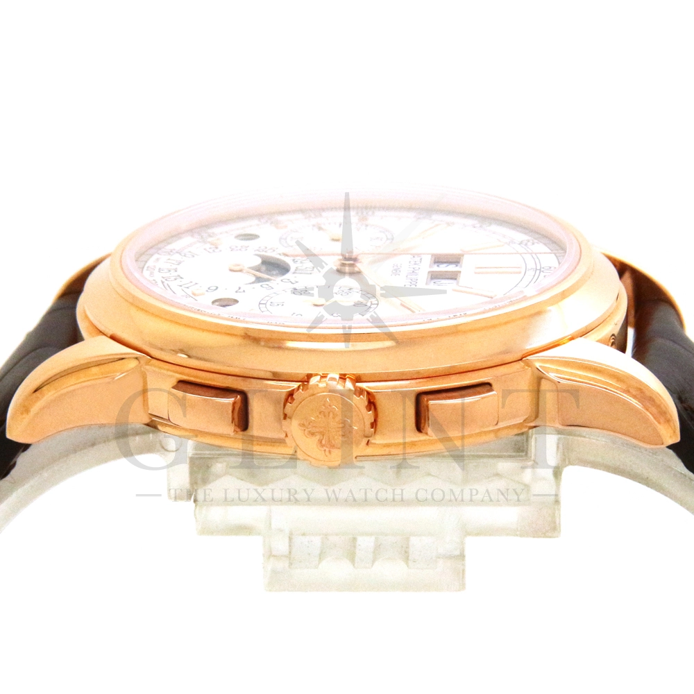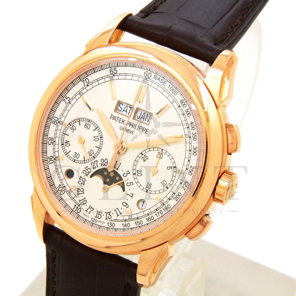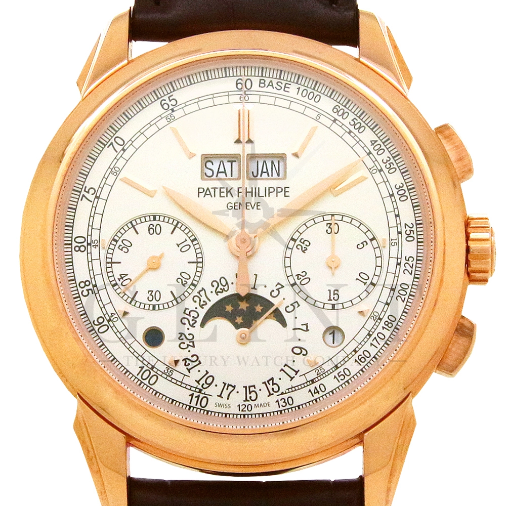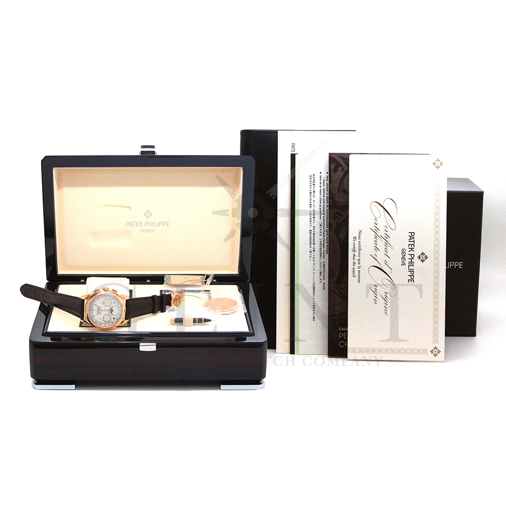パテックフィリップ グランドコンプリケーション パーペチュアルカレンダー Ref.5270R-001です。その名の通り、日付の調整が不要で閏年まで計算してくれる複雑機構の一つ。ケース素材にはローズゴールドを使用しており、上質な高級感を与えてくれる仕上がりに。オパーリン・シルバーカラーの文字盤には、クロノグラフ、パーペチュアルカレンダー、ムーンフェイズと3つのインダイヤルがレイアウトされ、8時位置の窓には昼夜表示、4時位置の窓には閏年のサイクルが表示されております。こちらのモデルにはパテックフィリップ初の完全自社設計製造の開発手巻きクロノグラフCal.CH29-535が搭載されており、美しいムーブメントの動きをシースルーバックから存分にご堪能できるでしょう。伝統的に脈々と受け継がれてきたパテックフィリップのパーペチュアルカレンダーモデルは、いつの時代も色褪せることが無い魅力が備わった最高級の一本です。