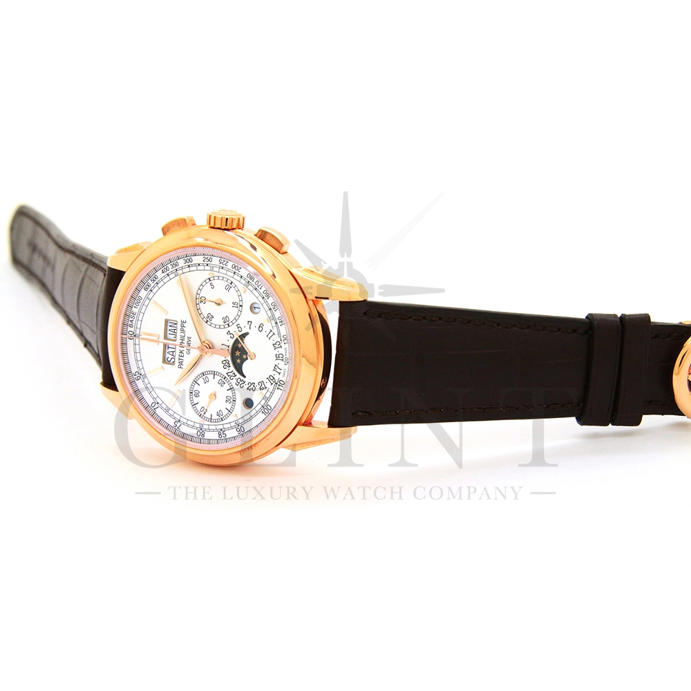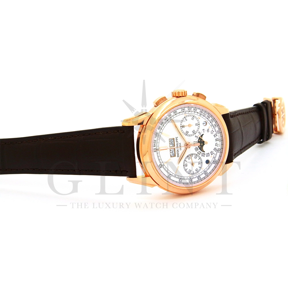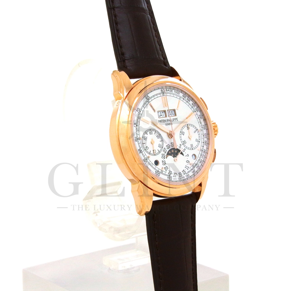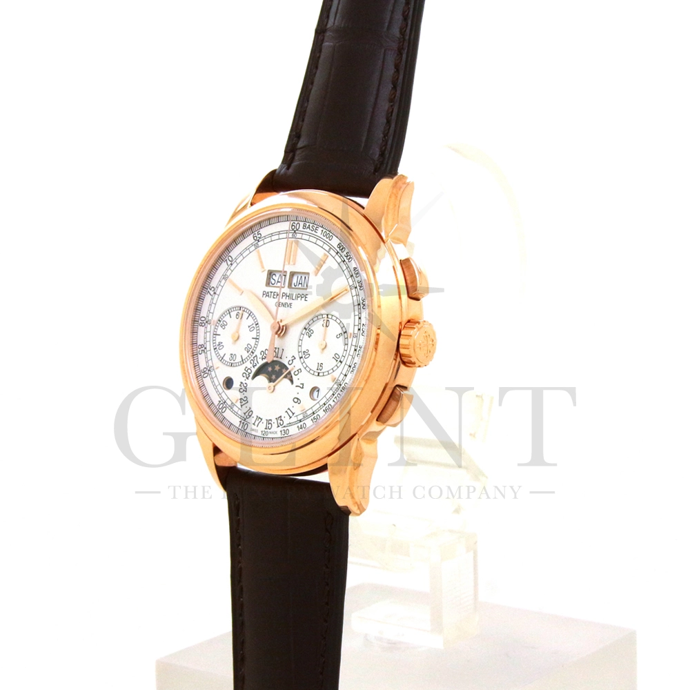 パテックフィリップ グランドコンプリケーション パーペチュアルカレンダー Ref.5270R-001です。その名の通り、日付の調整が不要で閏年まで計算してくれる複雑機構の一つ。ケース素材にはローズゴールドを使用しており、上質な高級感を与えてくれる仕上がりに。オパーリン・シルバーカラーの文字盤には、クロノグラフ、パーペチュアルカレンダー、ムーンフェイズと3つのインダイヤルがレイアウトされ、8時位置の窓には昼夜表示、4時位置の窓には閏年のサイクルが表示されております。こちらのモデルにはパテックフィリップ初の完全自社設計製造の開発手巻きクロノグラフCal.CH29-535が搭載されており、美しいムーブメントの動きをシースルーバックから存分にご堪能できるでしょう。伝統的に脈々と受け継がれてきたパテックフィリップのパーペチュアルカレンダーモデルは、いつの時代も色褪せることが無い魅力が備わった最高級の一本です。