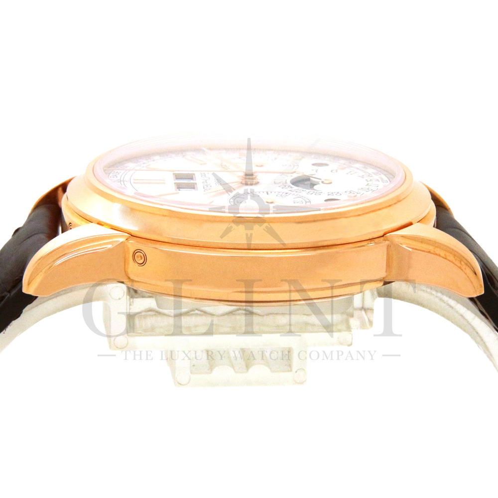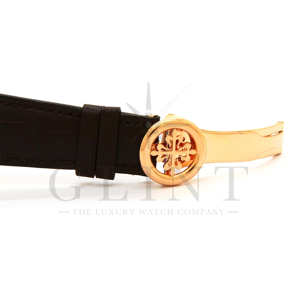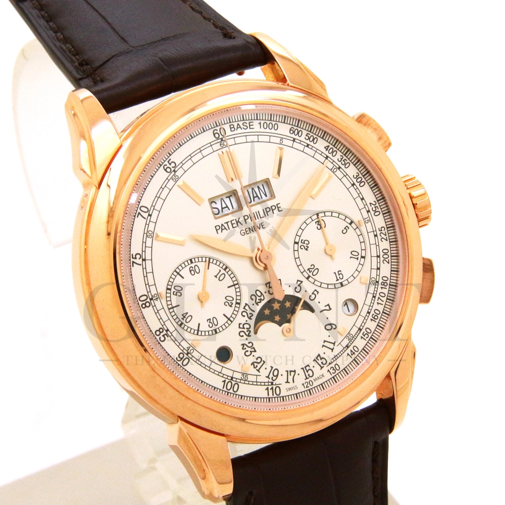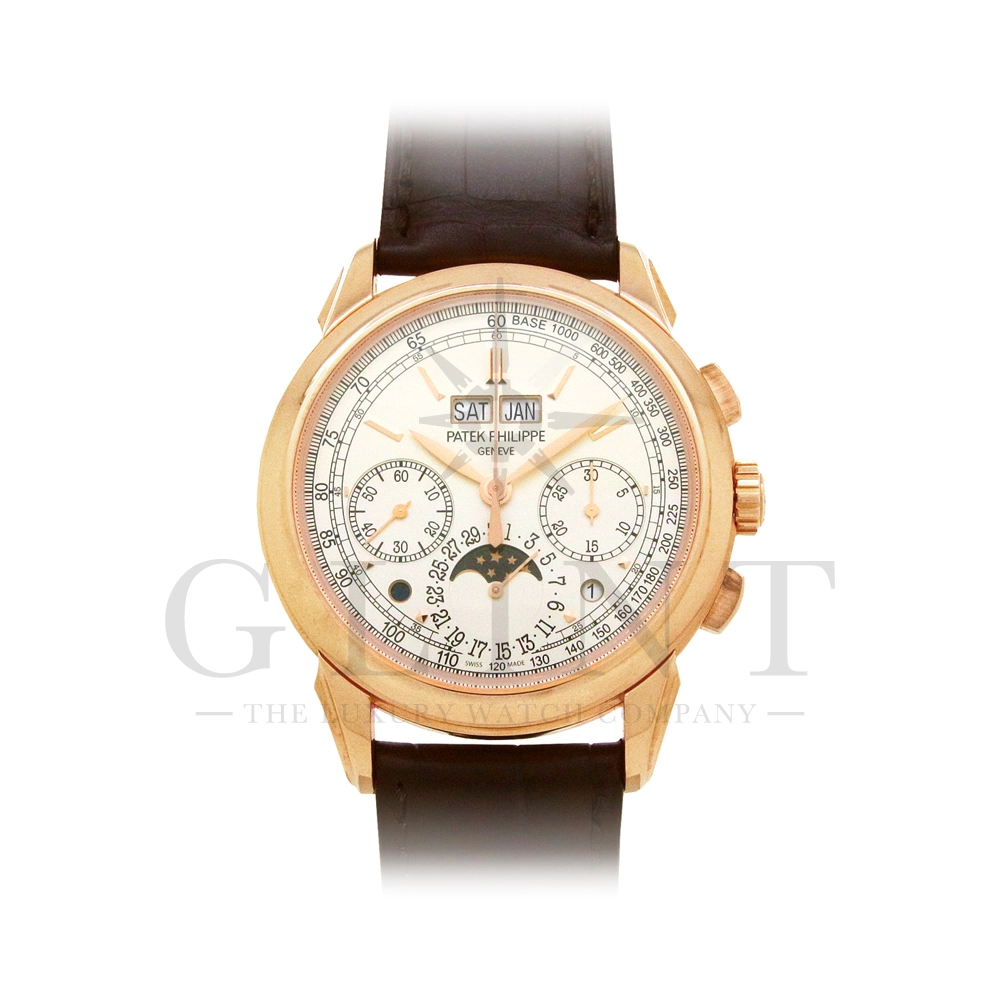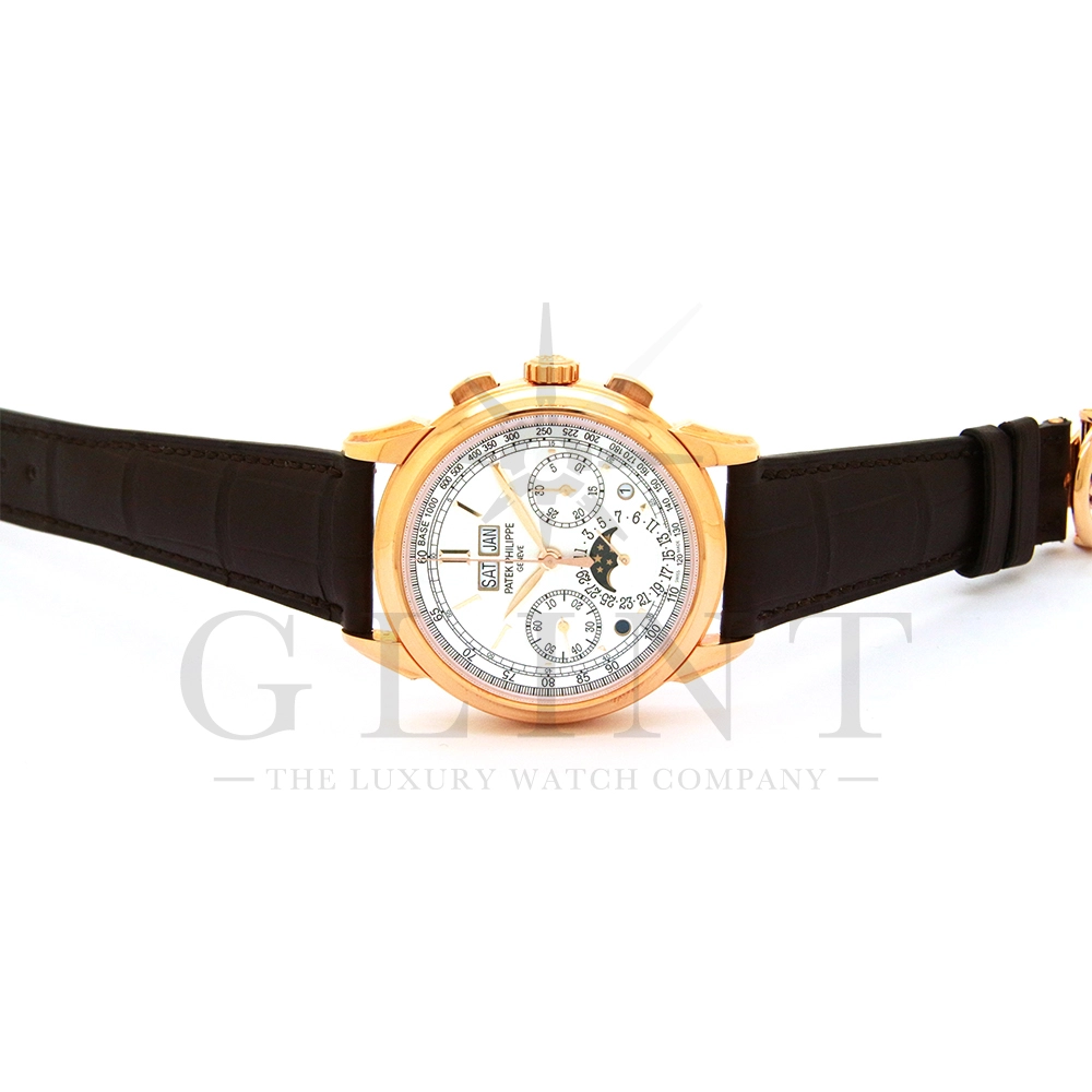 パテックフィリップ グランドコンプリケーション パーペチュアルカレンダー Ref.5270R-001です。その名の通り、日付の調整が不要で閏年まで計算してくれる複雑機構の一つ。ケース素材にはローズゴールドを使用しており、上質な高級感を与えてくれる仕上がりに。オパーリン・シルバーカラーの文字盤には、クロノグラフ、パーペチュアルカレンダー、ムーンフェイズと3つのインダイヤルがレイアウトされ、8時位置の窓には昼夜表示、4時位置の窓には閏年のサイクルが表示されております。こちらのモデルにはパテックフィリップ初の完全自社設計製造の開発手巻きクロノグラフCal.CH29-535が搭載されており、美しいムーブメントの動きをシースルーバックから存分にご堪能できるでしょう。伝統的に脈々と受け継がれてきたパテックフィリップのパーペチュアルカレンダーモデルは、いつの時代も色褪せることが無い魅力が備わった最高級の一本です。