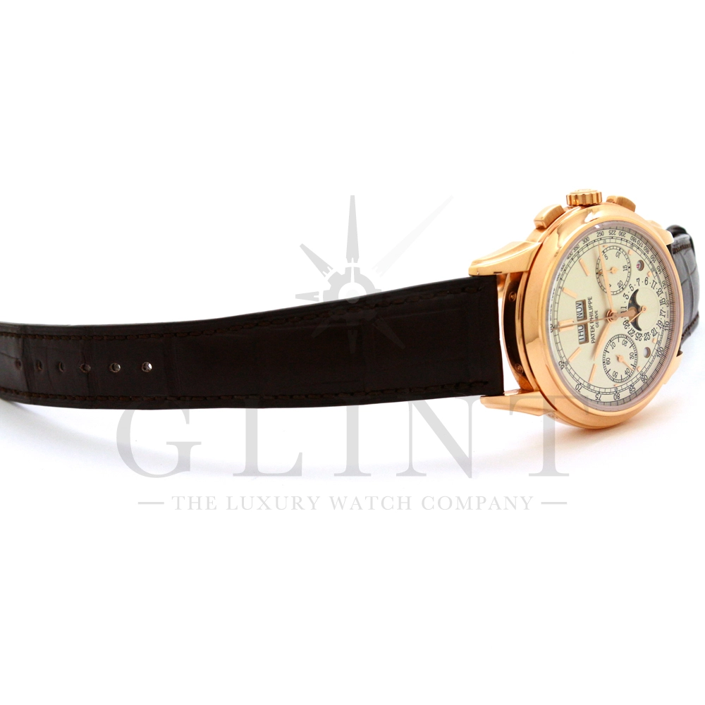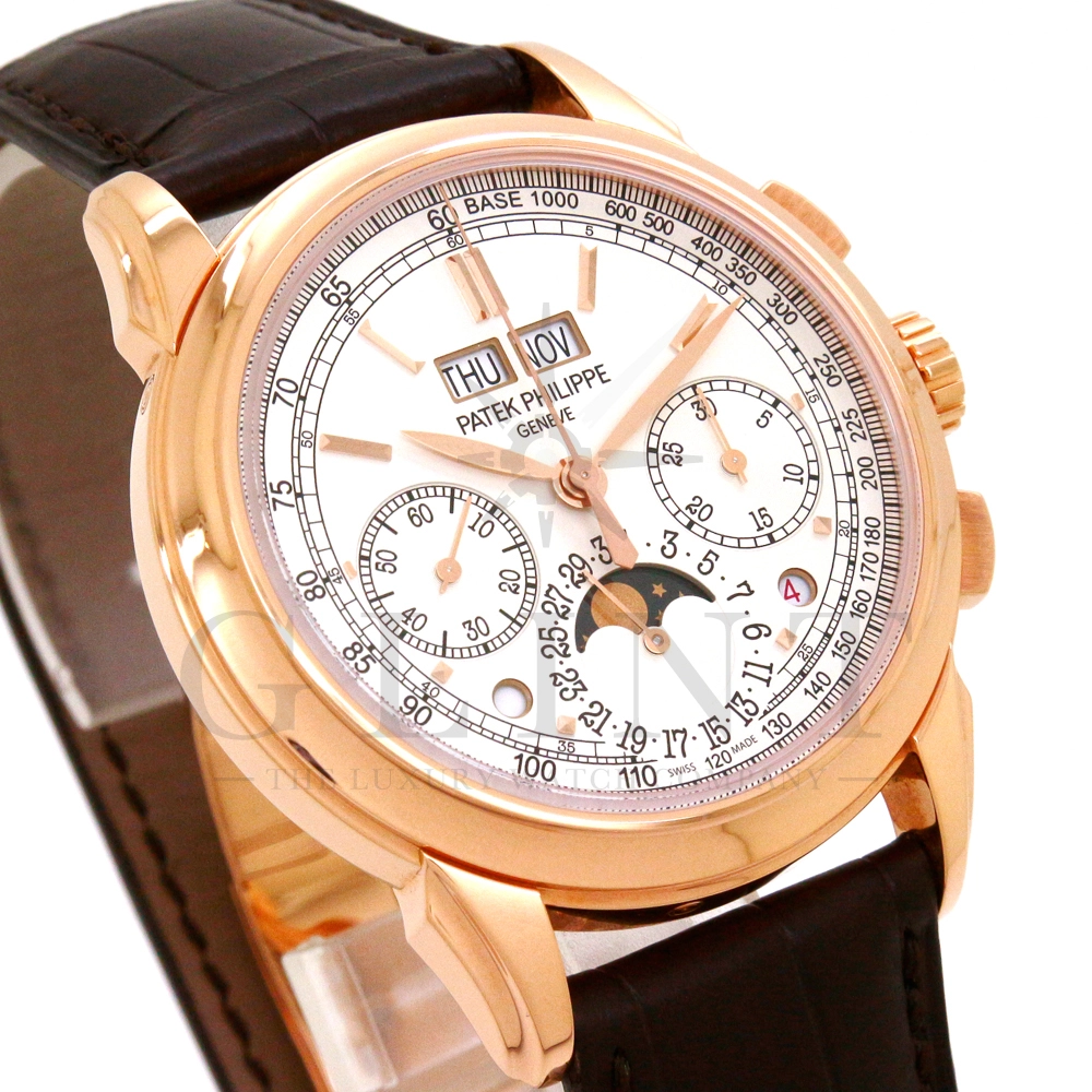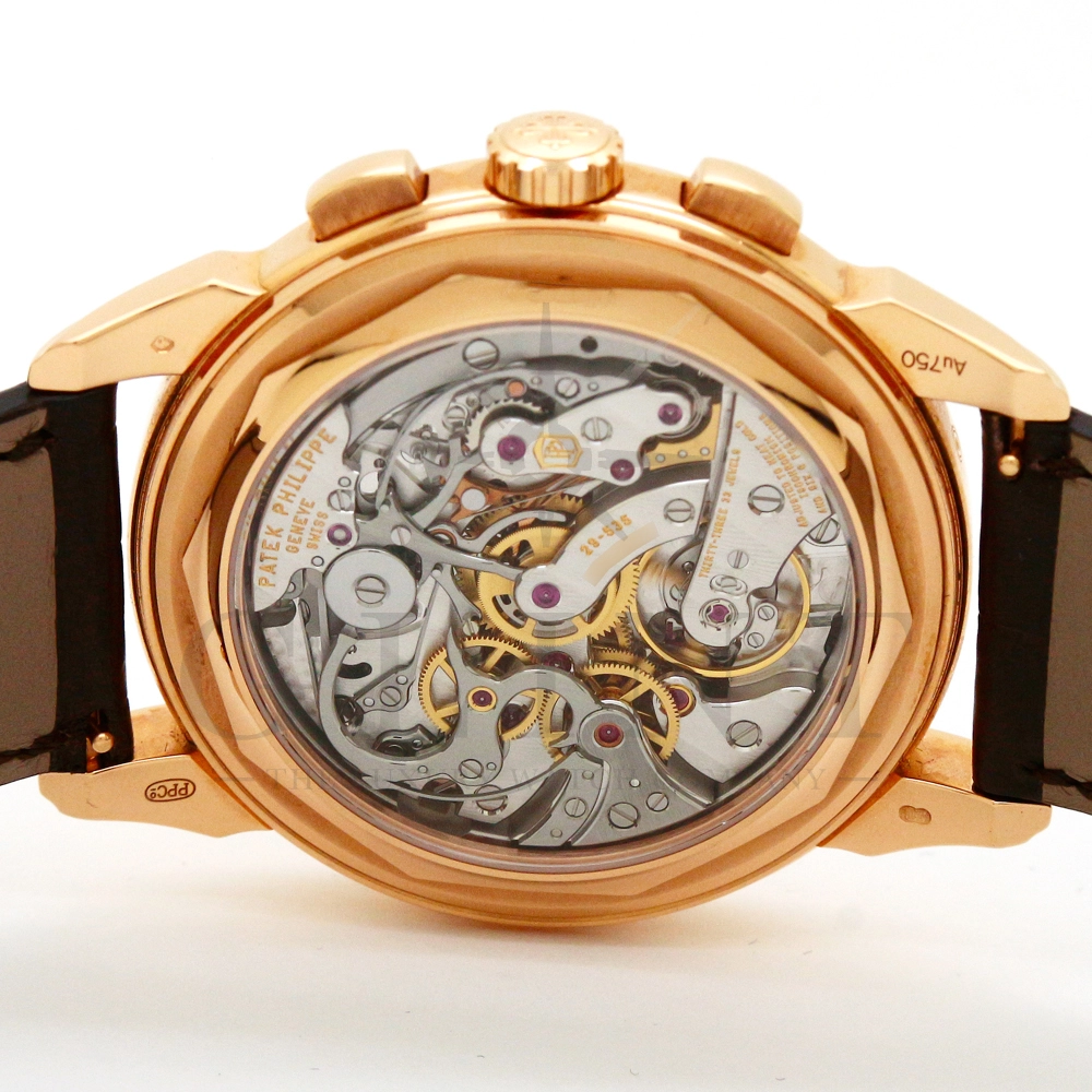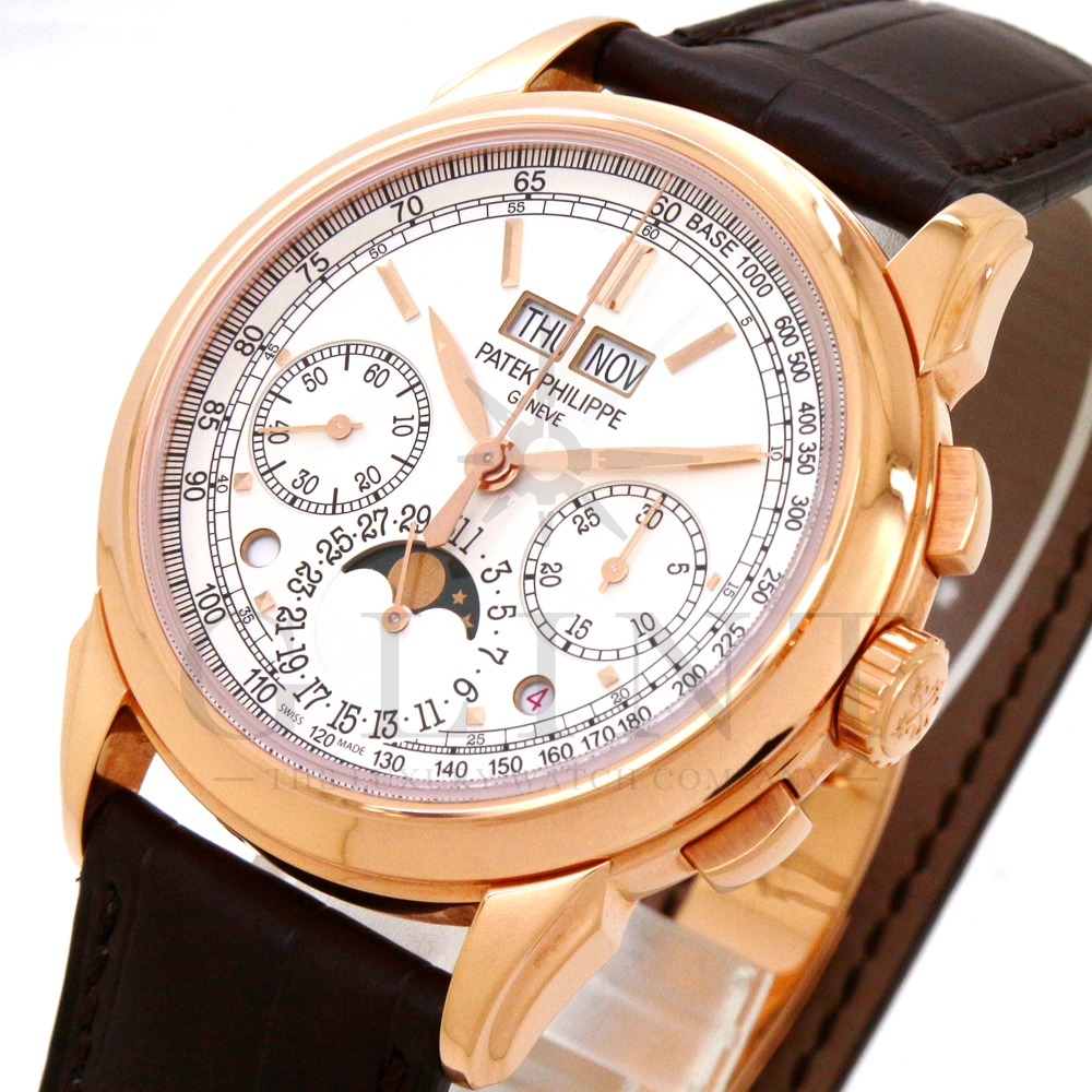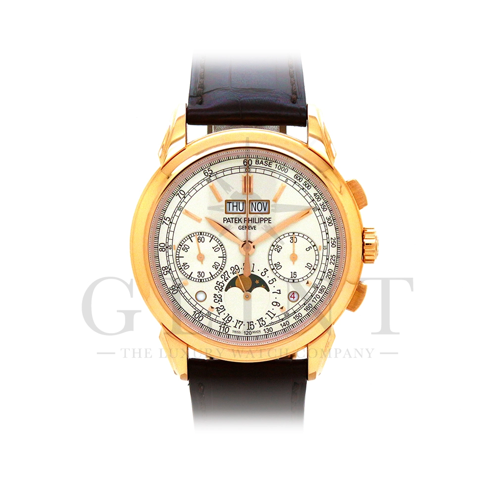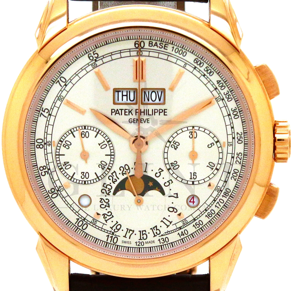パテックフィリップ グランドコンプリケーション パーペチュアルカレンダー Ref.5270R-001です。その名の通り、日付の調整が不要で閏年まで計算してくれる複雑機構の一つ。ケース素材にはローズゴールドを使用しており、上質な高級感を与えてくれる仕上がりに。オパーリン・シルバーカラーの文字盤には、クロノグラフ、パーペチュアルカレンダー、ムーンフェイズと3つのインダイヤルがレイアウトされ、8時位置の窓には昼夜表示、4時位置の窓には閏年のサイクルが表示されております。こちらのモデルにはパテックフィリップ初の完全自社設計製造の開発手巻きクロノグラフCal.CH29-535が搭載されており、美しいムーブメントの動きをシースルーバックから存分にご堪能できるでしょう。伝統的に脈々と受け継がれてきたパテックフィリップのパーペチュアルカレンダーモデルは、いつの時代も色褪せることが無い魅力が備わった最高級の一本です。