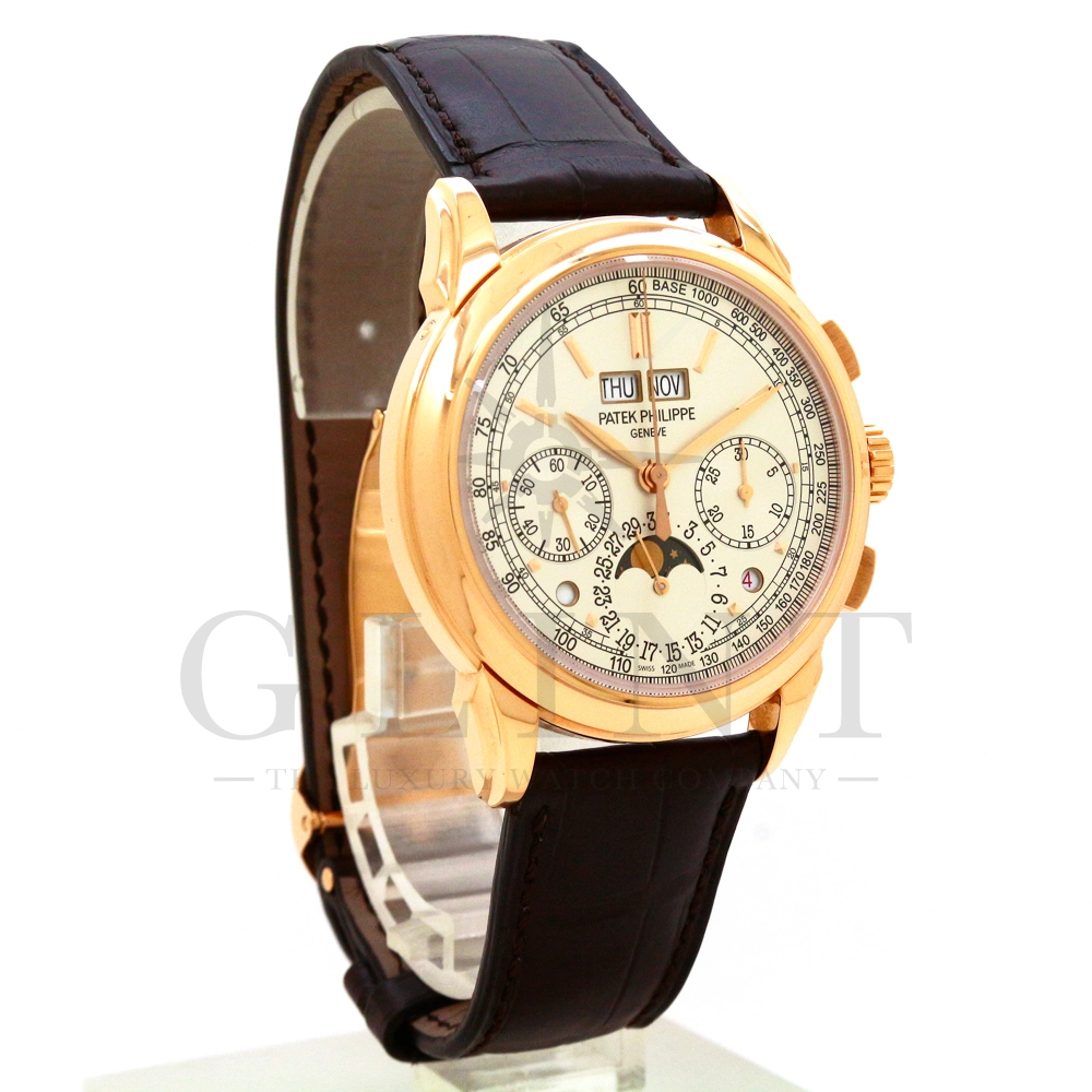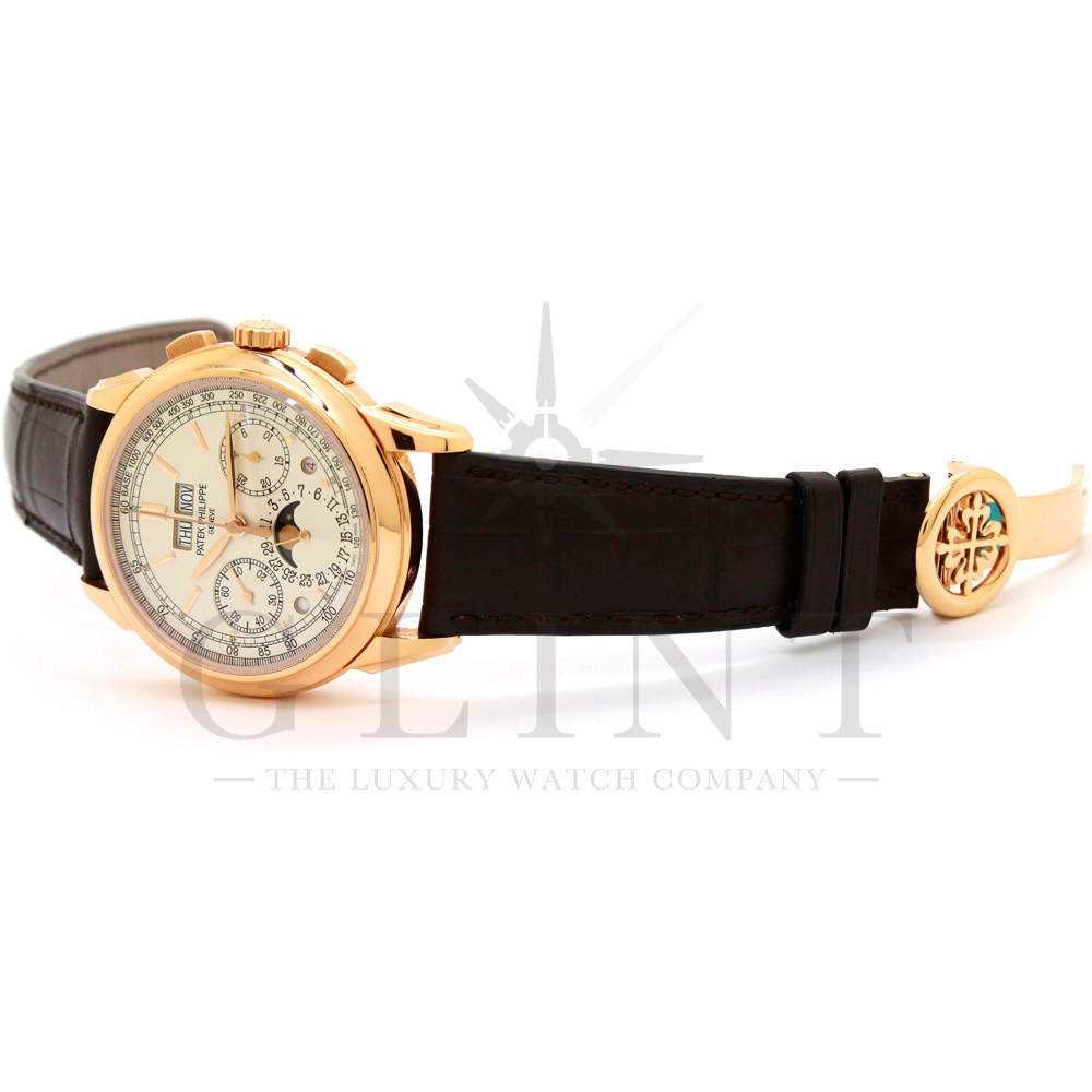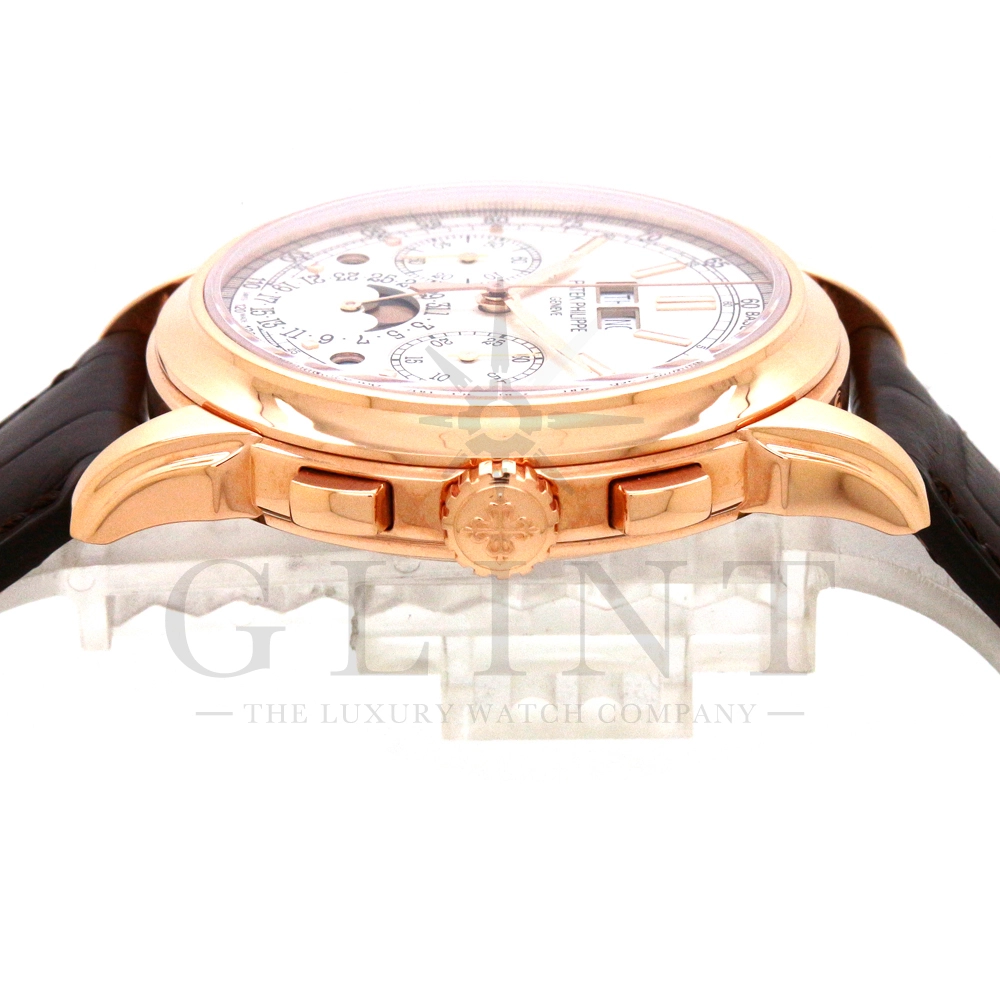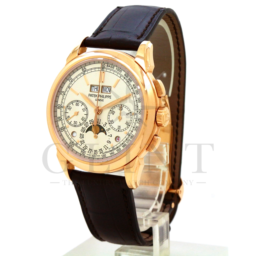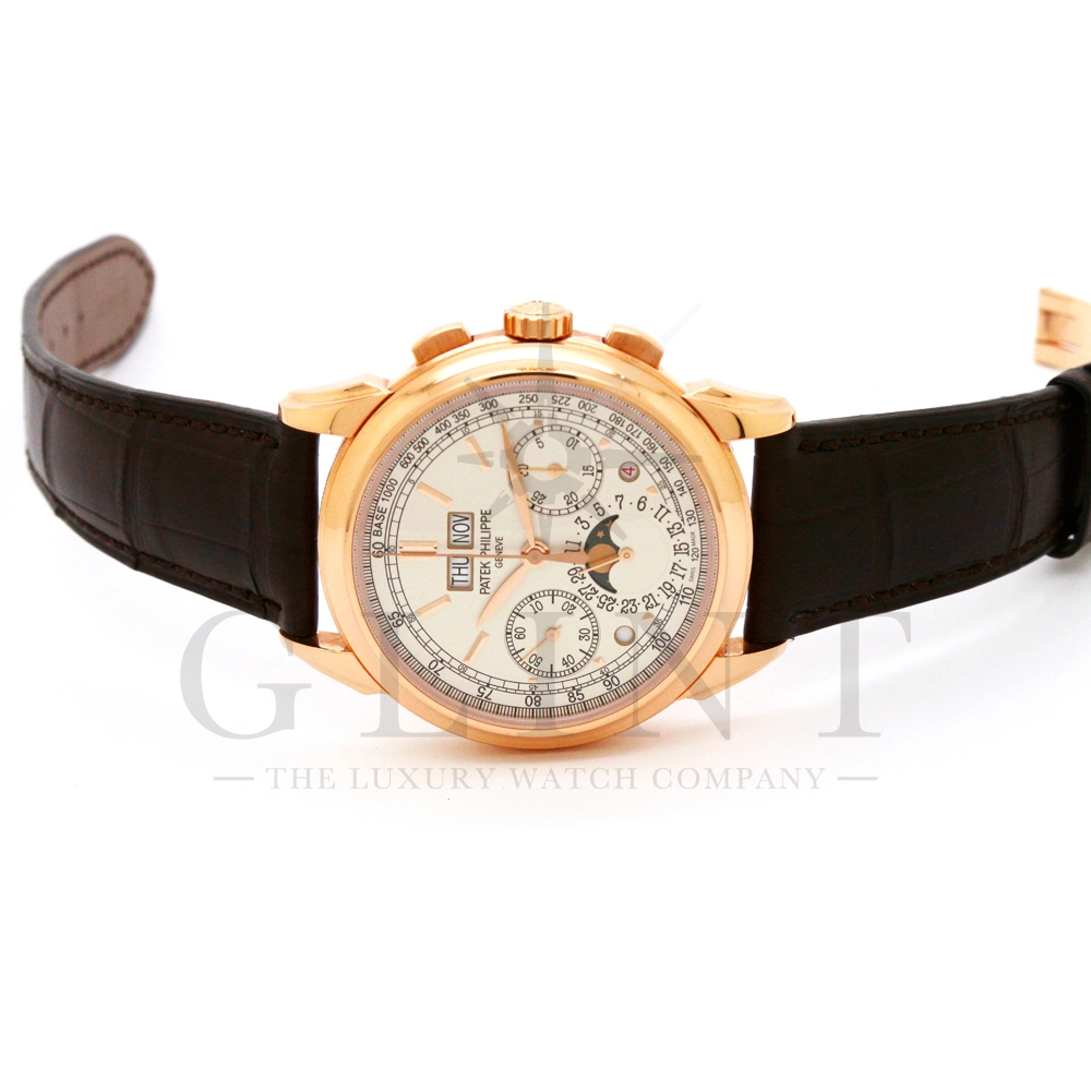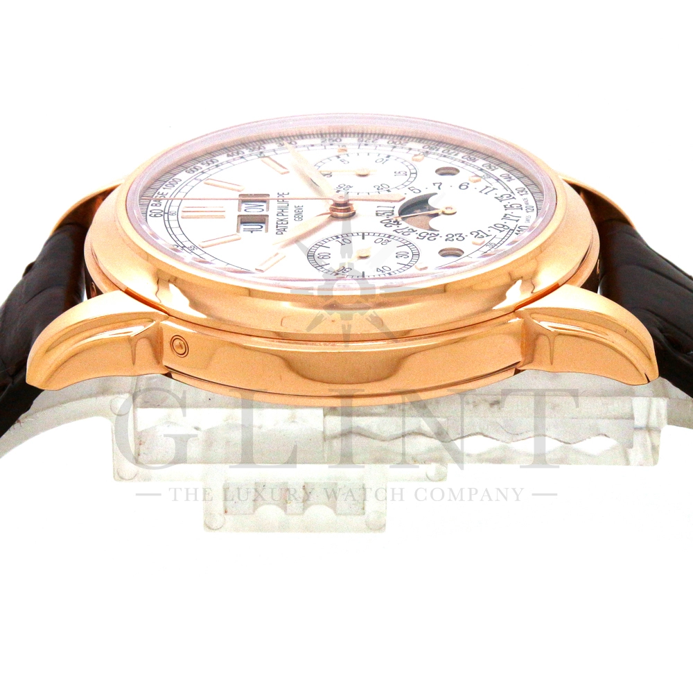 パテックフィリップ グランドコンプリケーション パーペチュアルカレンダー Ref.5270R-001です。その名の通り、日付の調整が不要で閏年まで計算してくれる複雑機構の一つ。ケース素材にはローズゴールドを使用しており、上質な高級感を与えてくれる仕上がりに。オパーリン・シルバーカラーの文字盤には、クロノグラフ、パーペチュアルカレンダー、ムーンフェイズと3つのインダイヤルがレイアウトされ、8時位置の窓には昼夜表示、4時位置の窓には閏年のサイクルが表示されております。こちらのモデルにはパテックフィリップ初の完全自社設計製造の開発手巻きクロノグラフCal.CH29-535が搭載されており、美しいムーブメントの動きをシースルーバックから存分にご堪能できるでしょう。伝統的に脈々と受け継がれてきたパテックフィリップのパーペチュアルカレンダーモデルは、いつの時代も色褪せることが無い魅力が備わった最高級の一本です。