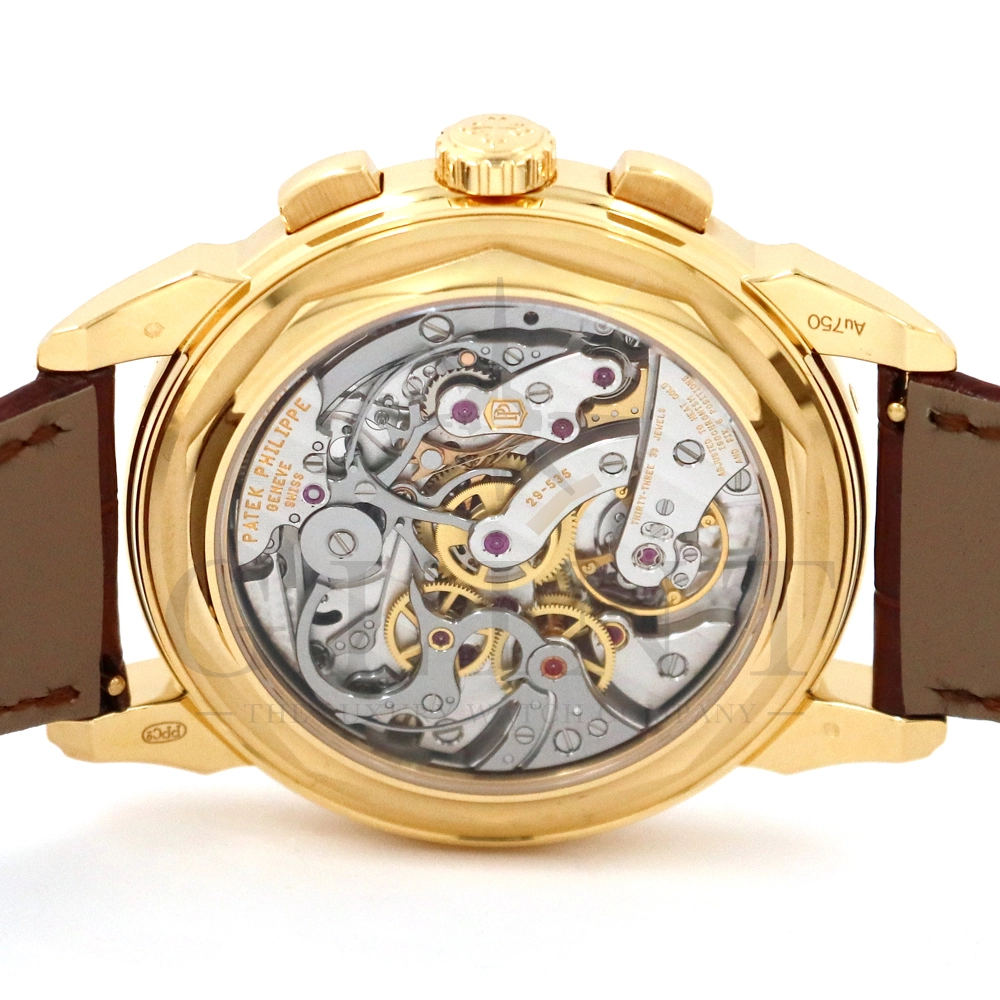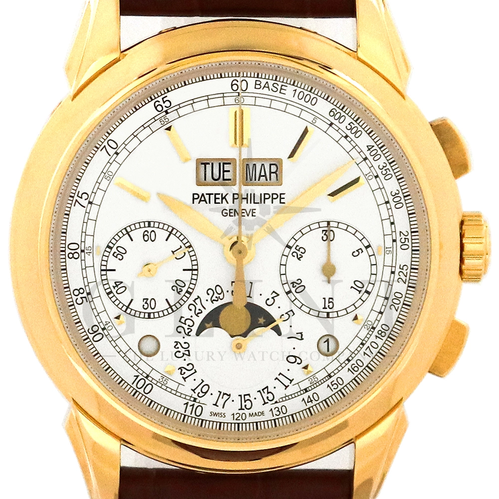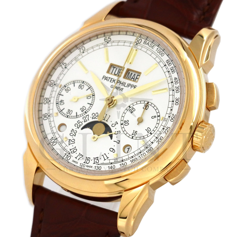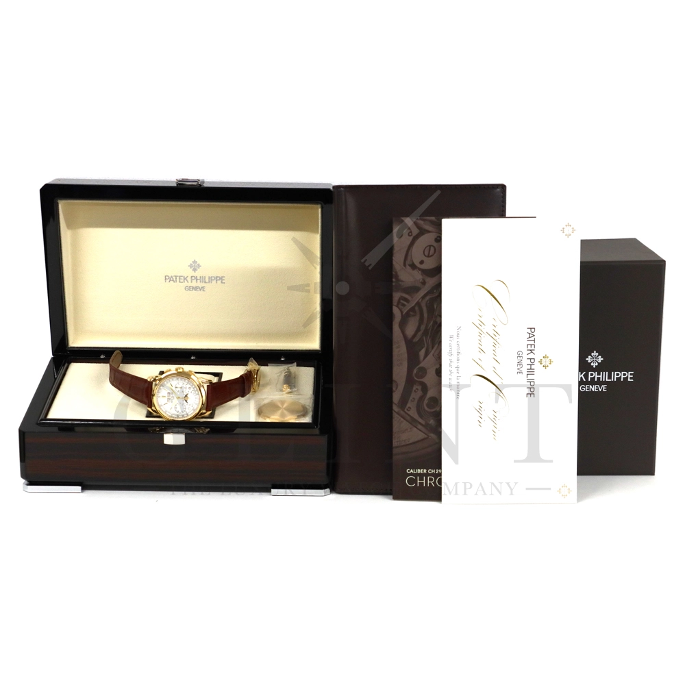 パテックフィリップ グランドコンプリケーション パーペチュアルカレンダー5270J-001です。その名の通り、日付の調整が不要で閏年まで計算してくれる複雑機構の一つ。Ref.5270では、ケース素材に初のイエローゴールドを採用しており、華やかな高級感を与えてくれる仕上がりに。卓越した視認性を誇るシルバー・オパーリン文字盤には、クロノグラフ、パーペチュアルカレンダー、ムーンフェイズと3つのインダイヤルがレイアウトされ、8時位置の窓には昼夜表示、4時位置の窓には閏年のサイクルが表示されております。こちらのモデルにはパテックフィリップ初の完全自社設計製造の開発手巻きクロノグラフCal.CH29-535が搭載されており、美しいムーブメントの動きをシースルーバックから存分にご堪能できるでしょう。伝統的に脈々と受け継がれてきたパテックフィリップのパーペチュアルカレンダーモデルは、いつの時代も色褪せることが無い魅力が備わった最高級の一本です。