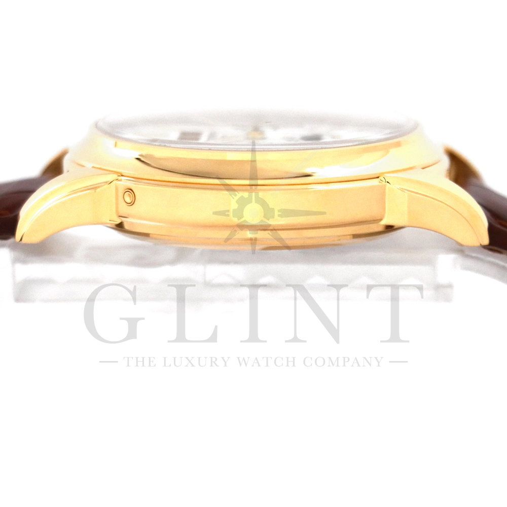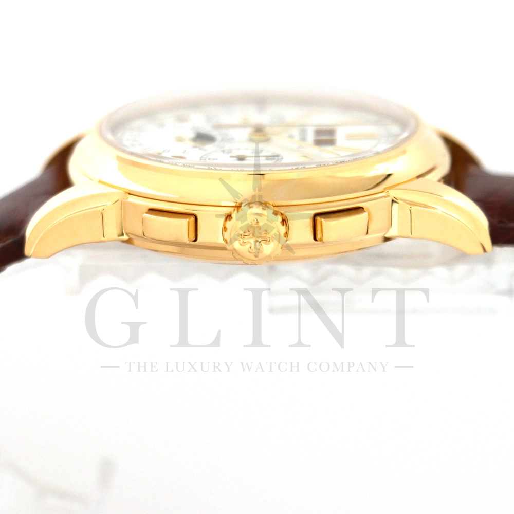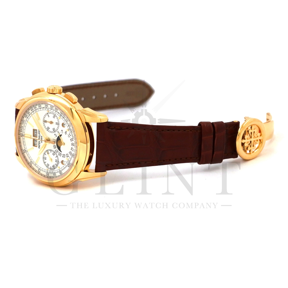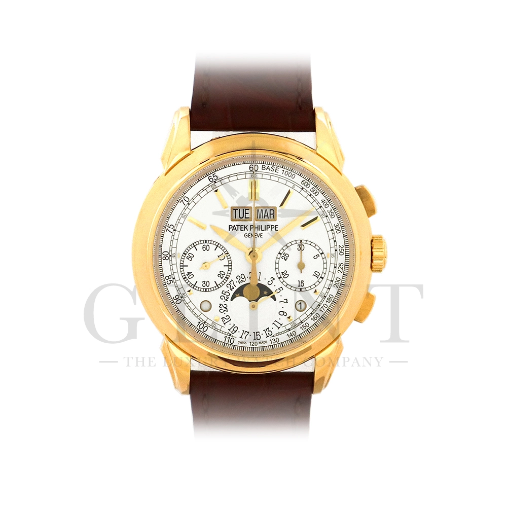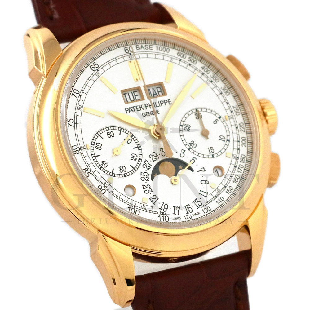 パテックフィリップ グランドコンプリケーション パーペチュアルカレンダー5270J-001です。その名の通り、日付の調整が不要で閏年まで計算してくれる複雑機構の一つ。Ref.5270では、ケース素材に初のイエローゴールドを採用しており、華やかな高級感を与えてくれる仕上がりに。卓越した視認性を誇るシルバー・オパーリン文字盤には、クロノグラフ、パーペチュアルカレンダー、ムーンフェイズと3つのインダイヤルがレイアウトされ、8時位置の窓には昼夜表示、4時位置の窓には閏年のサイクルが表示されております。こちらのモデルにはパテックフィリップ初の完全自社設計製造の開発手巻きクロノグラフCal.CH29-535が搭載されており、美しいムーブメントの動きをシースルーバックから存分にご堪能できるでしょう。伝統的に脈々と受け継がれてきたパテックフィリップのパーペチュアルカレンダーモデルは、いつの時代も色褪せることが無い魅力が備わった最高級の一本です。