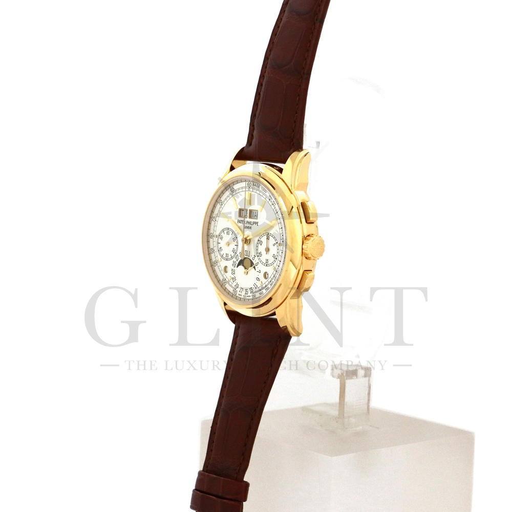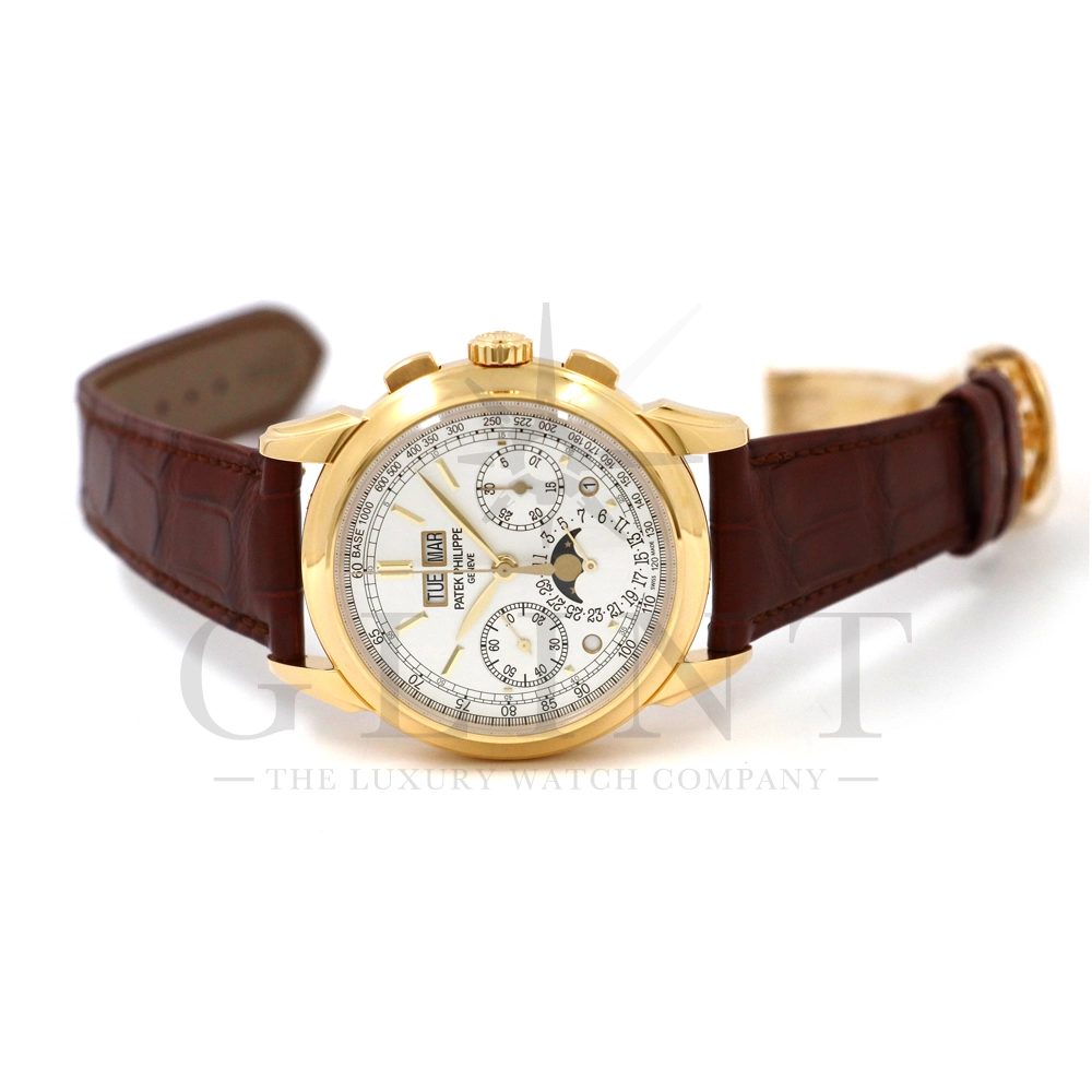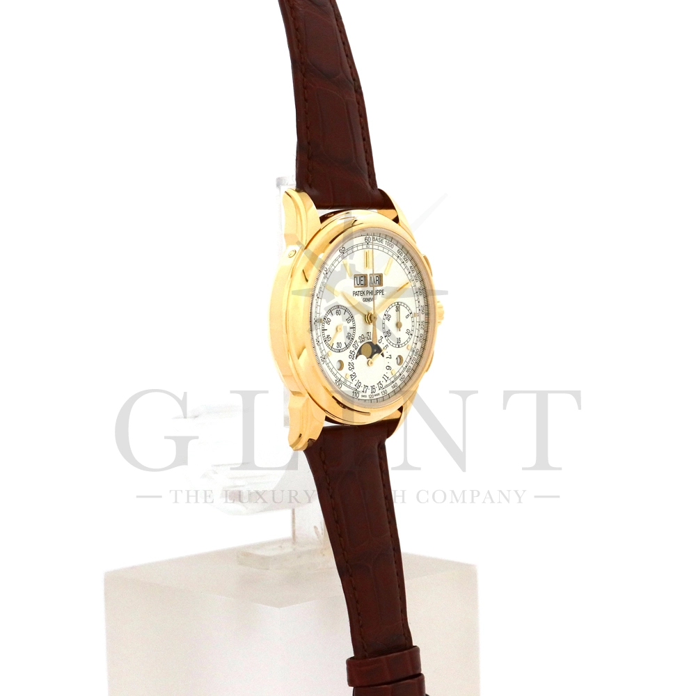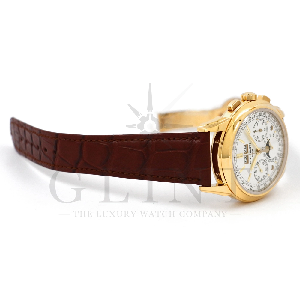 パテックフィリップ グランドコンプリケーション パーペチュアルカレンダー5270J-001です。その名の通り、日付の調整が不要で閏年まで計算してくれる複雑機構の一つ。Ref.5270では、ケース素材に初のイエローゴールドを採用しており、華やかな高級感を与えてくれる仕上がりに。卓越した視認性を誇るシルバー・オパーリン文字盤には、クロノグラフ、パーペチュアルカレンダー、ムーンフェイズと3つのインダイヤルがレイアウトされ、8時位置の窓には昼夜表示、4時位置の窓には閏年のサイクルが表示されております。こちらのモデルにはパテックフィリップ初の完全自社設計製造の開発手巻きクロノグラフCal.CH29-535が搭載されており、美しいムーブメントの動きをシースルーバックから存分にご堪能できるでしょう。伝統的に脈々と受け継がれてきたパテックフィリップのパーペチュアルカレンダーモデルは、いつの時代も色褪せることが無い魅力が備わった最高級の一本です。