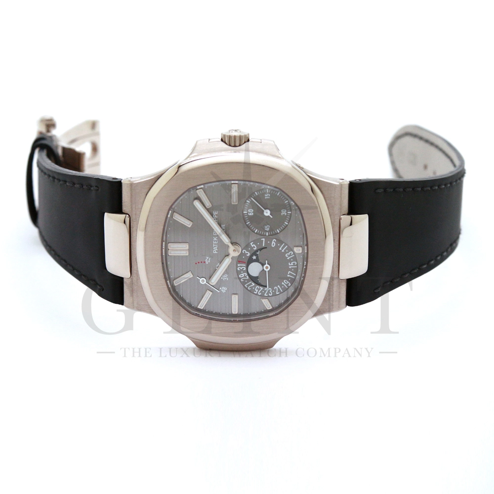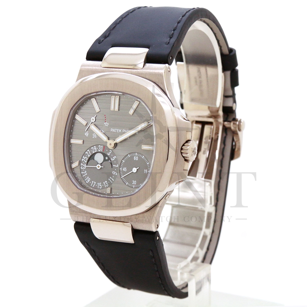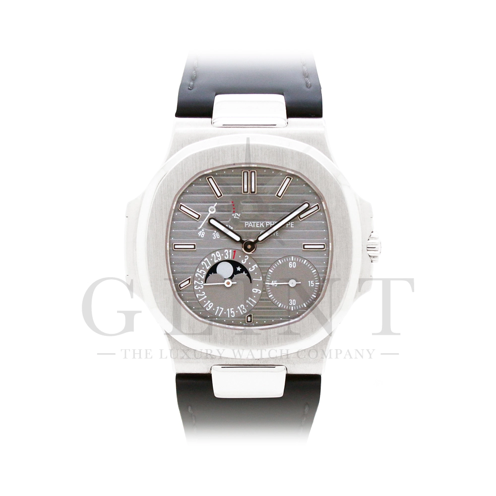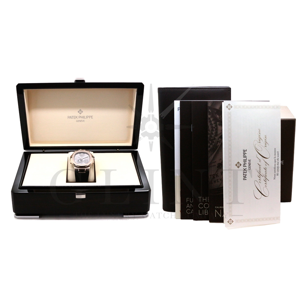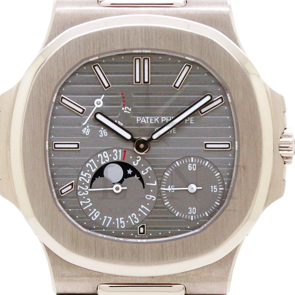 こちらのRef.5712Gはノーチラスが誕生して30周年を迎えた2006年に新たなラインナップとして発表されたコレクションの中でも高い人気を誇るモデルで、ポインターデイト、ムーンフェイズ、パワーリザーブなど様々な機能を搭載したプチコンプリケーションが魅力の一つです。多機能ながらこれほどまでの薄型を実現する事が出来るのも世界最高水準の時計技術を誇るパテックフィリップだからこそ。そしてケースにはホワイトゴールドを採用し、エレガンスな印象をより一層強調してくれます。更にはノーチラスシリーズでは初となる革ベルトを採用しており、スポーツモデルながらもフォーマルな印象も与え、ステータス性の高い洗練された大人の雰囲気を演出してくれる魅力的な逸品です。