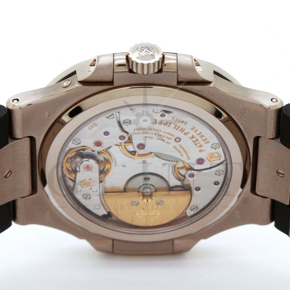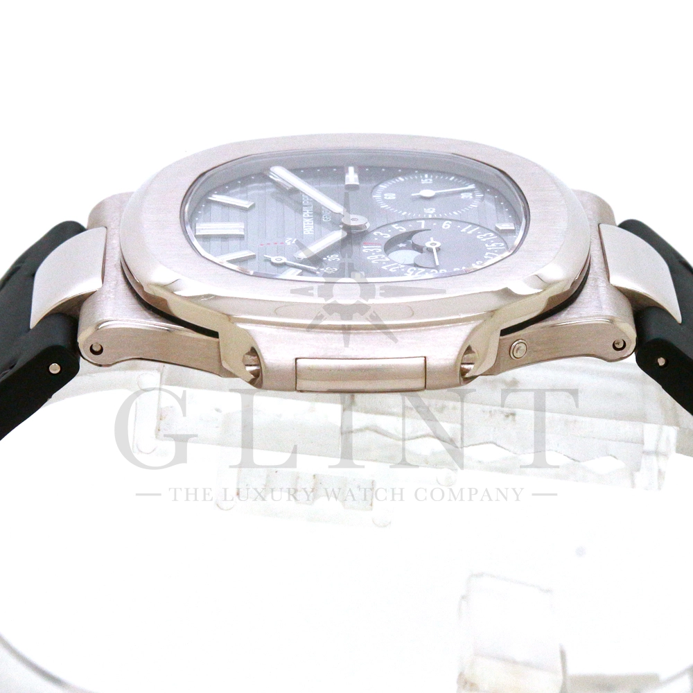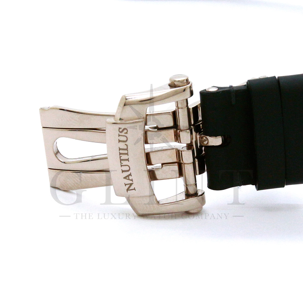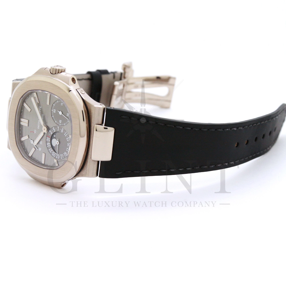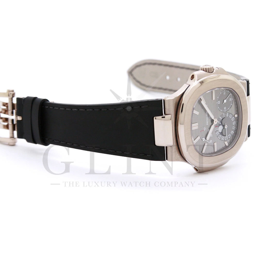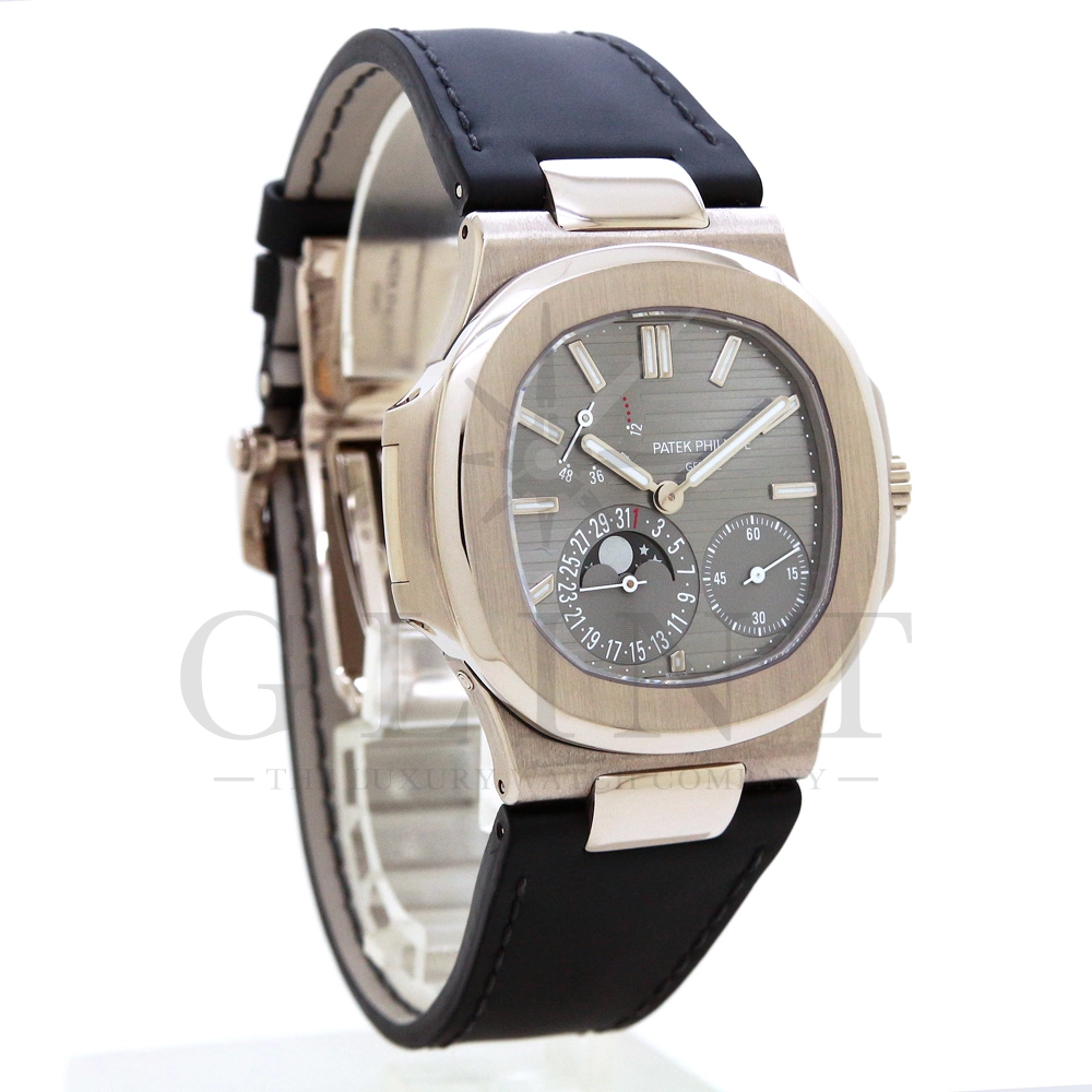 こちらのRef.5712Gはノーチラスが誕生して30周年を迎えた2006年に新たなラインナップとして発表されたコレクションの中でも高い人気を誇るモデルで、ポインターデイト、ムーンフェイズ、パワーリザーブなど様々な機能を搭載したプチコンプリケーションが魅力の一つです。多機能ながらこれほどまでの薄型を実現する事が出来るのも世界最高水準の時計技術を誇るパテックフィリップだからこそ。そしてケースにはホワイトゴールドを採用し、エレガンスな印象をより一層強調してくれます。更にはノーチラスシリーズでは初となる革ベルトを採用しており、スポーツモデルながらもフォーマルな印象も与え、ステータス性の高い洗練された大人の雰囲気を演出してくれる魅力的な逸品です。