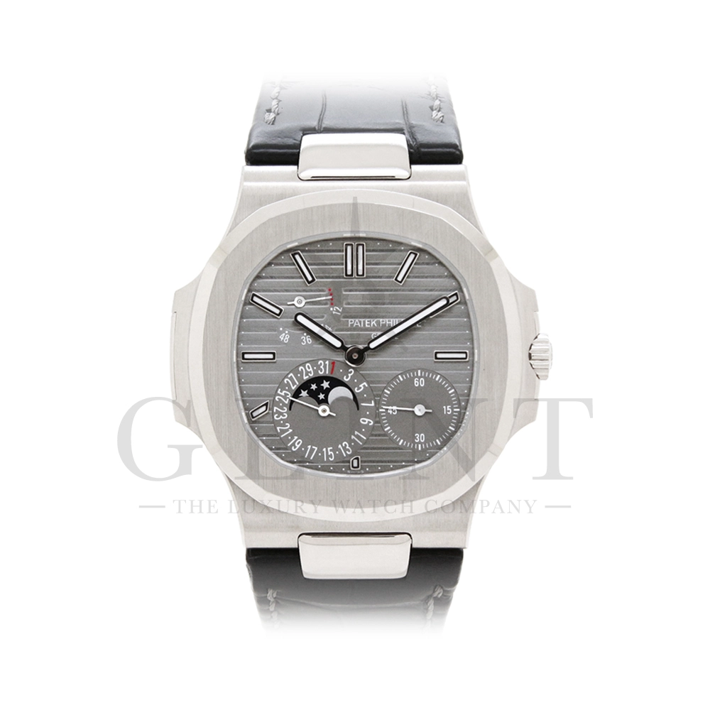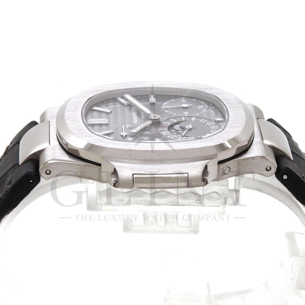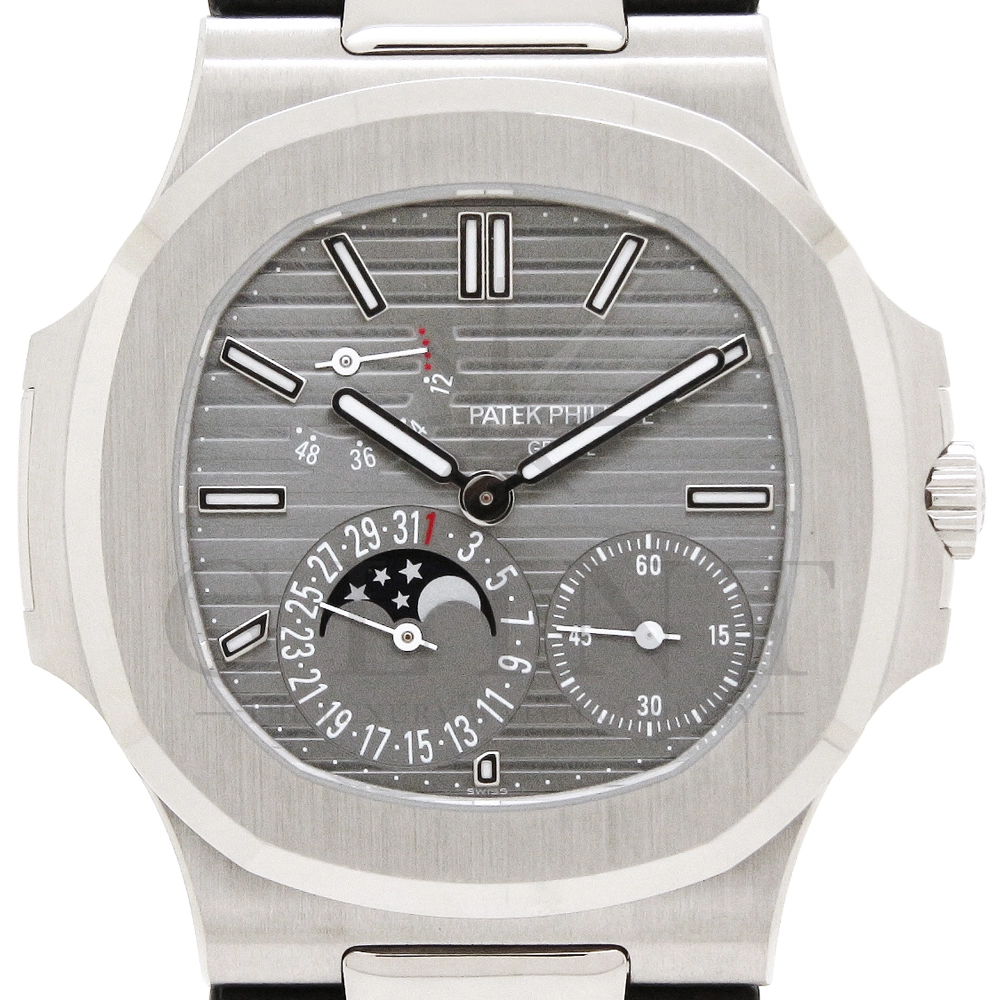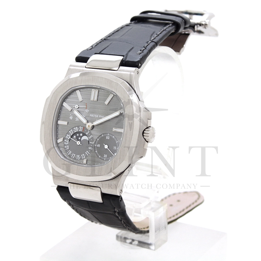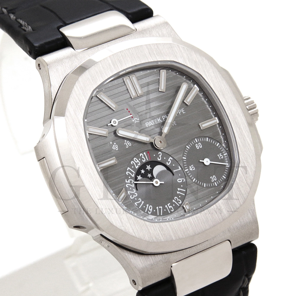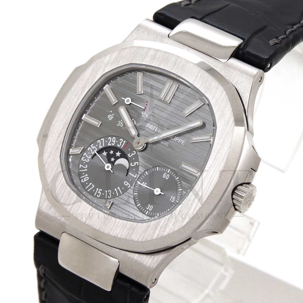 こちらのRef.5712Gはノーチラスが誕生して30周年を迎えた2006年に新たなラインナップとして発表されたコレクションの中でも高い人気を誇るモデルで、ポインターデイト、ムーンフェイズ、パワーリザーブなど様々な機能を搭載したプチコンプリケーションが魅力の一つです。多機能ながらこれほどまでの薄型を実現する事が出来るのも世界最高水準の時計技術を誇るパテックフィリップだからこそ。そしてケースにはホワイトゴールドを採用し、エレガンスな印象をより一層強調してくれます。更にはノーチラスシリーズでは初となる革ベルトを採用しており、スポーツモデルながらもフォーマルな印象も与え、ステータス性の高い洗練された大人の雰囲気を演出してくれる魅力的な逸品です。