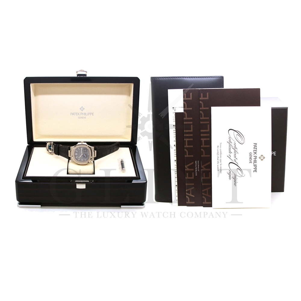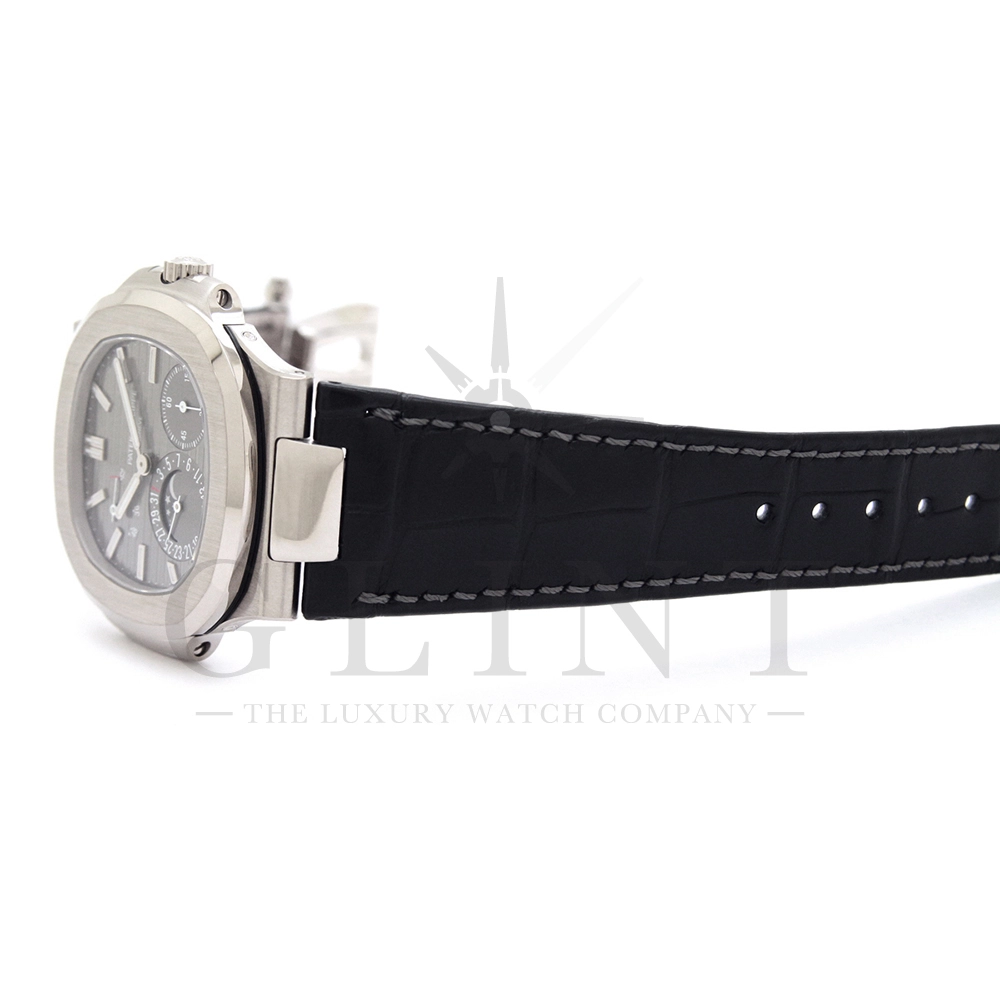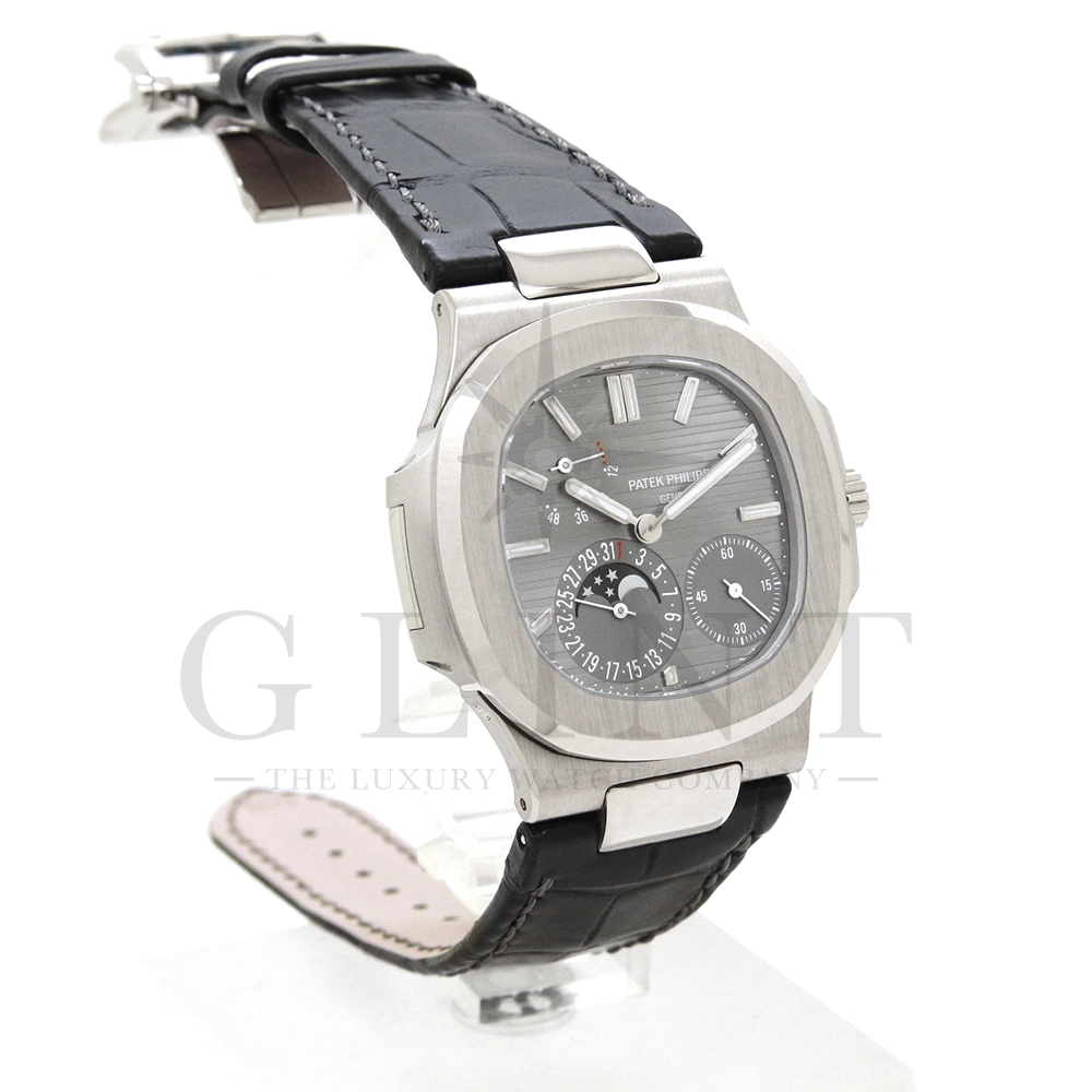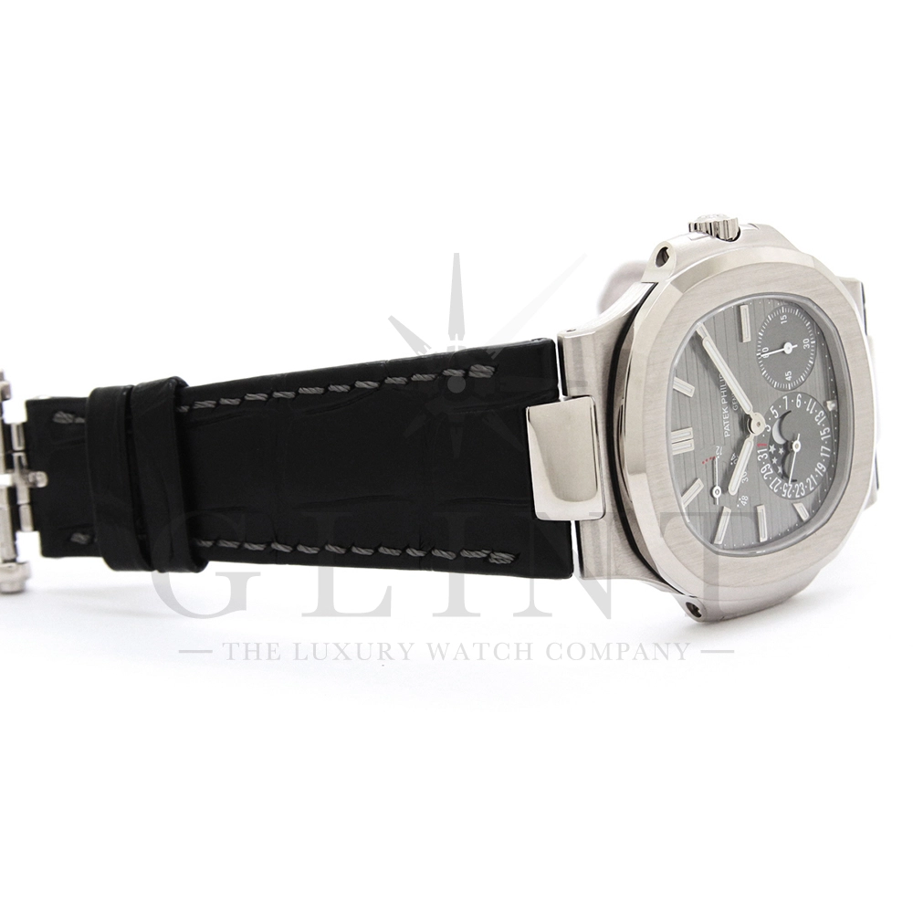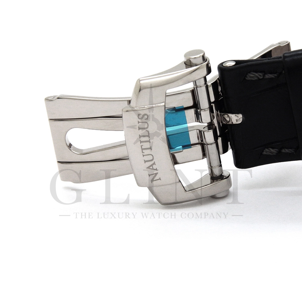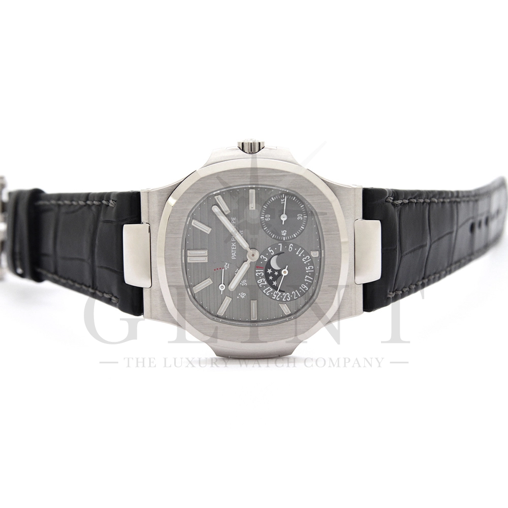 こちらのRef.5712Gはノーチラスが誕生して30周年を迎えた2006年に新たなラインナップとして発表されたコレクションの中でも高い人気を誇るモデルで、ポインターデイト、ムーンフェイズ、パワーリザーブなど様々な機能を搭載したプチコンプリケーションが魅力の一つです。多機能ながらこれほどまでの薄型を実現する事が出来るのも世界最高水準の時計技術を誇るパテックフィリップだからこそ。そしてケースにはホワイトゴールドを採用し、エレガンスな印象をより一層強調してくれます。更にはノーチラスシリーズでは初となる革ベルトを採用しており、スポーツモデルながらもフォーマルな印象も与え、ステータス性の高い洗練された大人の雰囲気を演出してくれる魅力的な逸品です。