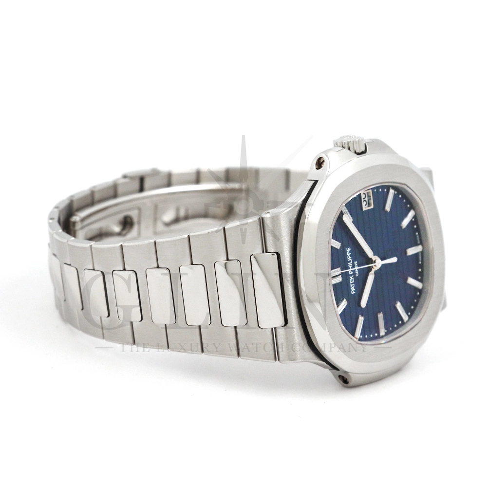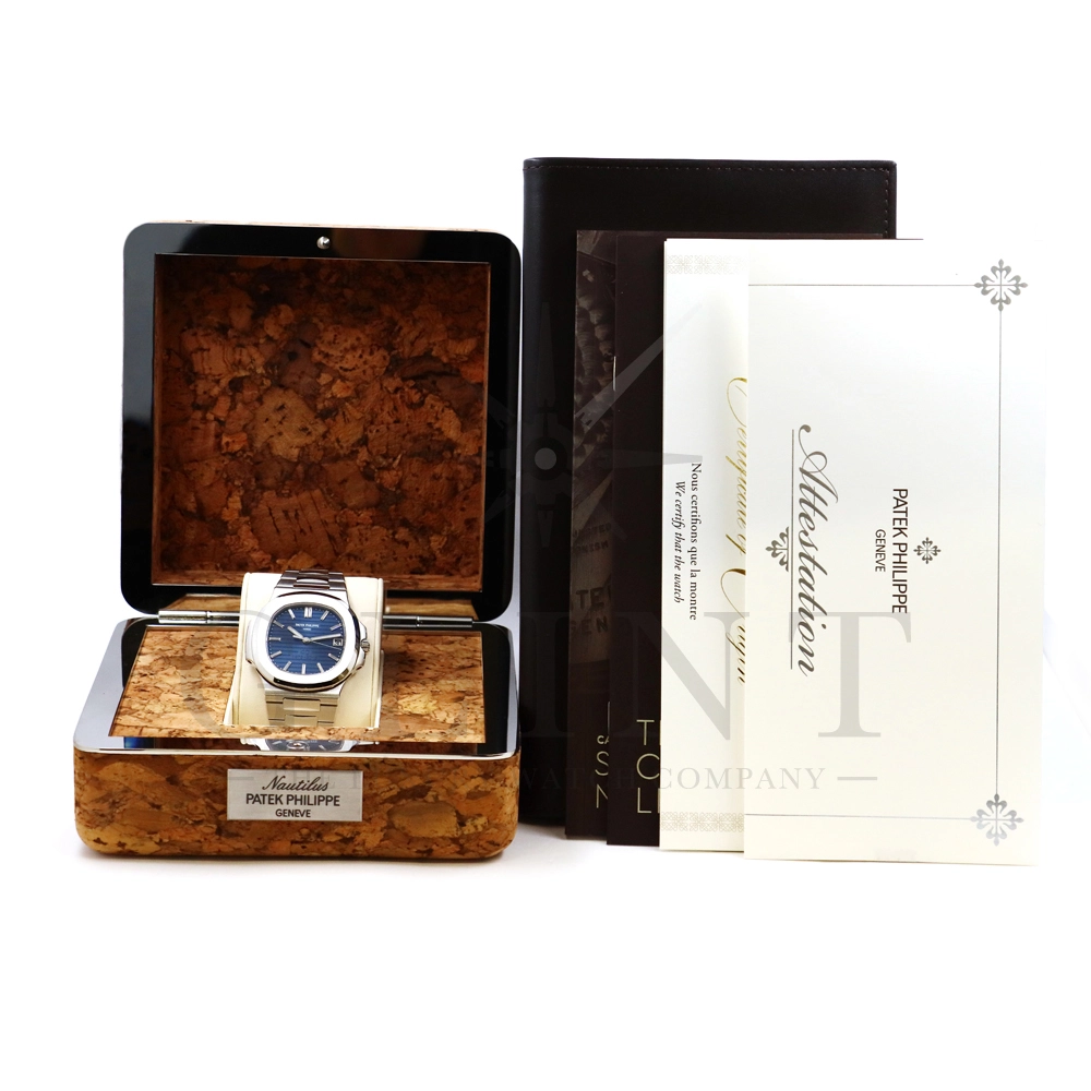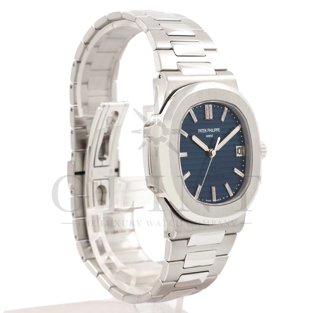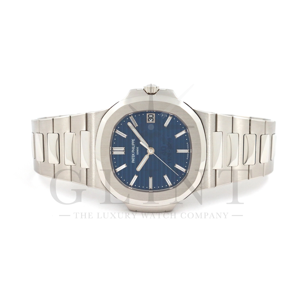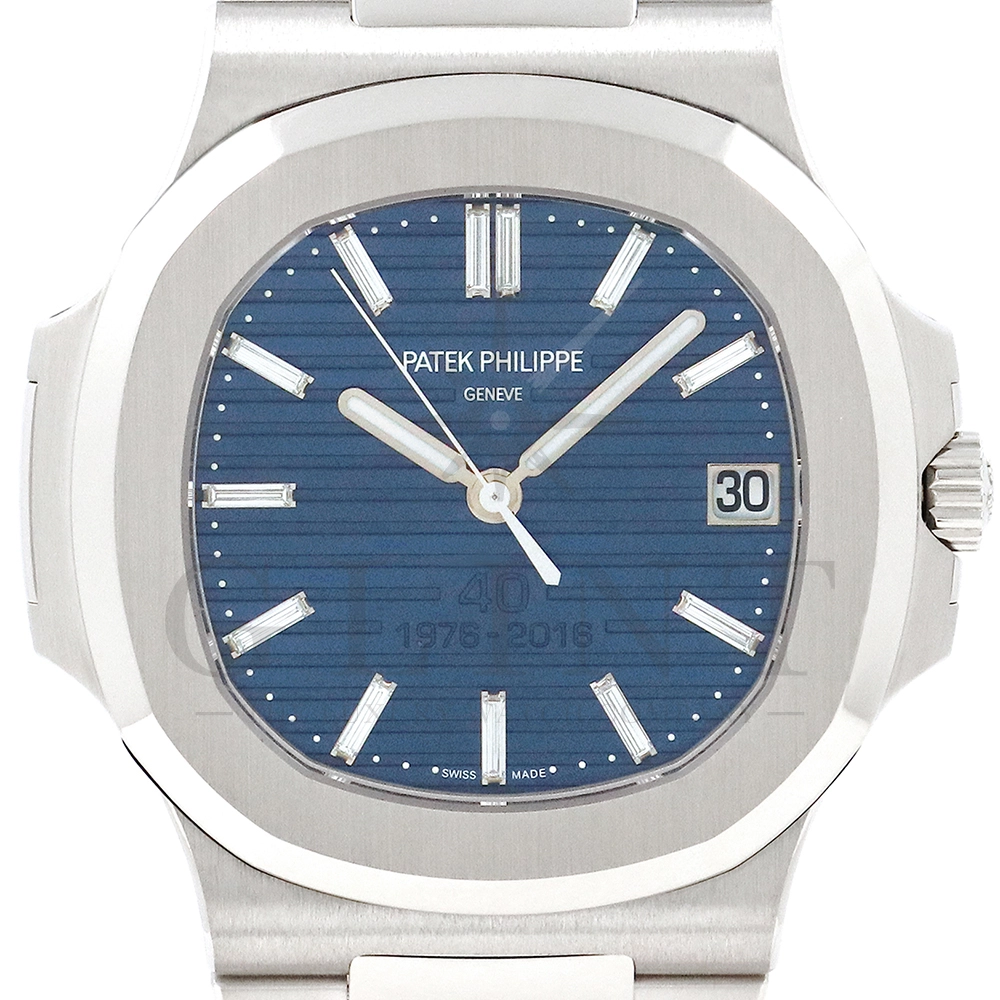 こちらは2016年にノーチラス誕生40周年を記念して作られた5711/1P-001です。世界で700本のみ生産されたプラチナを素材にした特別モデル。サンバースト加工されたブルーの文字盤の6時位置にはノーチラスが誕生した1976年から2016年までの40周年を意味する数字が型押しされており、インデックスにバゲットダイヤモンドがセッティングされております。ベゼルの6時位置にもプラチナモデル特有のダイヤモンドがセッティング。ブレスレットはケース厚8.3mmの薄型に合わせて仕上げられており、プラチナ素材ならではの重量感もしっかり味わえる事ながら、腕元への絶妙なフィット感が抜群の着け心地と装着感を与えてくれます。また、付属品にもパテックフィリップのこだわりが感じられ、専用ケースは1976年にノーチラス 3700-1A発売時に採用された天然コルク材を用いた特別ボックスを忠実に復刻しております。ノーチラスの伝統と歴史に名を刻む特別な一本です。