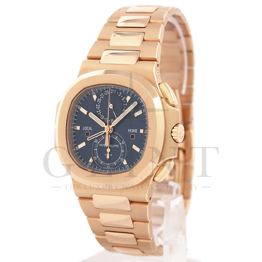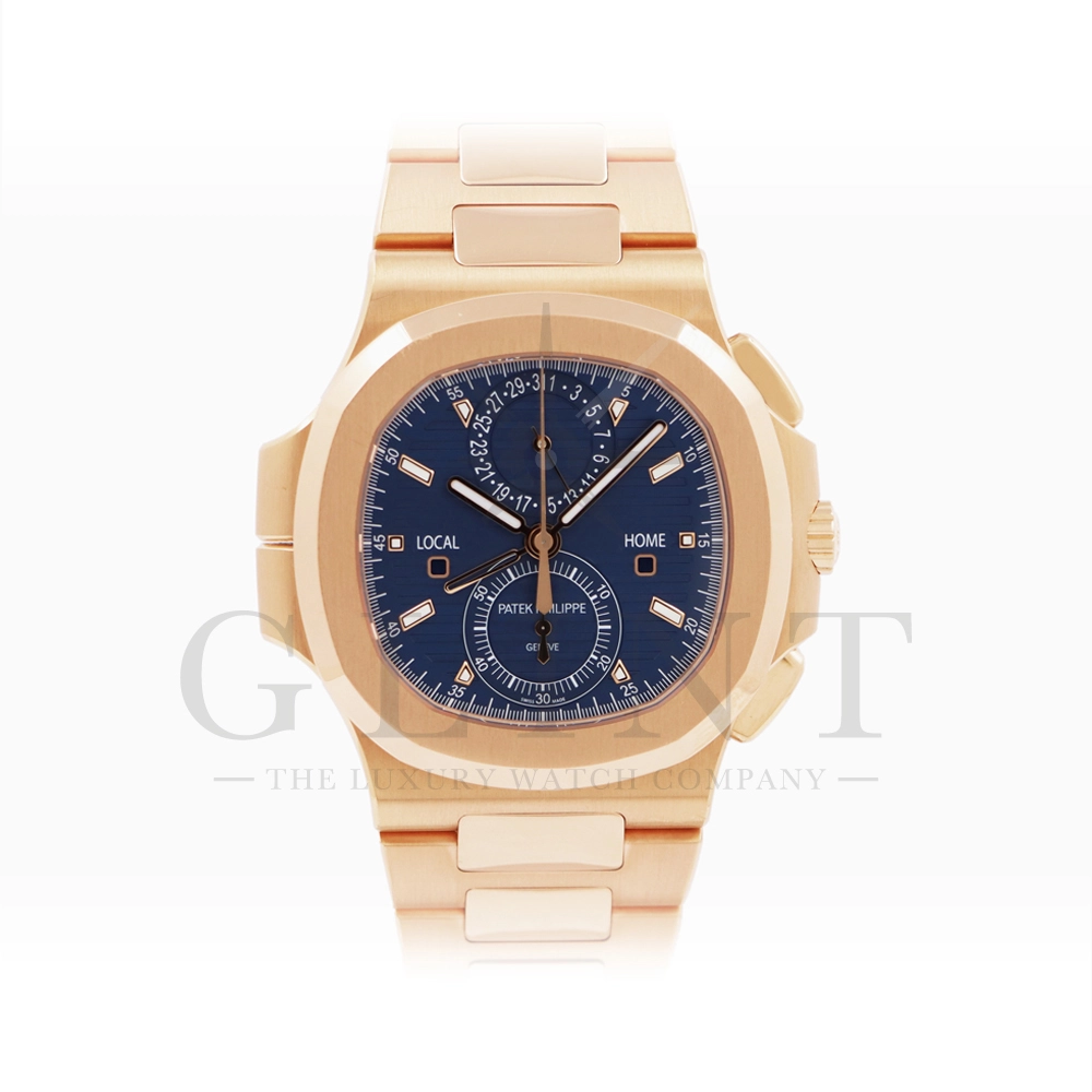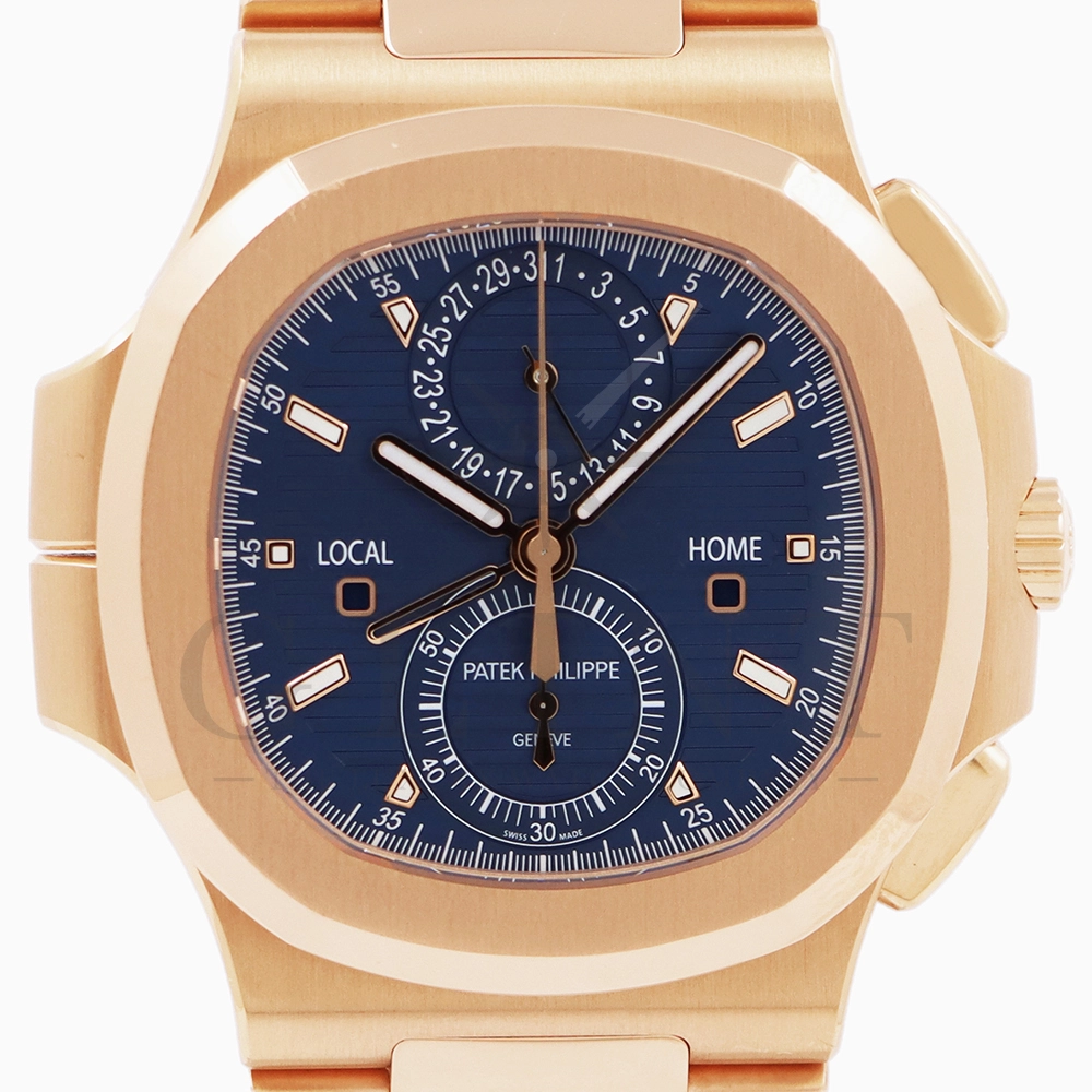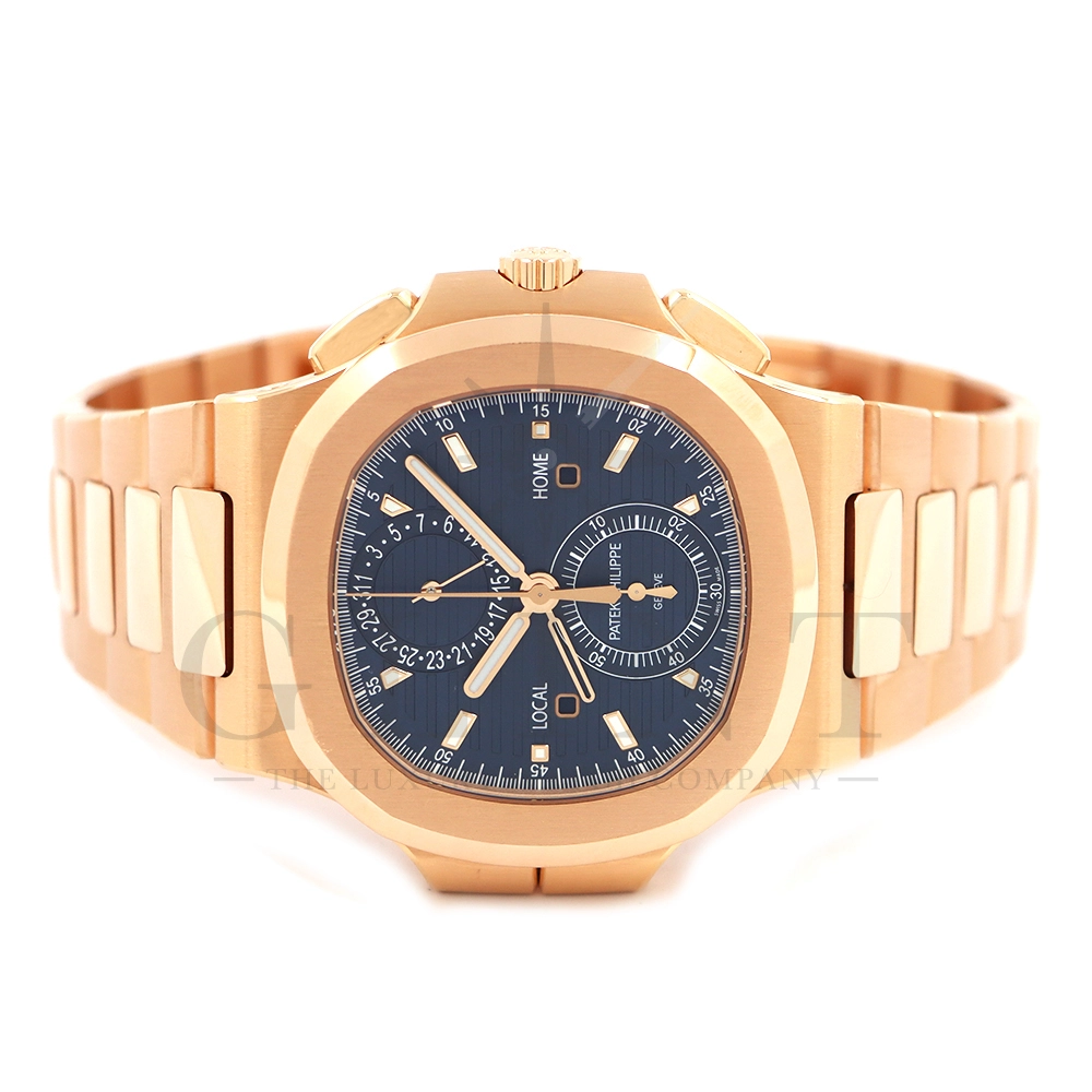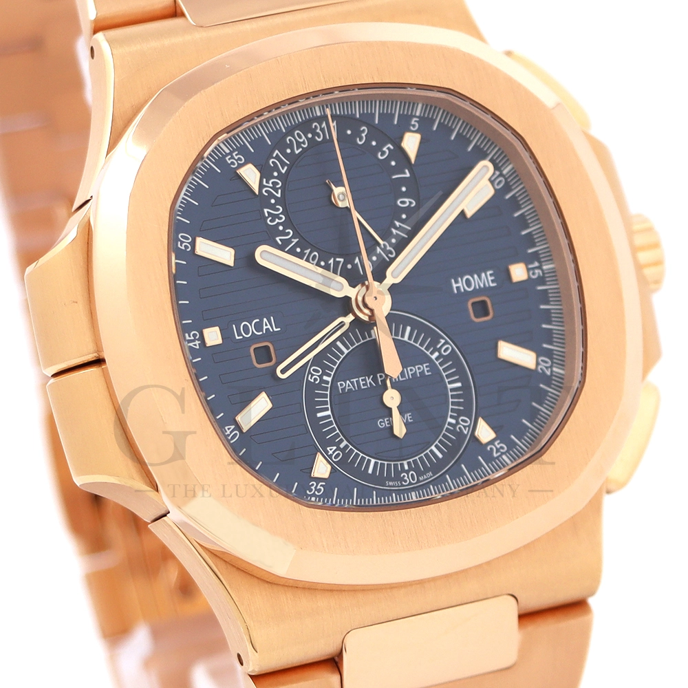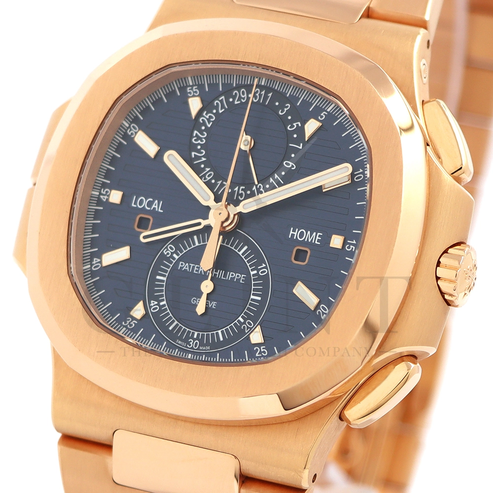 こちらはノーチラス トラベルタイム クロノグラフです。2021年に登場した非常に魅力的なトラベルタイム・クロノグラフの最新の進化形、ローズゴールド製の5990/1R-001。暖かみのあるブルー・ソレイユのダイヤルには、ゴールドのアクセント、アプライドの夜光マーカー、ローズゴールドの針が配されており、多くのコレクターを夢中にさせるノーチラスのルック&フィールと共に、優れた視認性を実現しております。トラベルタイムは重なり合う2本の時針により、2つの異なったタイムゾーンの時刻を一目で判るように表示する機構で、こちらのモデルは出発地と現地の2つの昼夜窓表示を搭載。12時位置には日付を指針表示されており、実用性に優れております。搭載されている自動巻きクロノグラフムーブメント Cal.CH 28-520 C FUSの垂直クラッチが非常に優れており、クロノグラフ作動時のエネルギーロスがほとんど無い為、6時側に位置するクロノグラフ秒針を通常秒針として使用する事も可能です。機械式時計の最高峰を追及した名門パテックフィリップの卓越した技術を心ゆくまで堪能できる至極の一本と言えるでしょう。