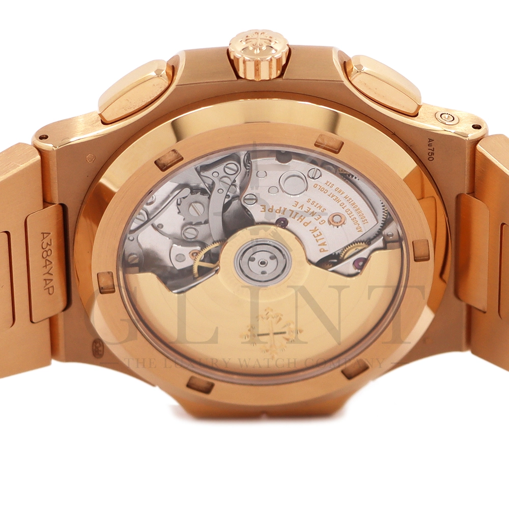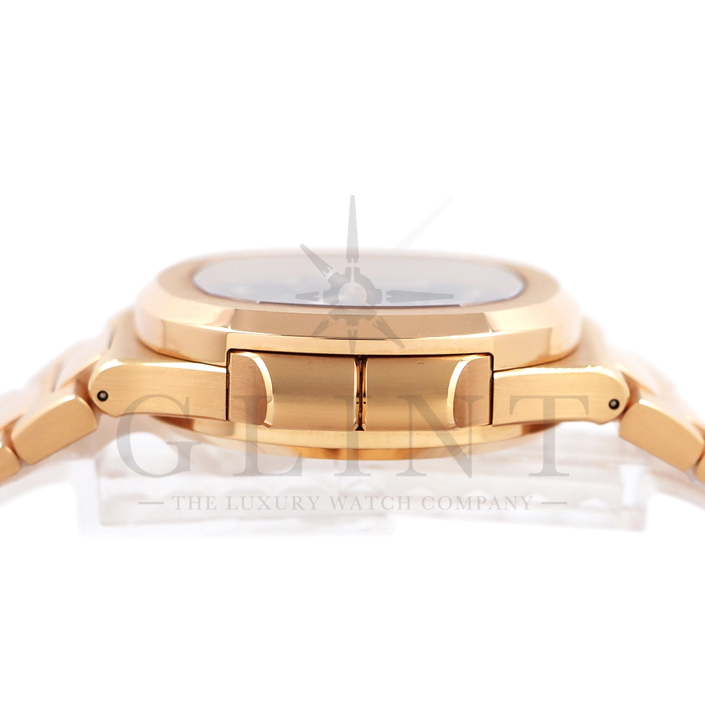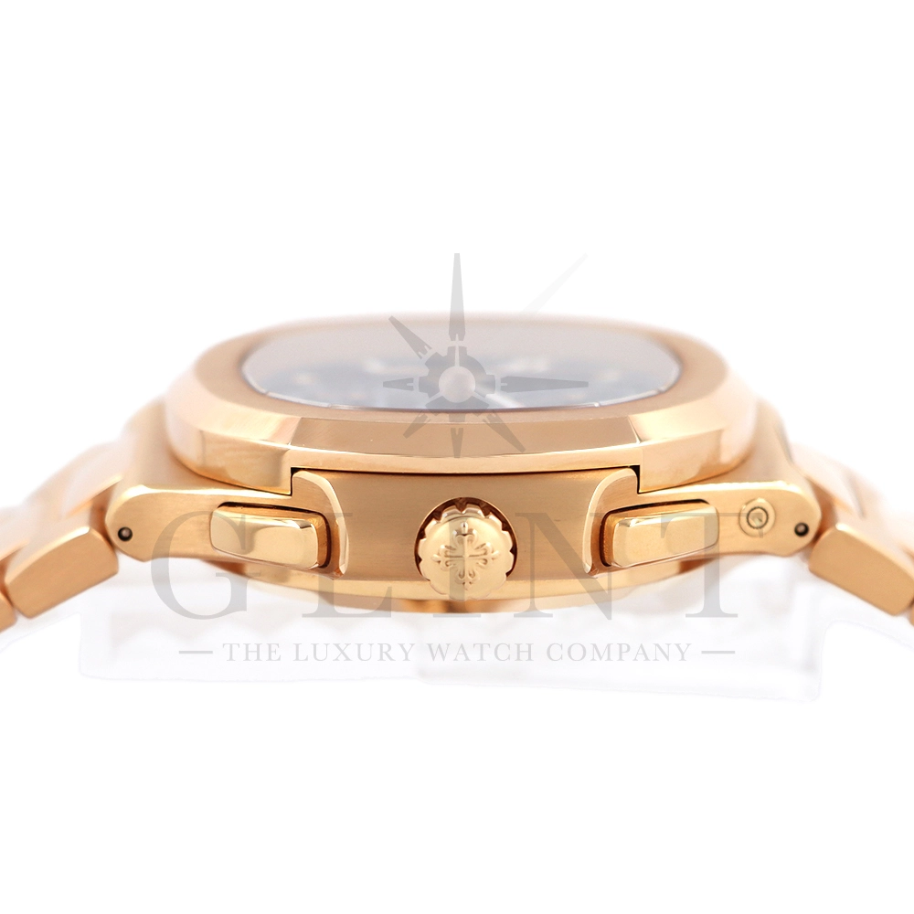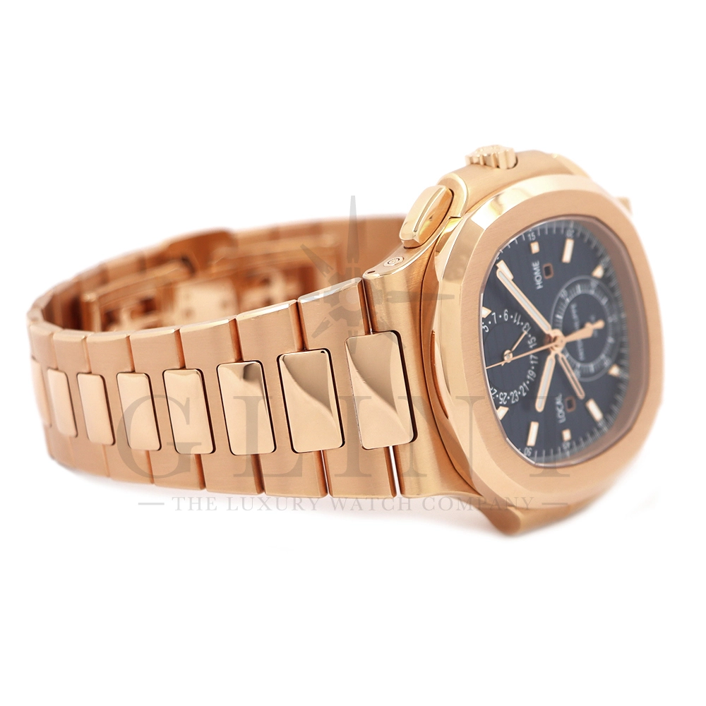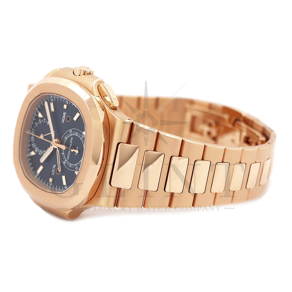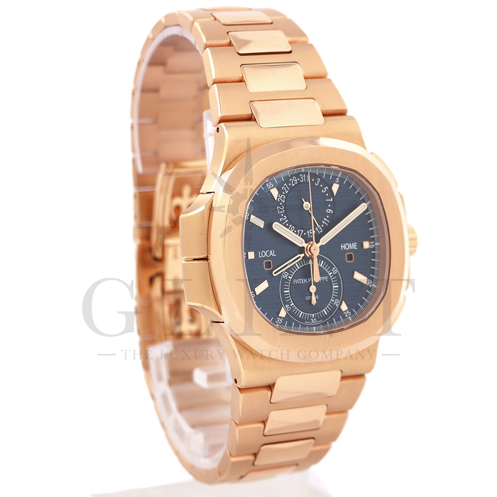 こちらはノーチラス トラベルタイム クロノグラフです。2021年に登場した非常に魅力的なトラベルタイム・クロノグラフの最新の進化形、ローズゴールド製の5990/1R-001。暖かみのあるブルー・ソレイユのダイヤルには、ゴールドのアクセント、アプライドの夜光マーカー、ローズゴールドの針が配されており、多くのコレクターを夢中にさせるノーチラスのルック&フィールと共に、優れた視認性を実現しております。トラベルタイムは重なり合う2本の時針により、2つの異なったタイムゾーンの時刻を一目で判るように表示する機構で、こちらのモデルは出発地と現地の2つの昼夜窓表示を搭載。12時位置には日付を指針表示されており、実用性に優れております。搭載されている自動巻きクロノグラフムーブメント Cal.CH 28-520 C FUSの垂直クラッチが非常に優れており、クロノグラフ作動時のエネルギーロスがほとんど無い為、6時側に位置するクロノグラフ秒針を通常秒針として使用する事も可能です。機械式時計の最高峰を追及した名門パテックフィリップの卓越した技術を心ゆくまで堪能できる至極の一本と言えるでしょう。