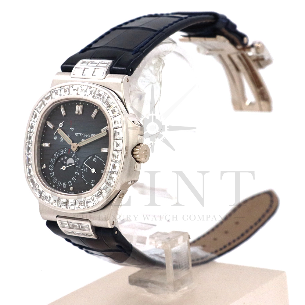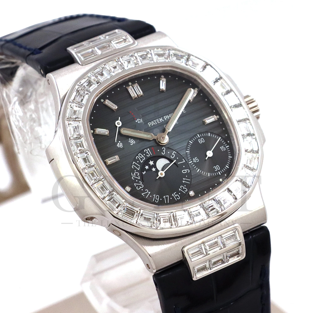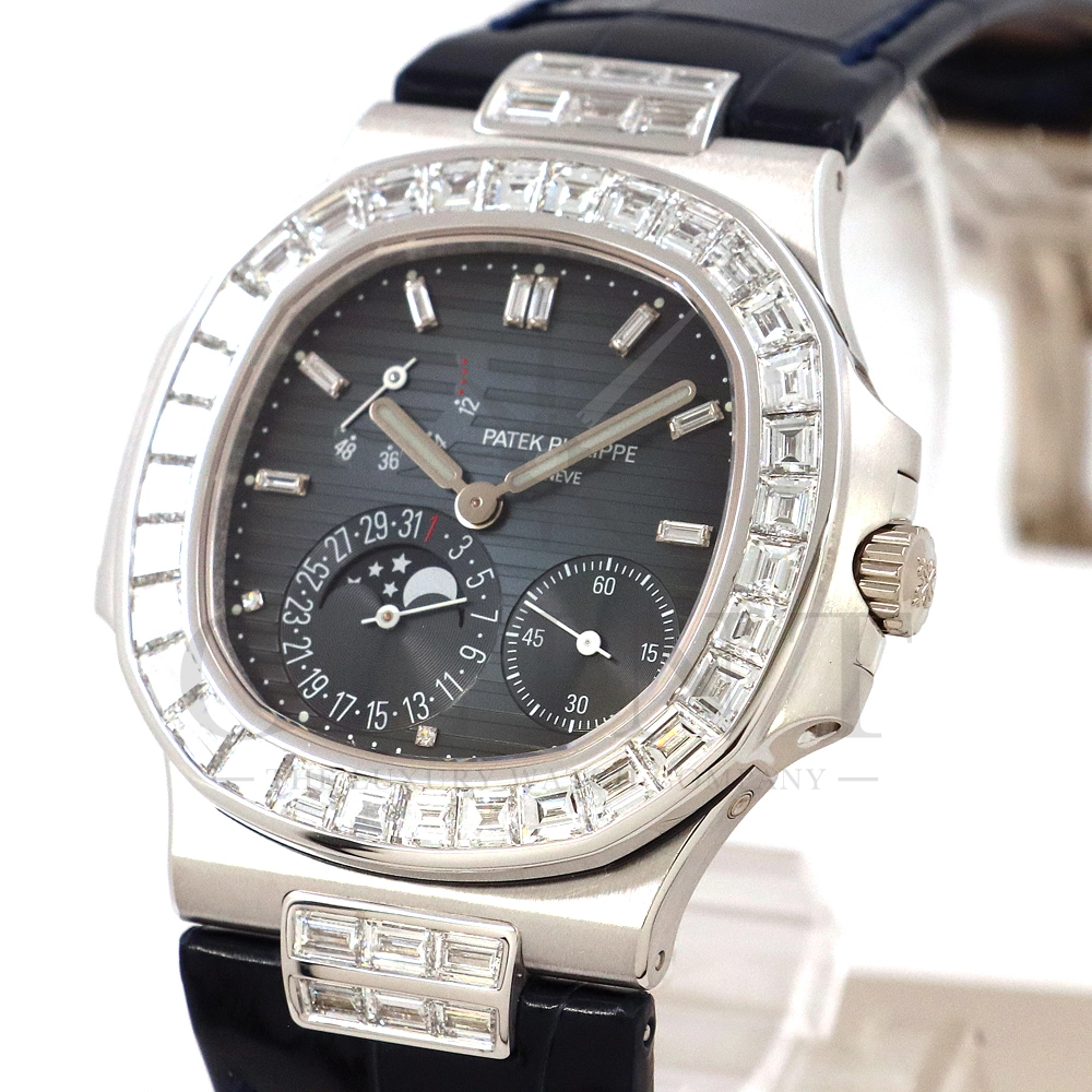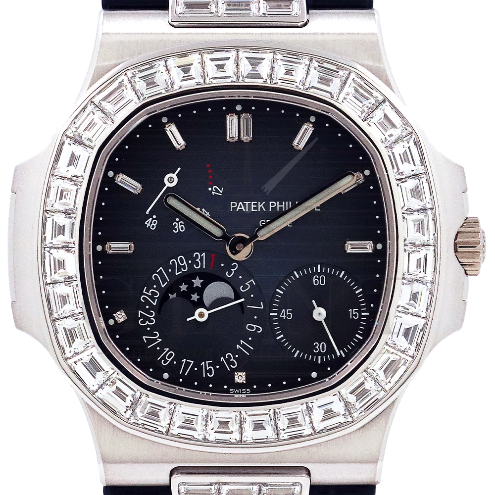 こちらはプチコンプリケーションモデルに煌びやかな美しさを放つ最高級バゲットダイヤモンドがセッティングされた5724G-001です。パテックフィリップで使用されるダイヤモンドは全てIFのみと厳格な基準を設けており、他ブランドでは味わえない目を奪われるほどの素晴らしい輝きで大変美しい仕上がりとなっております。そしてポインターデイト、ムーンフェイズ、パワーリザーブ表示と多機能ながら防水性も保ち、さらにはマイクロローターにより驚異的な薄さを実現し、パテックフィリップならではの完成度を実現。ケース素材に採用した18Kホワイトゴールドがより一層高級感を与え、伝統的な高級感や美しさを損なわずに、スポーティーさも融合させるなど、この一本だけで最高峰の高級時計ブランドの実力を再認識させてくれるでしょう。所有するだけで確実にご自身のステータスを高めてくれる極上の逸品をぜひご堪能下さい。