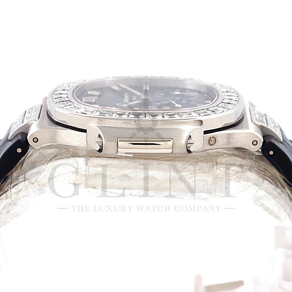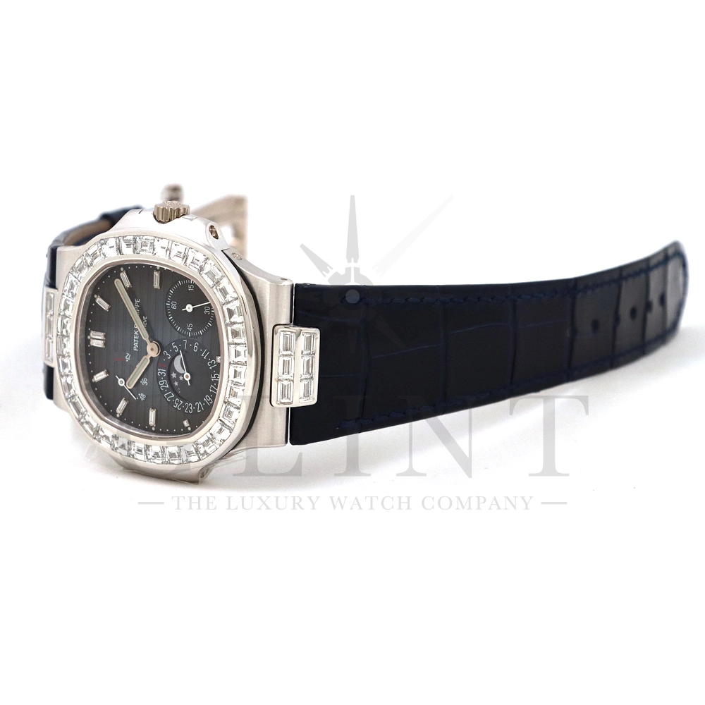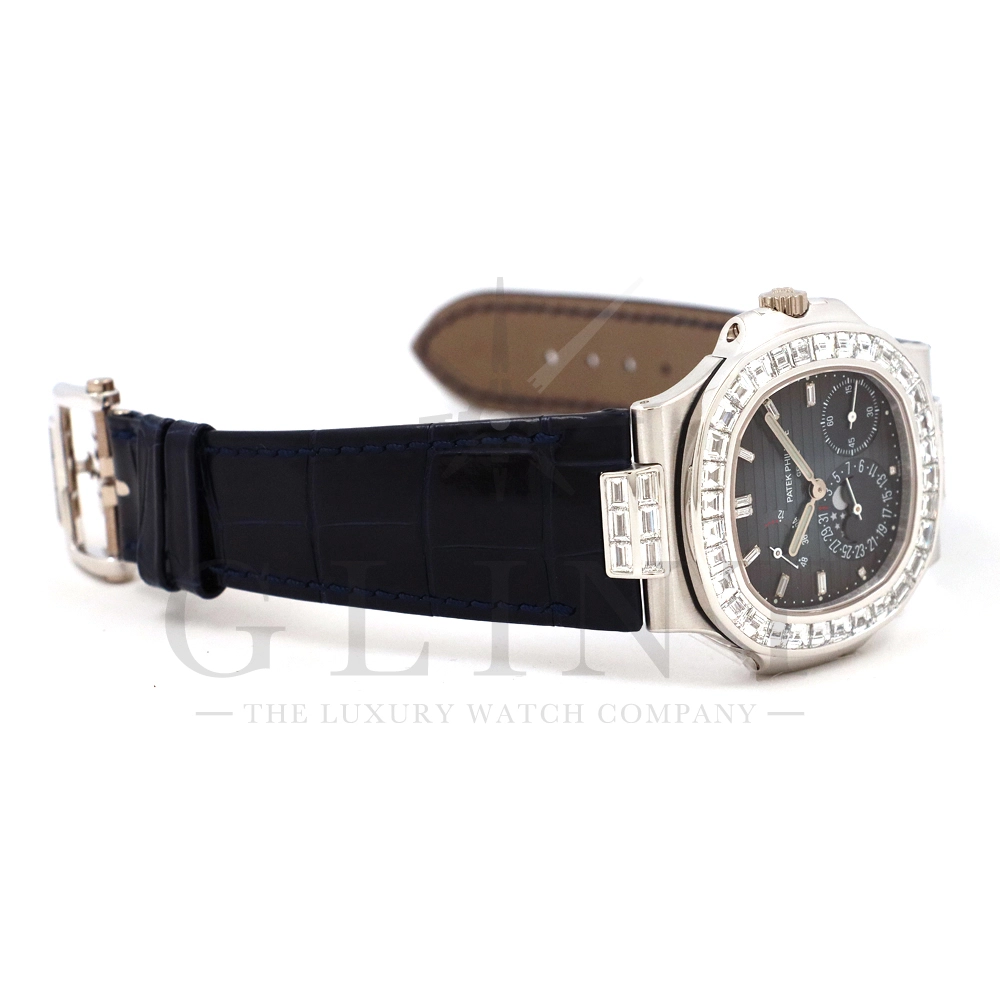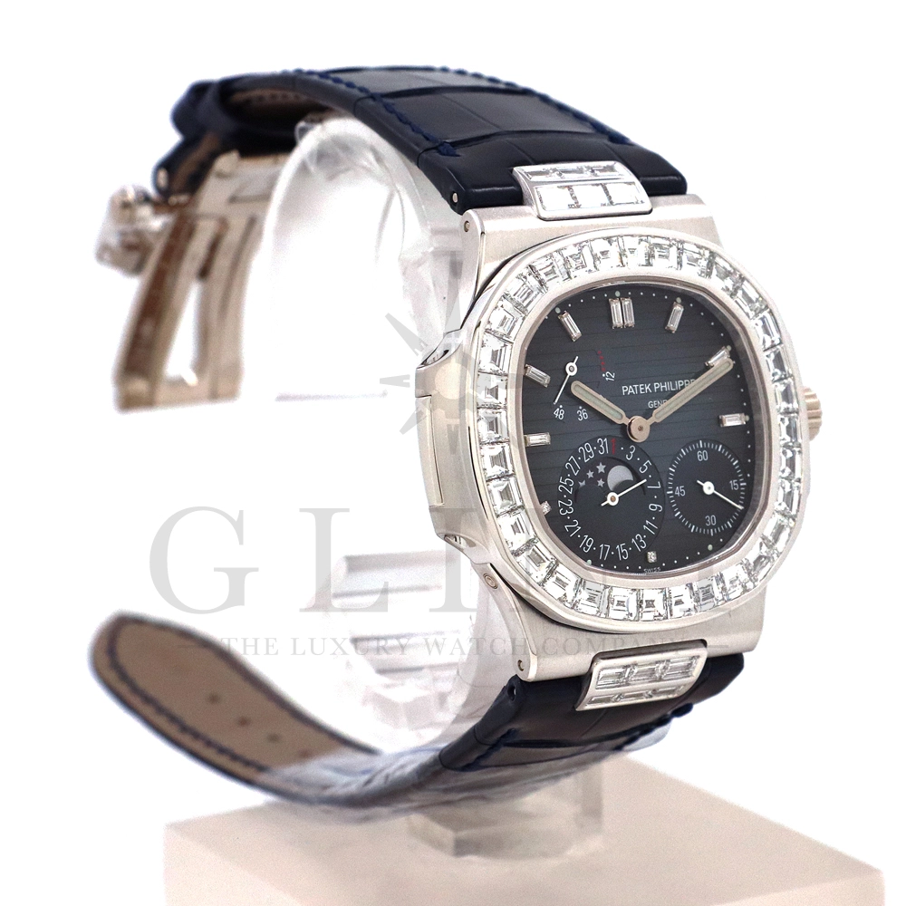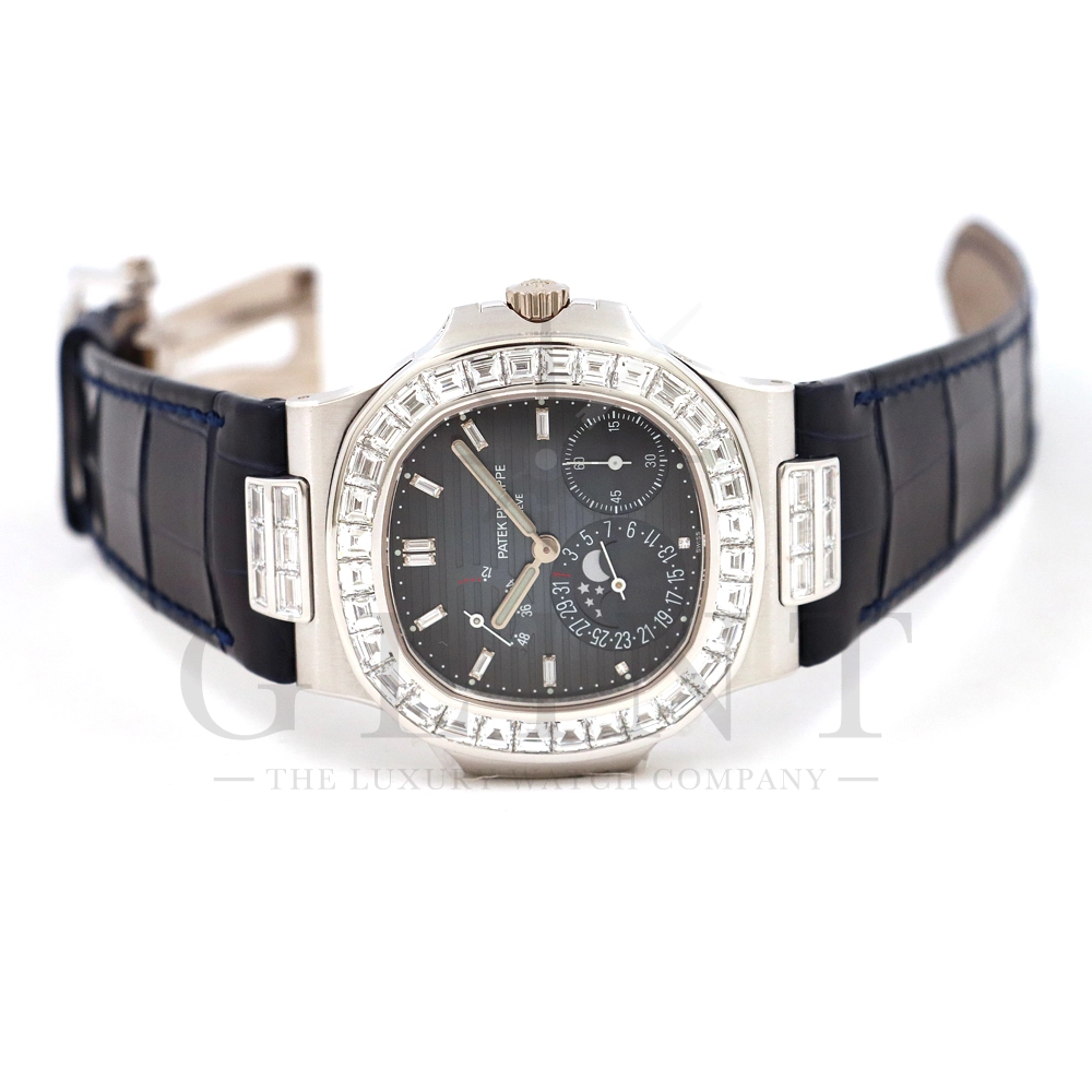 こちらはプチコンプリケーションモデルに煌びやかな美しさを放つ最高級バゲットダイヤモンドがセッティングされた5724G-001です。パテックフィリップで使用されるダイヤモンドは全てIFのみと厳格な基準を設けており、他ブランドでは味わえない目を奪われるほどの素晴らしい輝きで大変美しい仕上がりとなっております。そしてポインターデイト、ムーンフェイズ、パワーリザーブ表示と多機能ながら防水性も保ち、さらにはマイクロローターにより驚異的な薄さを実現し、パテックフィリップならではの完成度を実現。ケース素材に採用した18Kホワイトゴールドがより一層高級感を与え、伝統的な高級感や美しさを損なわずに、スポーティーさも融合させるなど、この一本だけで最高峰の高級時計ブランドの実力を再認識させてくれるでしょう。所有するだけで確実にご自身のステータスを高めてくれる極上の逸品をぜひご堪能下さい。