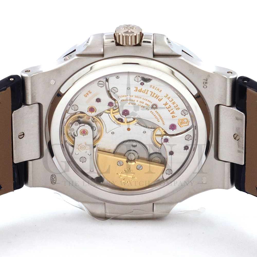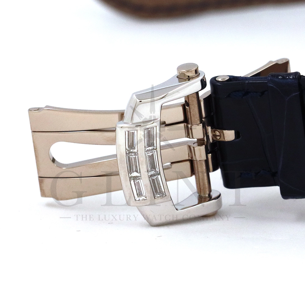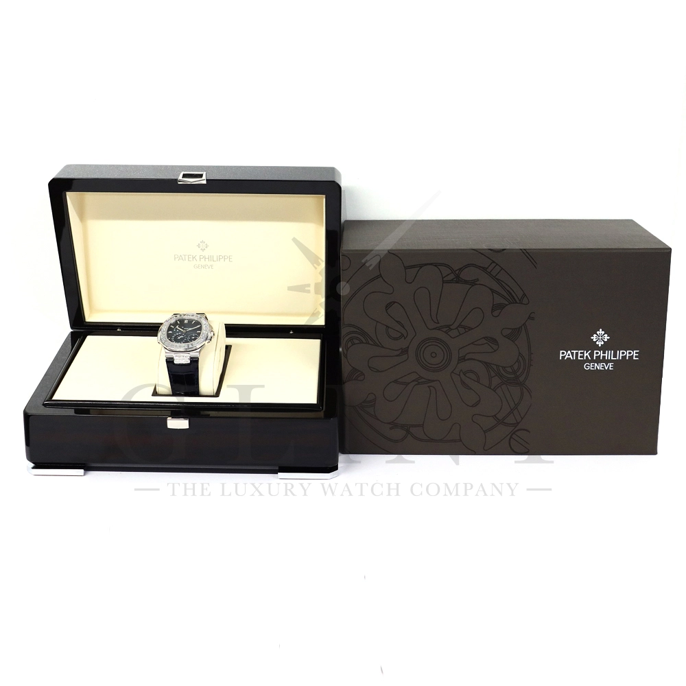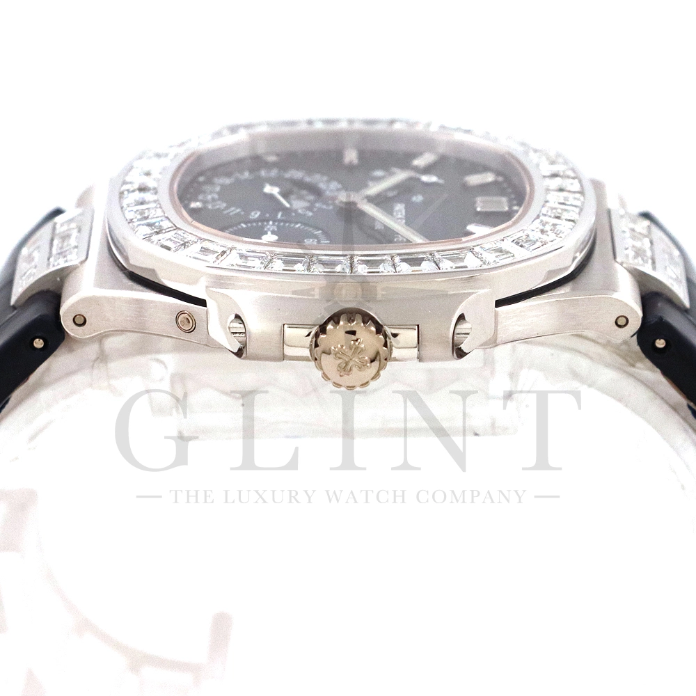 こちらはプチコンプリケーションモデルに煌びやかな美しさを放つ最高級バゲットダイヤモンドがセッティングされた5724G-001です。パテックフィリップで使用されるダイヤモンドは全てIFのみと厳格な基準を設けており、他ブランドでは味わえない目を奪われるほどの素晴らしい輝きで大変美しい仕上がりとなっております。そしてポインターデイト、ムーンフェイズ、パワーリザーブ表示と多機能ながら防水性も保ち、さらにはマイクロローターにより驚異的な薄さを実現し、パテックフィリップならではの完成度を実現。ケース素材に採用した18Kホワイトゴールドがより一層高級感を与え、伝統的な高級感や美しさを損なわずに、スポーティーさも融合させるなど、この一本だけで最高峰の高級時計ブランドの実力を再認識させてくれるでしょう。所有するだけで確実にご自身のステータスを高めてくれる極上の逸品をぜひご堪能下さい。