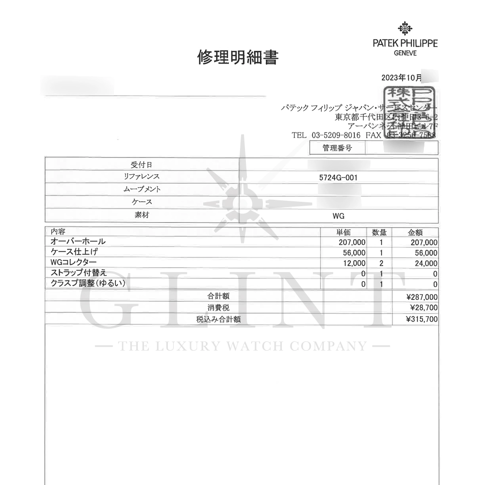 付属品:専用ケース パテックフィリップ修理明細書の写し