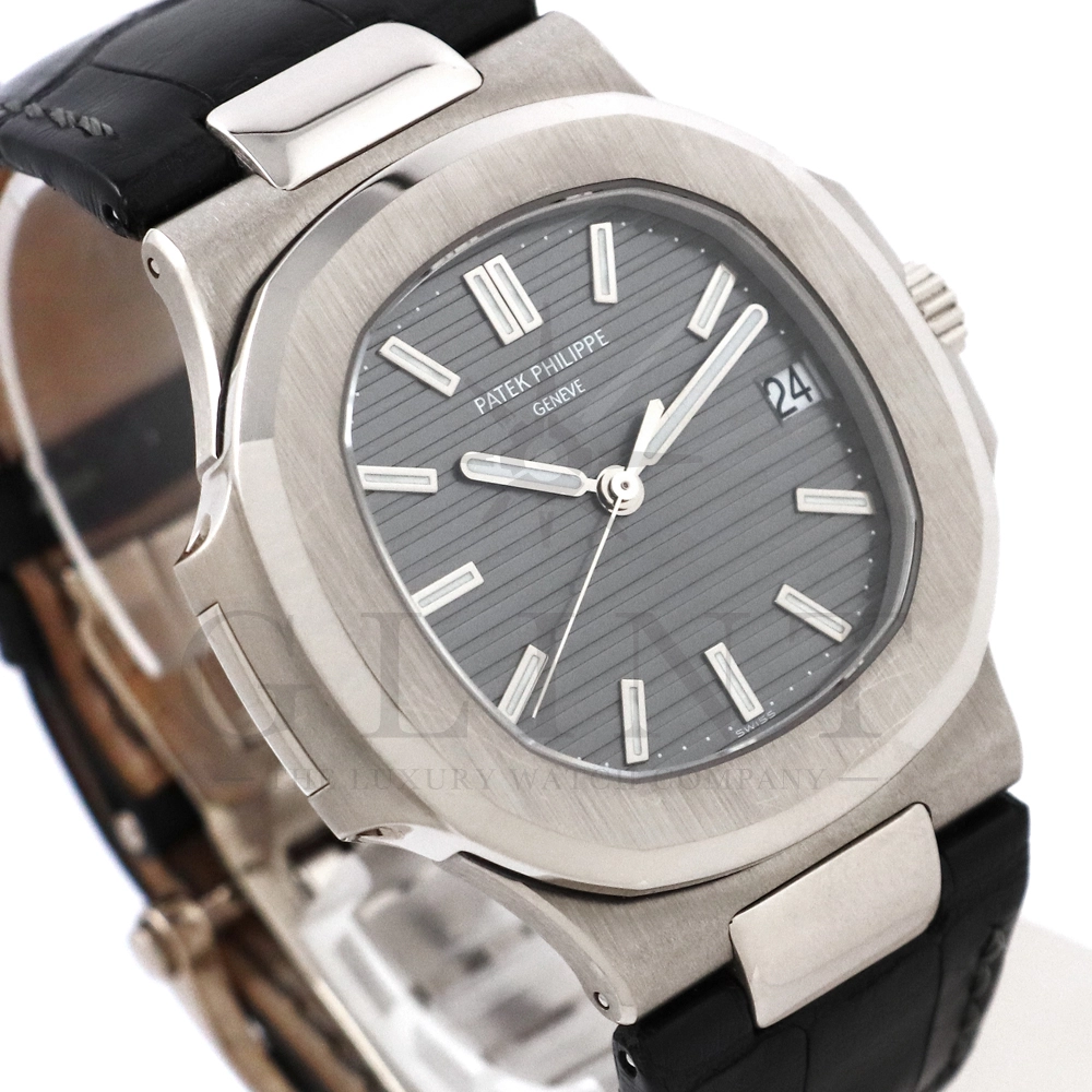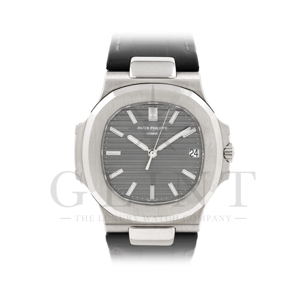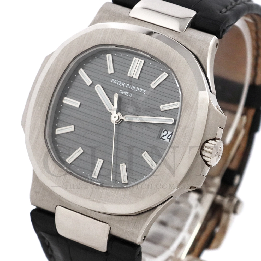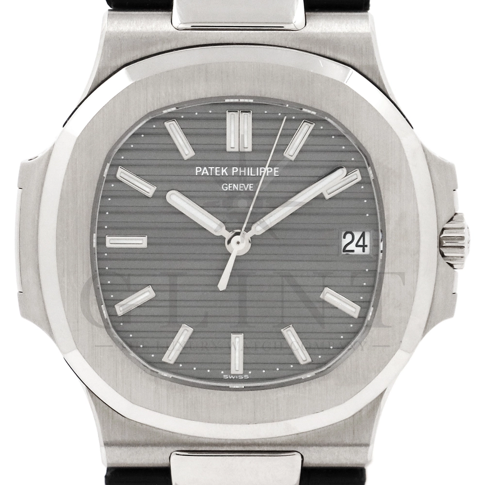 こちらはパテック・フィリップ、ノーチラス 5711G-001です。ノーチラス30周年のメモリアルイヤーに初代ノーチラス3700の真の後継モデルとして誕生したモデル。ケースサイズは40mmにケース厚は僅か8.3mm、シースルーバックのスリーピースケースに水平エンボス模様がデザインされたグレー文字盤が印象的です。搭載されているムーブメントはCal.324 S C AIG. 1となり、パワーリザーブは約45時間で、シースルーのケースバックからは21Kゴールドローターとムーブメントの動きをダイレクトに堪能する事ができます。ノーチラスシリーズでは初となる革ベルトを採用しており、スポーツモデルながらもフォーマルな印象も与え、ステータス性の高い洗練された大人の雰囲気を演出してくれる魅力的な逸品です。
