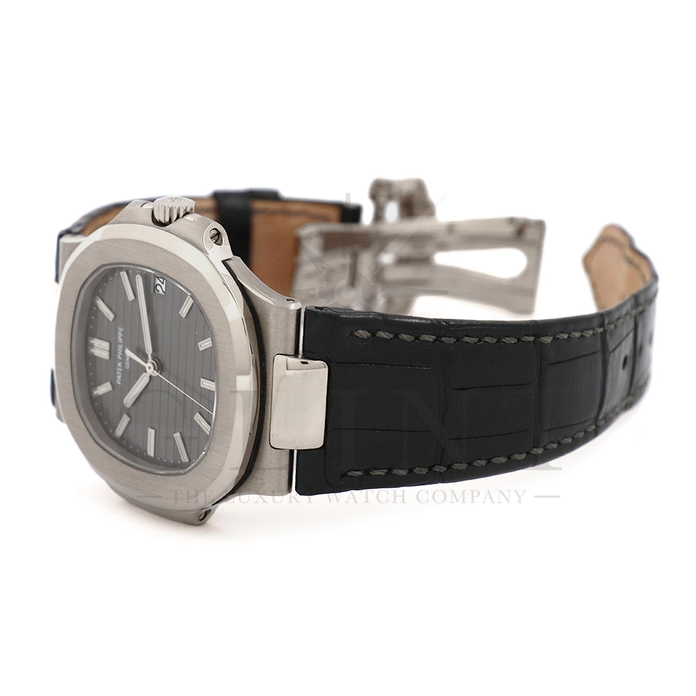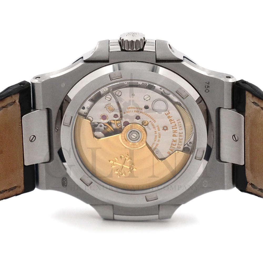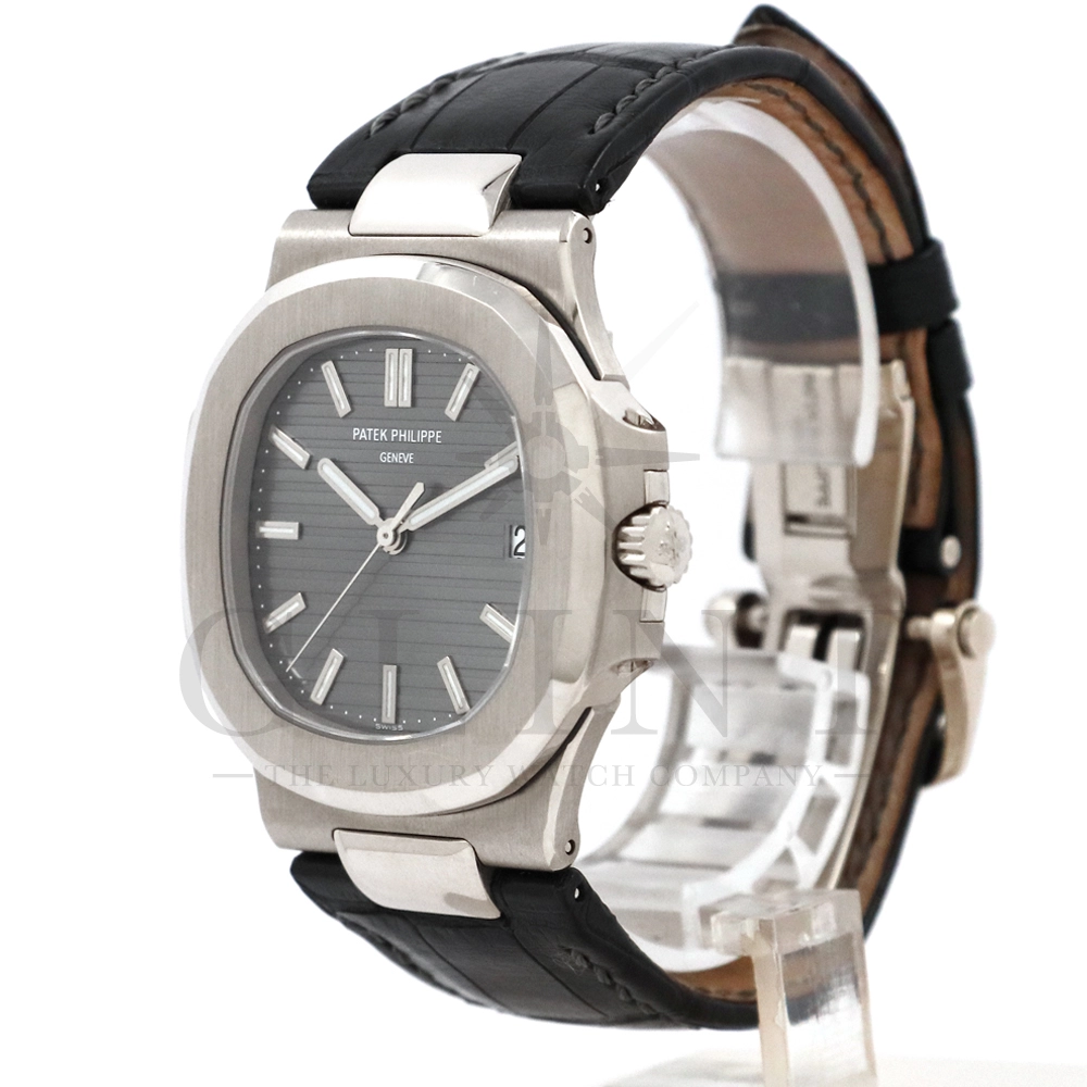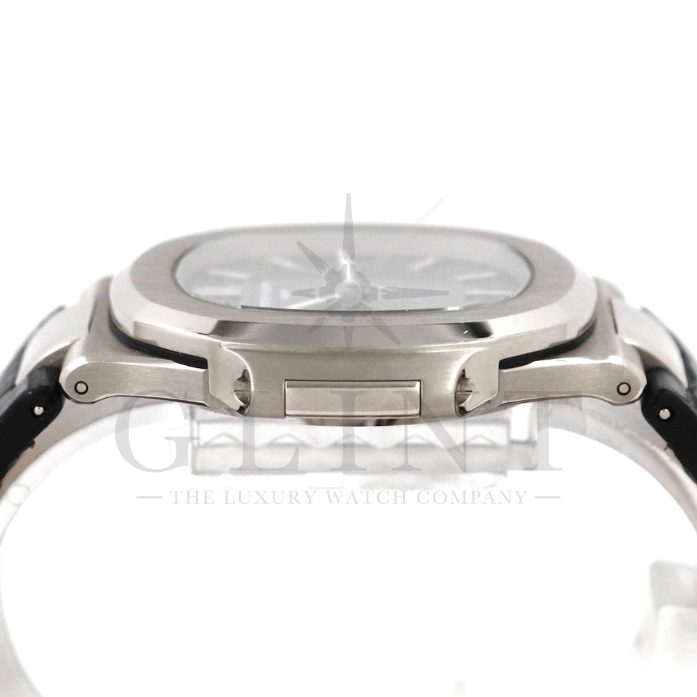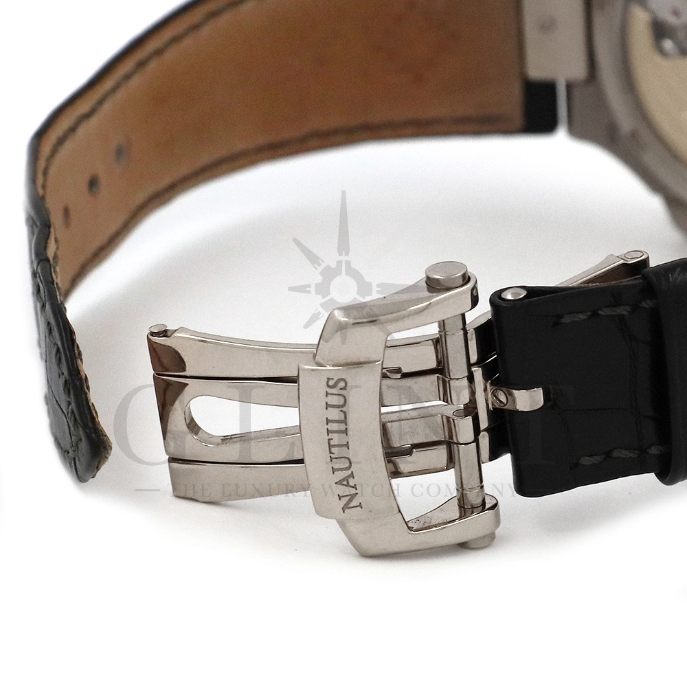 こちらはパテック・フィリップ、ノーチラス 5711G-001です。ノーチラス30周年のメモリアルイヤーに初代ノーチラス3700の真の後継モデルとして誕生したモデル。ケースサイズは40mmにケース厚は僅か8.3mm、シースルーバックのスリーピースケースに水平エンボス模様がデザインされたグレー文字盤が印象的です。搭載されているムーブメントはCal.324 S C AIG. 1となり、パワーリザーブは約45時間で、シースルーのケースバックからは21Kゴールドローターとムーブメントの動きをダイレクトに堪能する事ができます。ノーチラスシリーズでは初となる革ベルトを採用しており、スポーツモデルながらもフォーマルな印象も与え、ステータス性の高い洗練された大人の雰囲気を演出してくれる魅力的な逸品です。