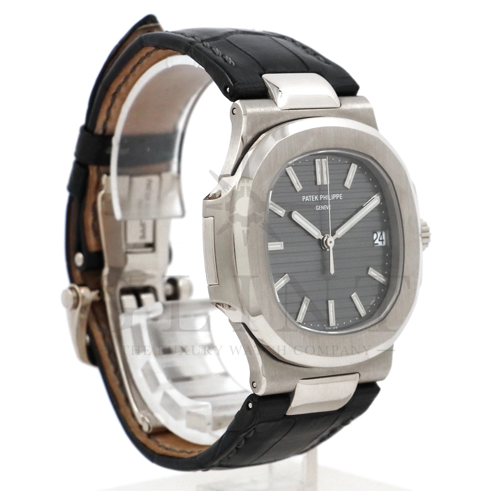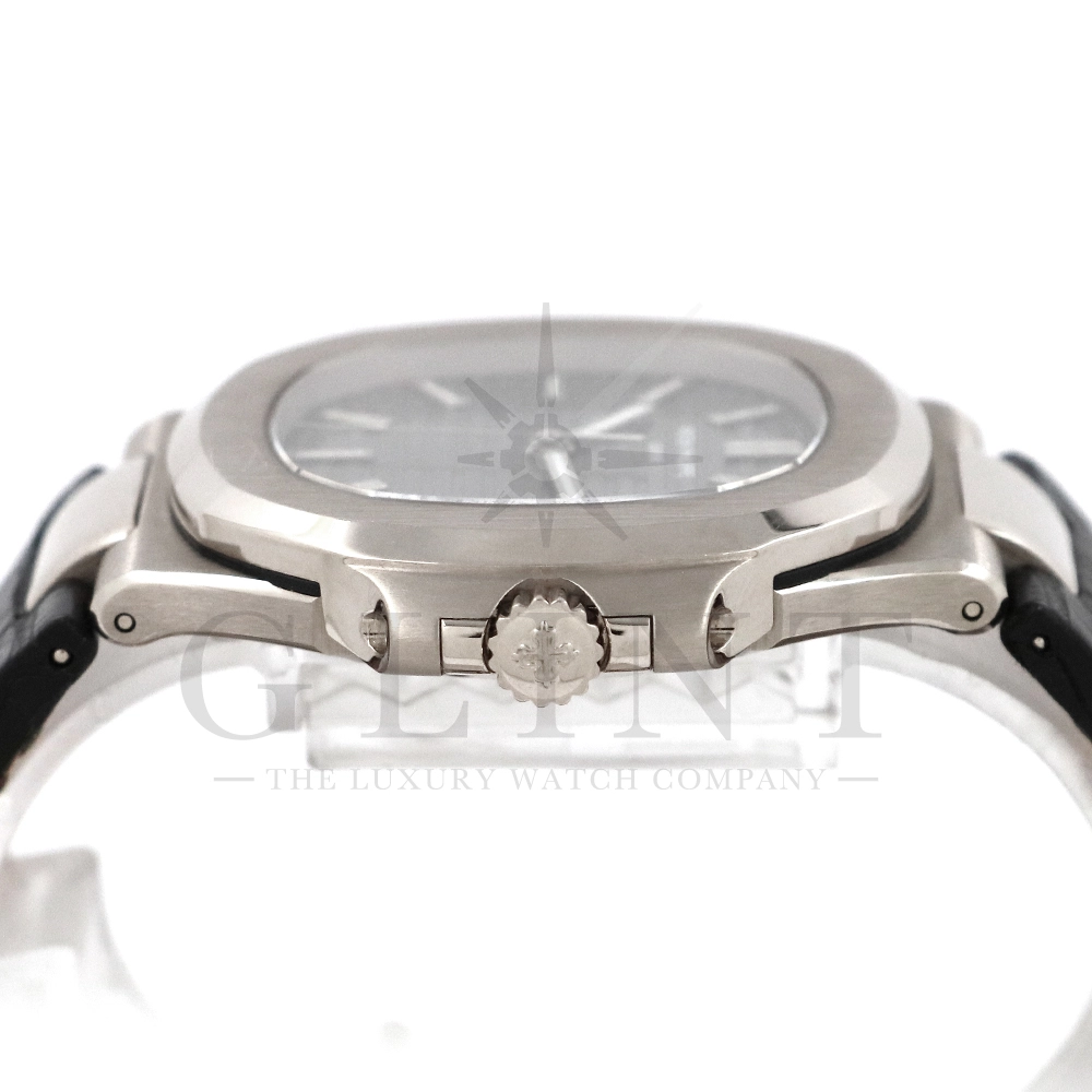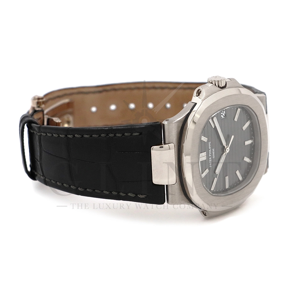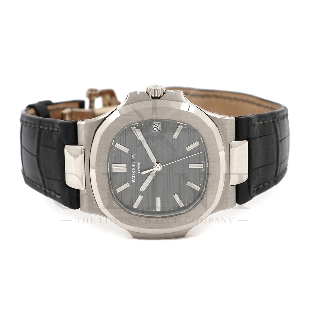 こちらはパテック・フィリップ、ノーチラス 5711G-001です。ノーチラス30周年のメモリアルイヤーに初代ノーチラス3700の真の後継モデルとして誕生したモデル。ケースサイズは40mmにケース厚は僅か8.3mm、シースルーバックのスリーピースケースに水平エンボス模様がデザインされたグレー文字盤が印象的です。搭載されているムーブメントはCal.324 S C AIG. 1となり、パワーリザーブは約45時間で、シースルーのケースバックからは21Kゴールドローターとムーブメントの動きをダイレクトに堪能する事ができます。ノーチラスシリーズでは初となる革ベルトを採用しており、スポーツモデルながらもフォーマルな印象も与え、ステータス性の高い洗練された大人の雰囲気を演出してくれる魅力的な逸品です。