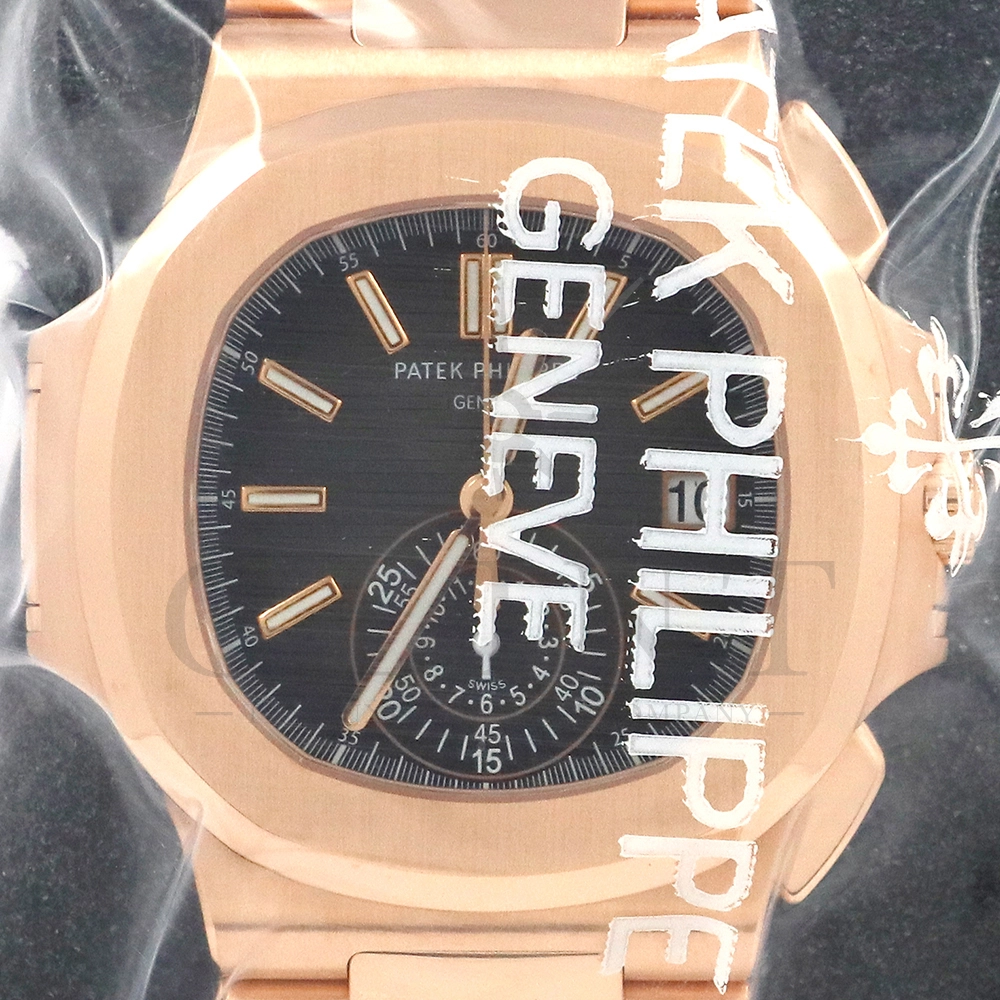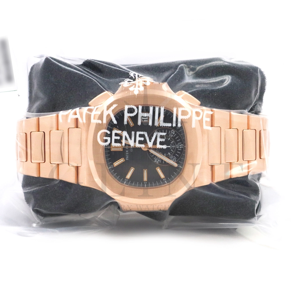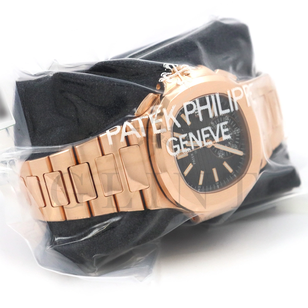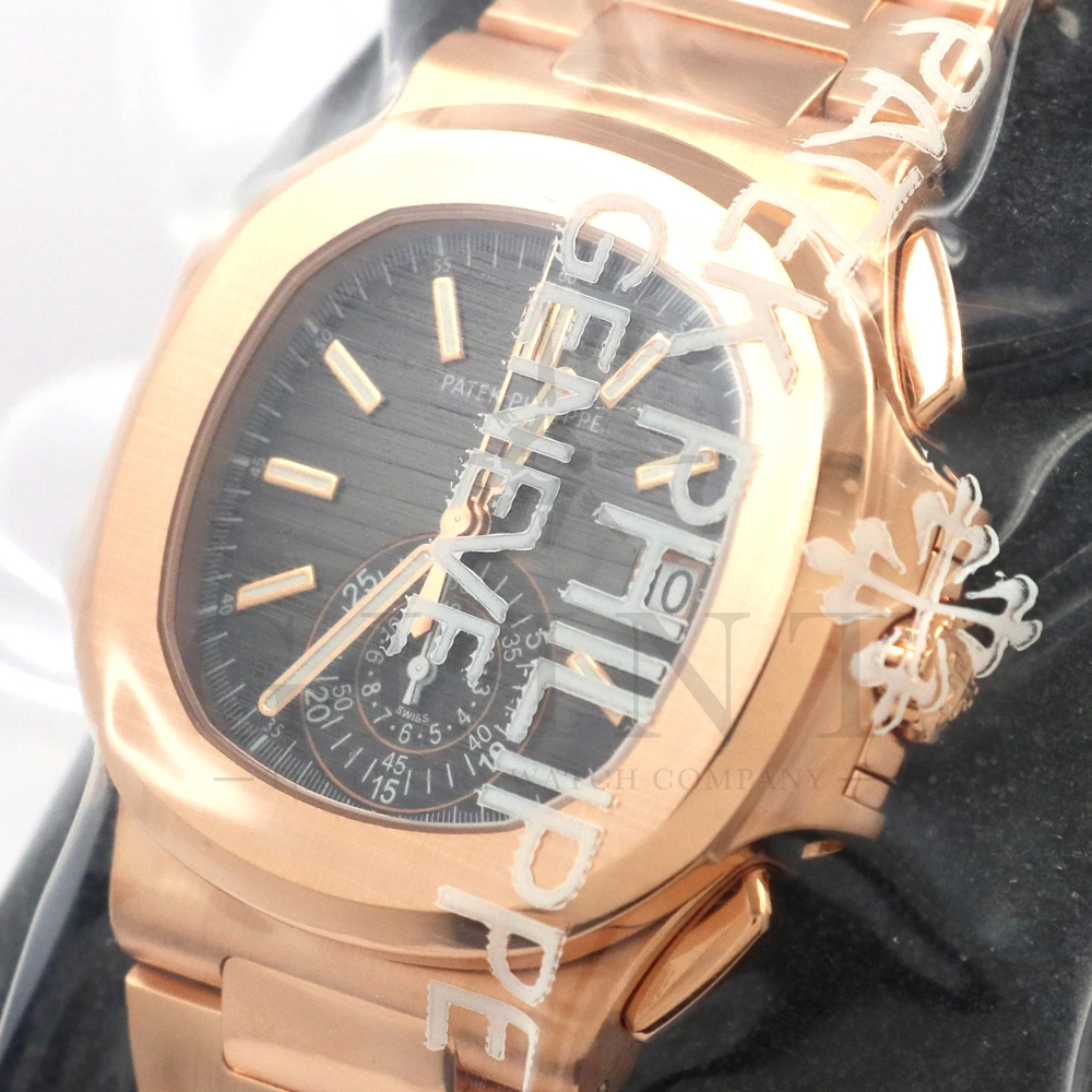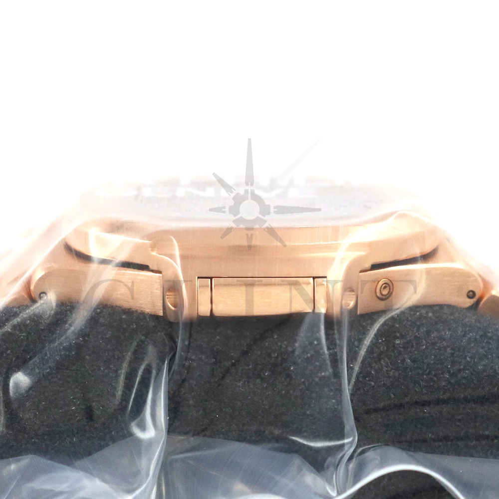 こちらはノーチラス初のスポーツクロノグラフ Ref.5980/1R-001。ケースとベルトにローズゴールドを使用したラグジュアリーなモデルながらも、ブラック・グラデーション文字盤との組み合わせによってシックで上品な雰囲気を演出してくれます。また、見た目の華やかさのみならず、言わずと知れた機能性と信頼性が凝縮された珠玉の一本であり、他のクロノグラフとは一線を画す唯一無二のモデルです。シースルーのケースバックからは、自社開発自動巻きクロノグラフ「Cal.CH28-520」を覗き見る事ができ、機械式時計の最高峰を追及した名門パテックフィリップが作り出す独自の世界観を存分に堪能することができるでしょう。誰もが羨む極上の一本です。