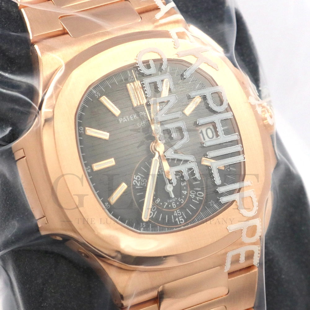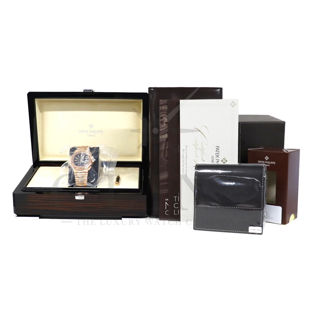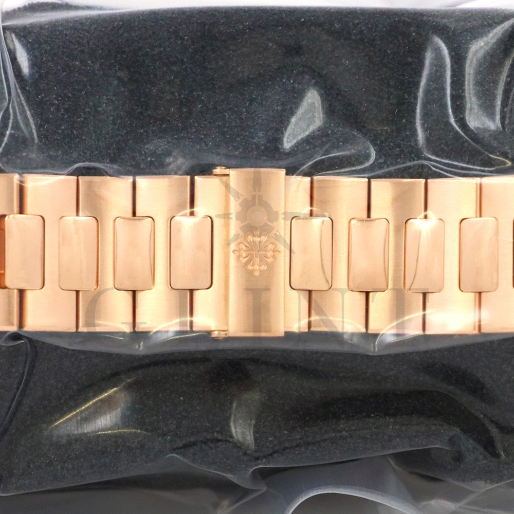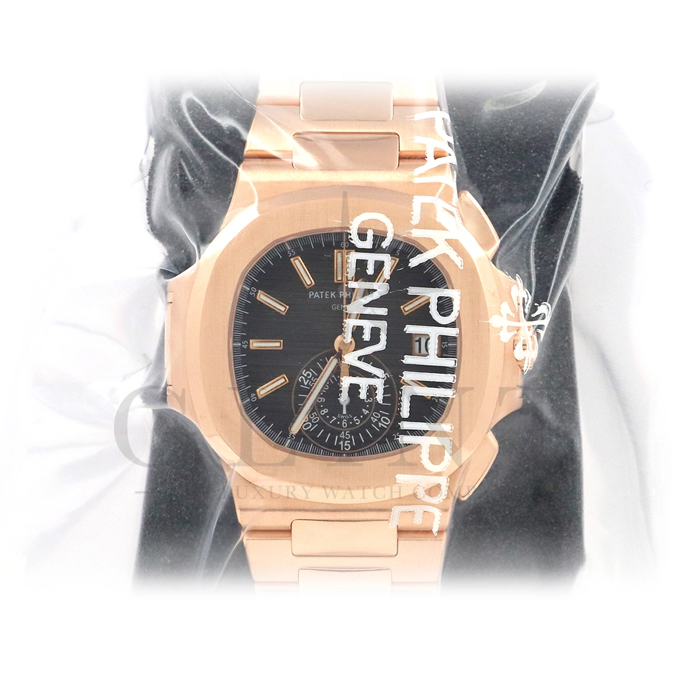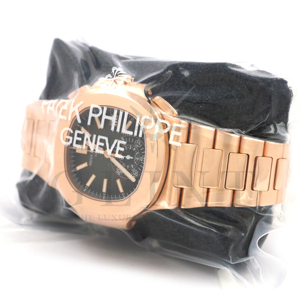 こちらはノーチラス初のスポーツクロノグラフ Ref.5980/1R-001。ケースとベルトにローズゴールドを使用したラグジュアリーなモデルながらも、ブラック・グラデーション文字盤との組み合わせによってシックで上品な雰囲気を演出してくれます。また、見た目の華やかさのみならず、言わずと知れた機能性と信頼性が凝縮された珠玉の一本であり、他のクロノグラフとは一線を画す唯一無二のモデルです。シースルーのケースバックからは、自社開発自動巻きクロノグラフ「Cal.CH28-520」を覗き見る事ができ、機械式時計の最高峰を追及した名門パテックフィリップが作り出す独自の世界観を存分に堪能することができるでしょう。誰もが羨む極上の一本です。