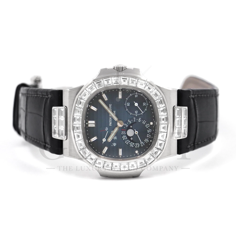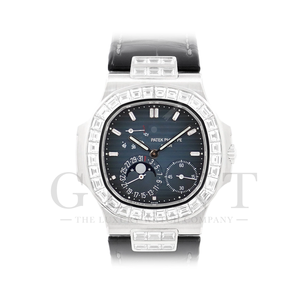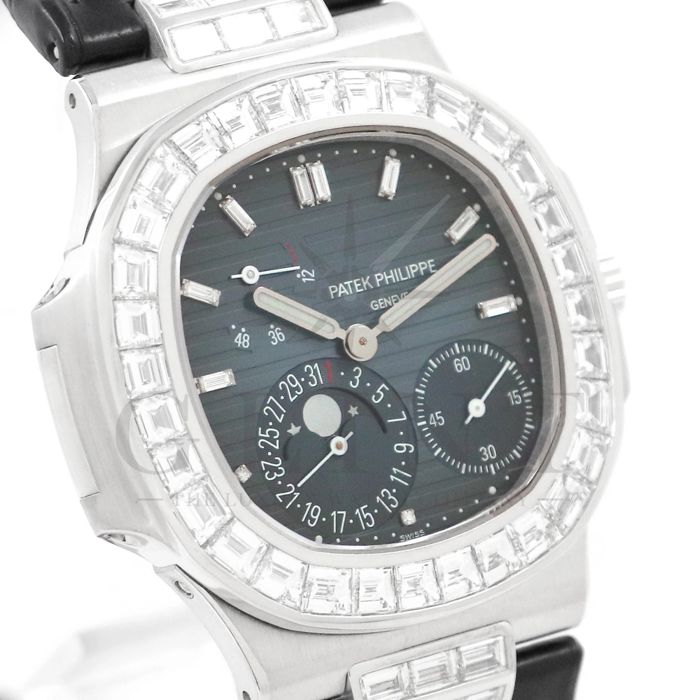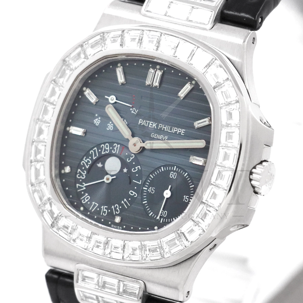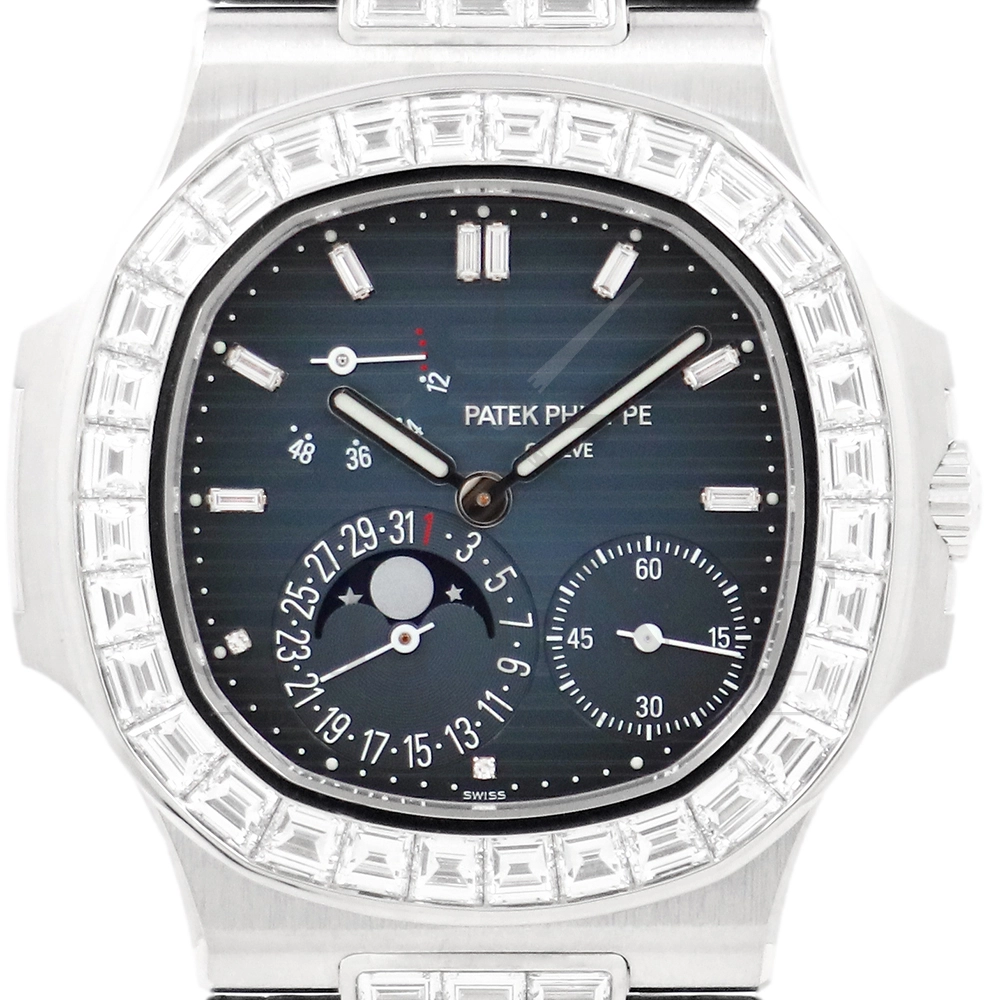 こちらはパテックフィリップ ノーチラス 5724G-001です。パテックフィリップで使用されるダイヤモンドは全てIFのみと厳格な基準を設けており、他ブランドでは味わえない目を奪われるほどの素晴らしい輝きで大変美しい仕上がりとなっております。そしてポインターデイト、ムーンフェイズ、パワーリザーブ表示と多機能ながら防水性も保ち、さらにはマイクロローターにより驚異的な薄さを実現し、パテックフィリップならではの完成度を実現。ケース素材に採用した18Kホワイトゴールドがより一層高級感を与え、伝統的な高級感や美しさを損なわずに、スポーティーさも融合させるなど、この一本だけで最高峰の高級時計ブランドの実力を再認識させてくれるでしょう。所有するだけで確実にご自身のステータスを高めてくれる極上の逸品をぜひご堪能ください。