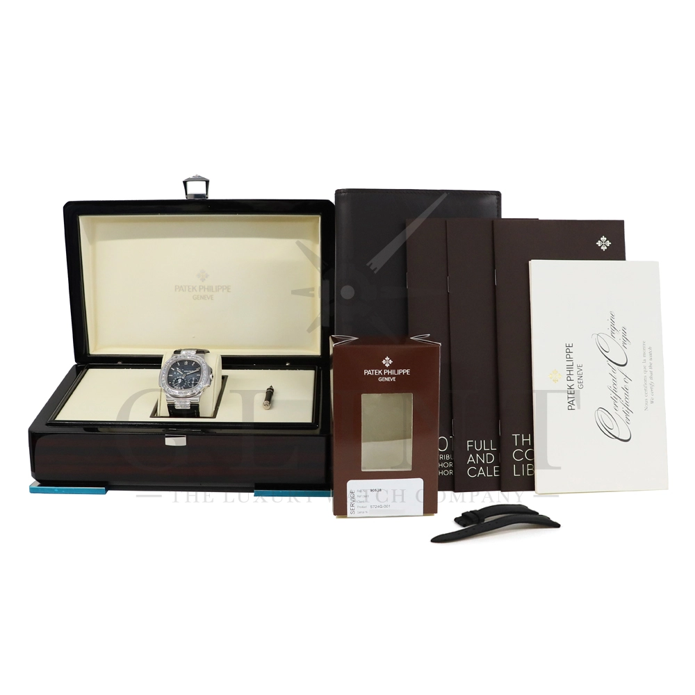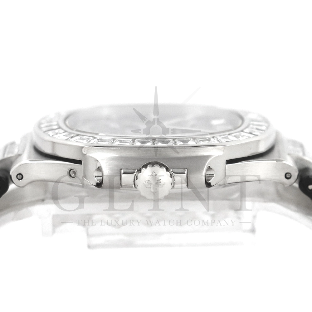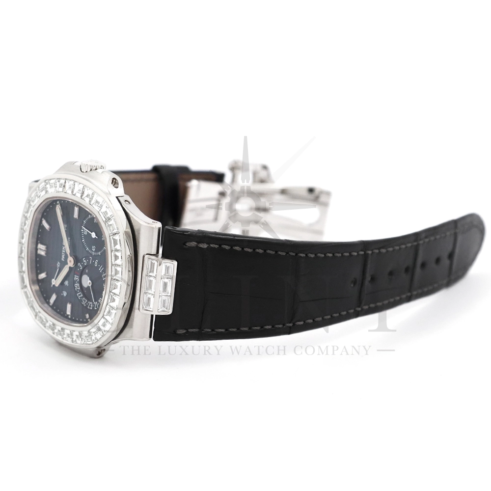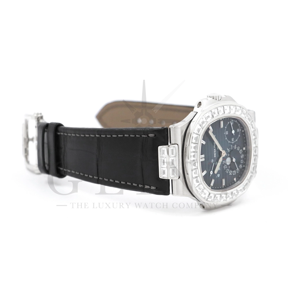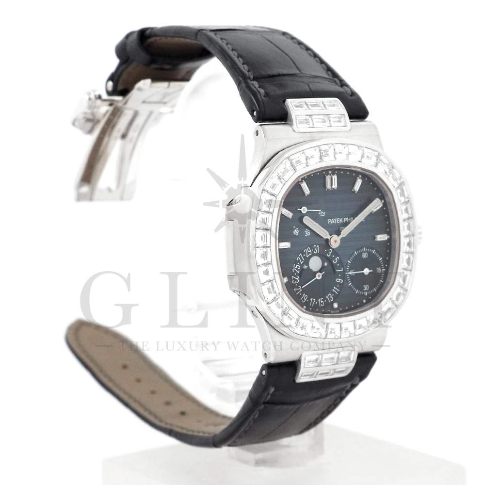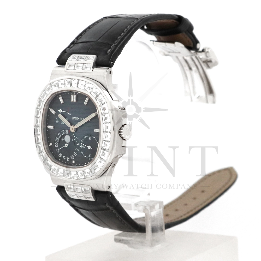 こちらはパテックフィリップ ノーチラス 5724G-001です。パテックフィリップで使用されるダイヤモンドは全てIFのみと厳格な基準を設けており、他ブランドでは味わえない目を奪われるほどの素晴らしい輝きで大変美しい仕上がりとなっております。そしてポインターデイト、ムーンフェイズ、パワーリザーブ表示と多機能ながら防水性も保ち、さらにはマイクロローターにより驚異的な薄さを実現し、パテックフィリップならではの完成度を実現。ケース素材に採用した18Kホワイトゴールドがより一層高級感を与え、伝統的な高級感や美しさを損なわずに、スポーティーさも融合させるなど、この一本だけで最高峰の高級時計ブランドの実力を再認識させてくれるでしょう。所有するだけで確実にご自身のステータスを高めてくれる極上の逸品をぜひご堪能ください。