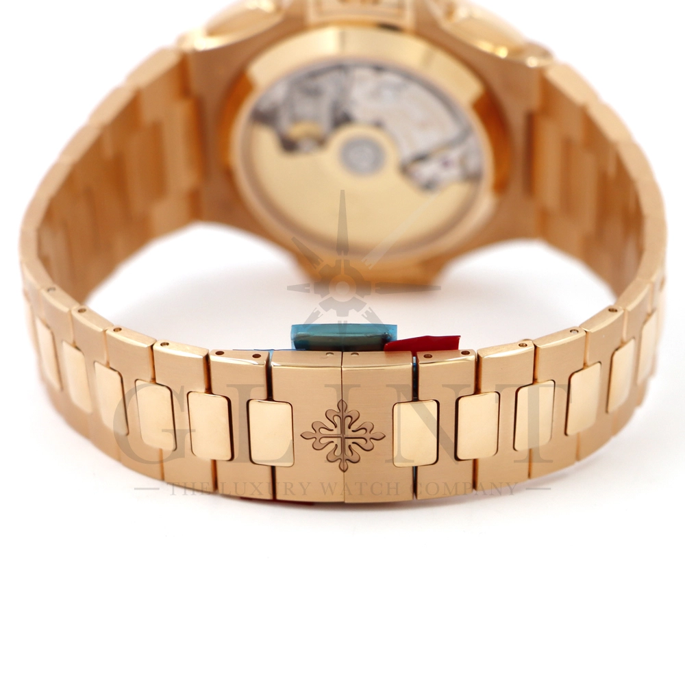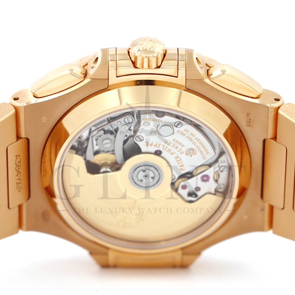 こちらはノーチラス初のスポーツクロノグラフ Ref.5980/1R-001。ケースとベルトにローズゴールドを使用したラグジュアリーなモデルながらも、ブラック・グラデーション文字盤との組み合わせによってシックで上品な雰囲気を演出してくれます。また、見た目の華やかさのみならず、言わずと知れた機能性と信頼性が凝縮された珠玉の一本であり、他のクロノグラフとは一線を画す唯一無二のモデルです。シースルーのケースバックからは、自社開発自動巻きクロノグラフ「Cal.CH28-520」を覗き見る事ができ、機械式時計の最高峰を追及した名門パテックフィリップが作り出す独自の世界観を存分に堪能することができるでしょう。誰もが羨む極上の一本です。