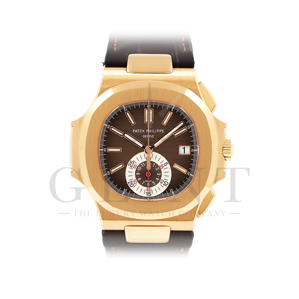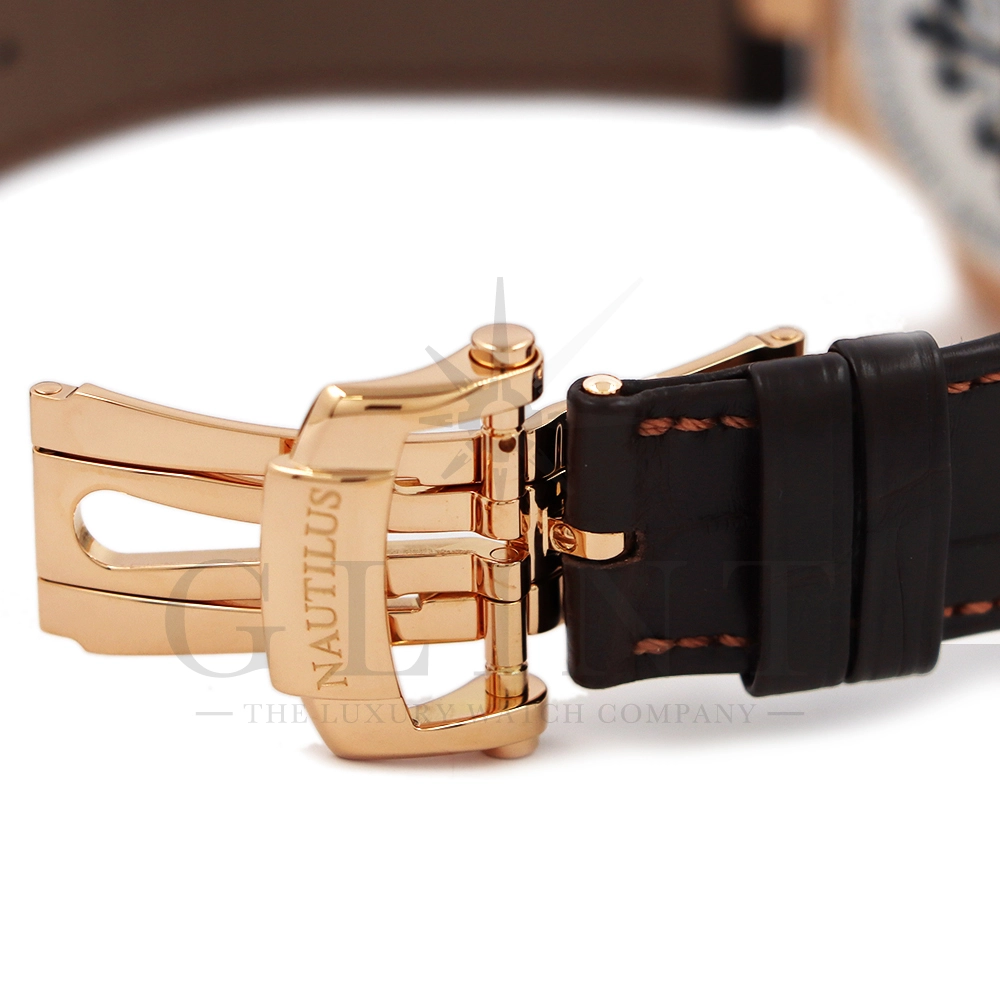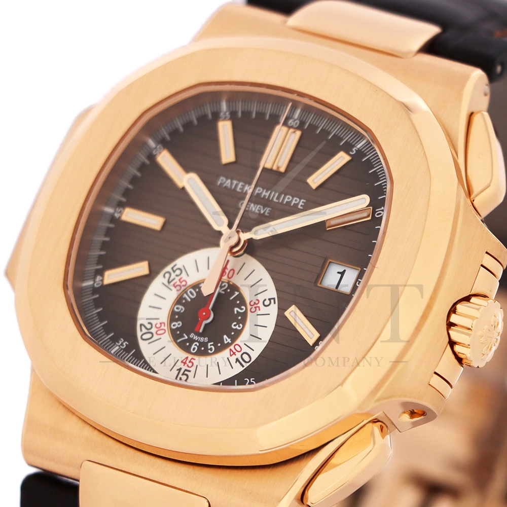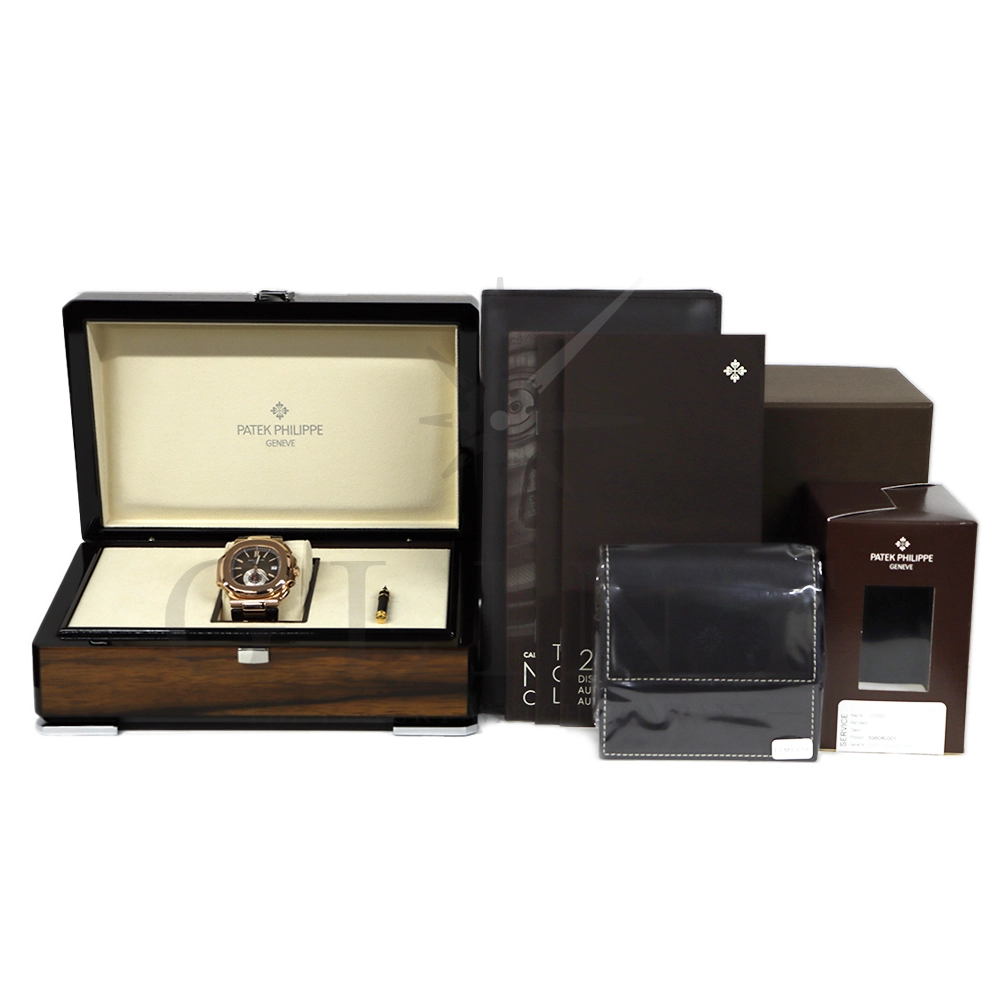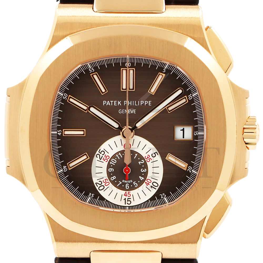 こちらはノーチラス誕生30周年を迎えた際に発表されたパテック・フィリップ ノーチラス クロノグラフです。素材に18Kローズゴールドを使用した高級感溢れるモデル。ローズゴールドモデルにしか配されないブラウンを基調としたグラデーションカラーの文字盤は特別な気持ちにさせてくれるでしょう。6時位置には60分計と12時間計を同軸で統合したクロノグラフ・サブダイアルが備えられており、パテック・フィリップらしい画期的なアイデアが詰め込まれております。ハンドメイドのアリゲーターベルトにはケースと同素材の折り畳み式バックルが付属。腕元にはめた時の装着感も考えられた仕上がりとなっており、ますますパテック・フィリップの虜になる事は間違いありません。世界最高峰の時計技術を堪能できる極上の一本をどうぞお楽しみください。