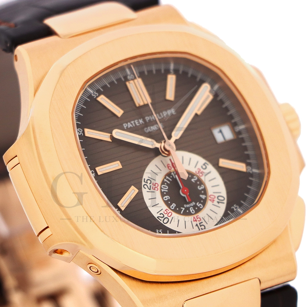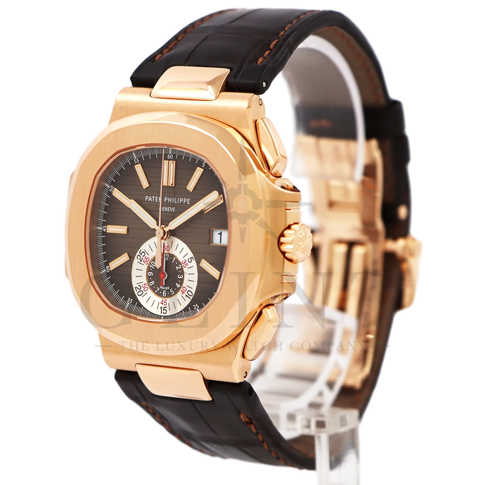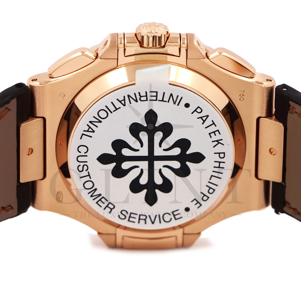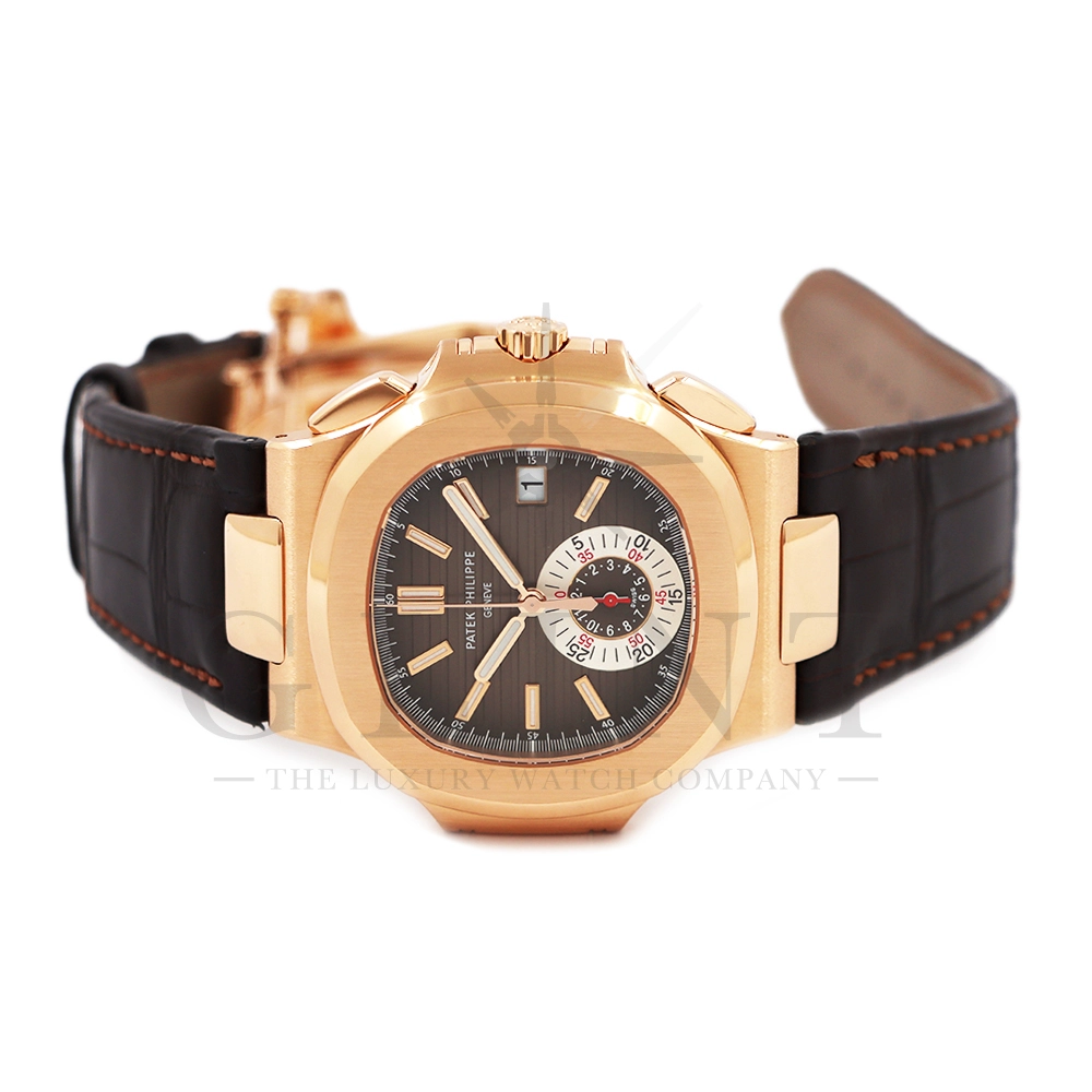 こちらはノーチラス誕生30周年を迎えた際に発表されたパテック・フィリップ ノーチラス クロノグラフです。素材に18Kローズゴールドを使用した高級感溢れるモデル。ローズゴールドモデルにしか配されないブラウンを基調としたグラデーションカラーの文字盤は特別な気持ちにさせてくれるでしょう。6時位置には60分計と12時間計を同軸で統合したクロノグラフ・サブダイアルが備えられており、パテック・フィリップらしい画期的なアイデアが詰め込まれております。ハンドメイドのアリゲーターベルトにはケースと同素材の折り畳み式バックルが付属。腕元にはめた時の装着感も考えられた仕上がりとなっており、ますますパテック・フィリップの虜になる事は間違いありません。世界最高峰の時計技術を堪能できる極上の一本をどうぞお楽しみください。