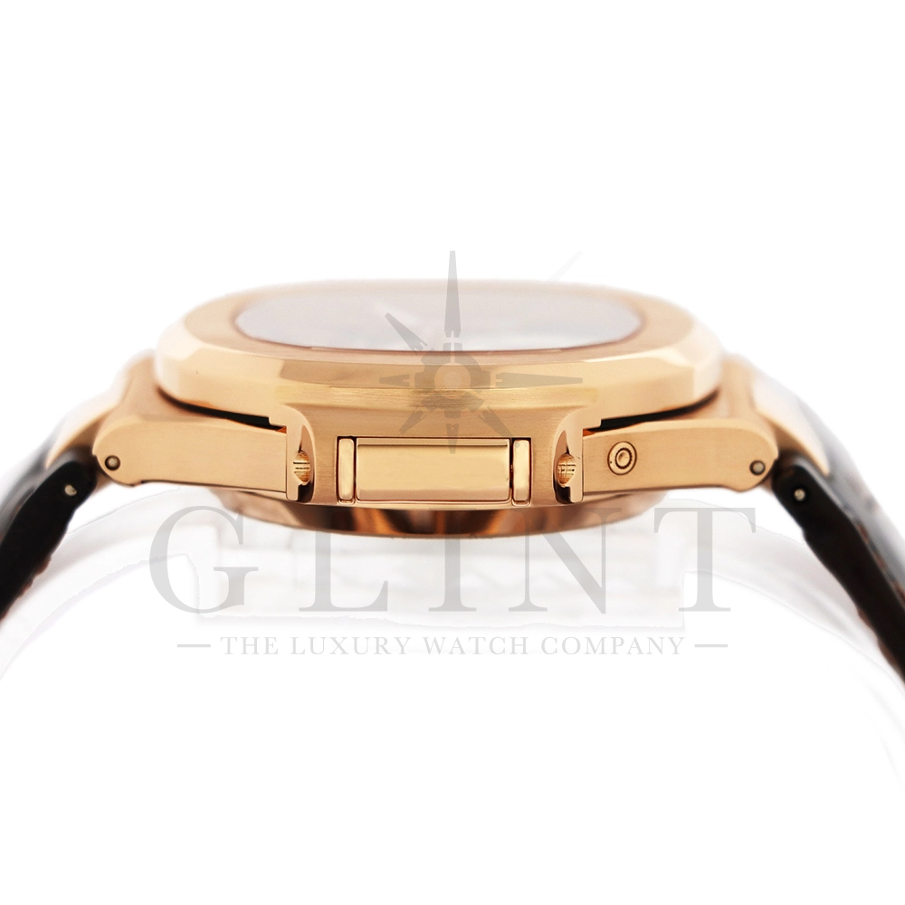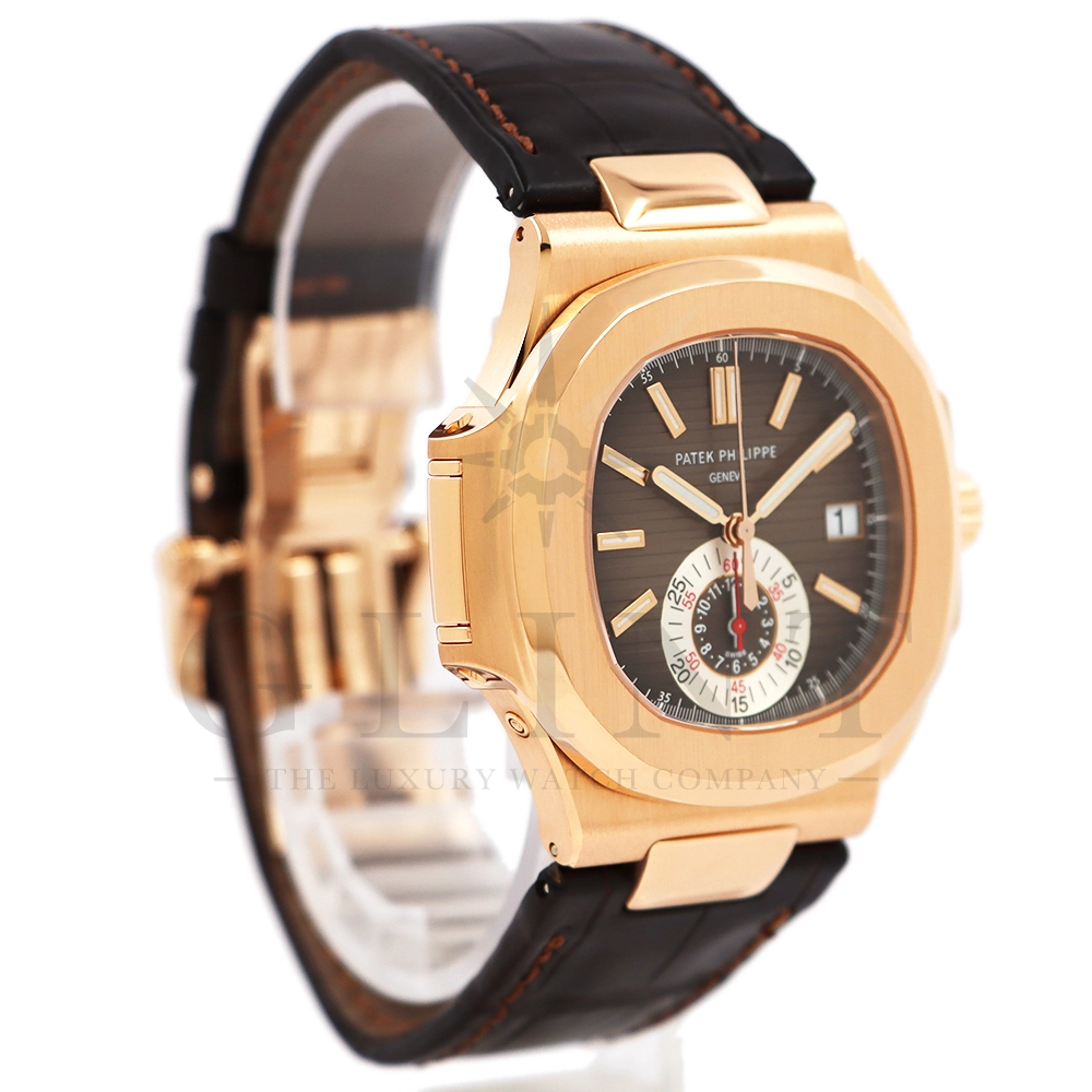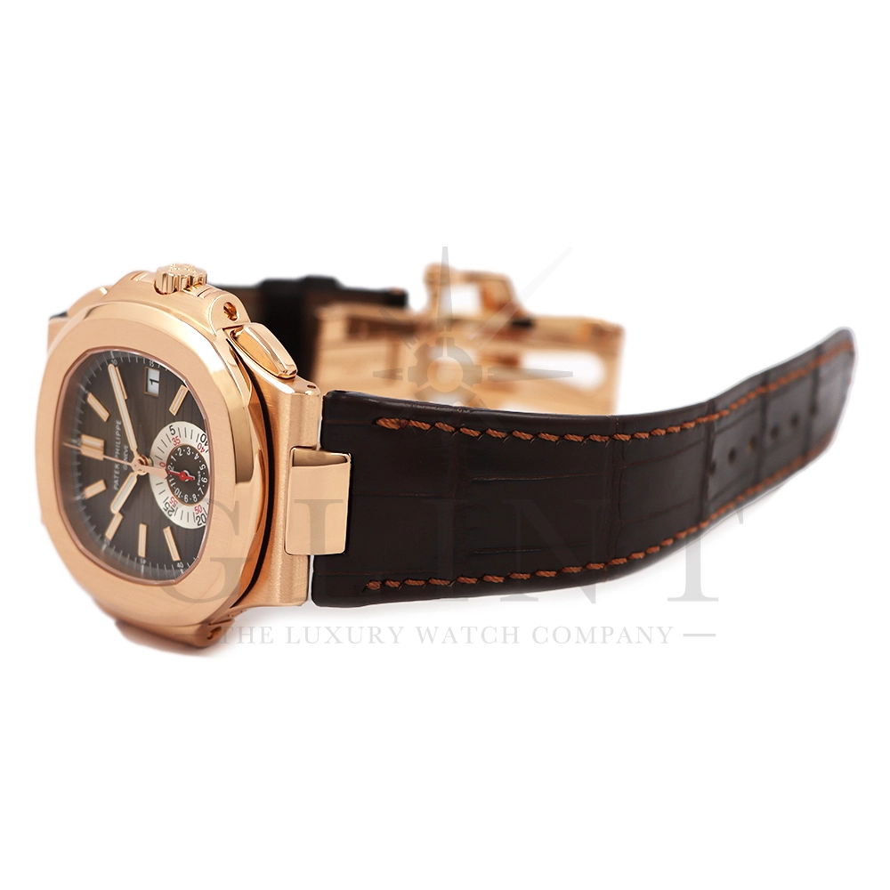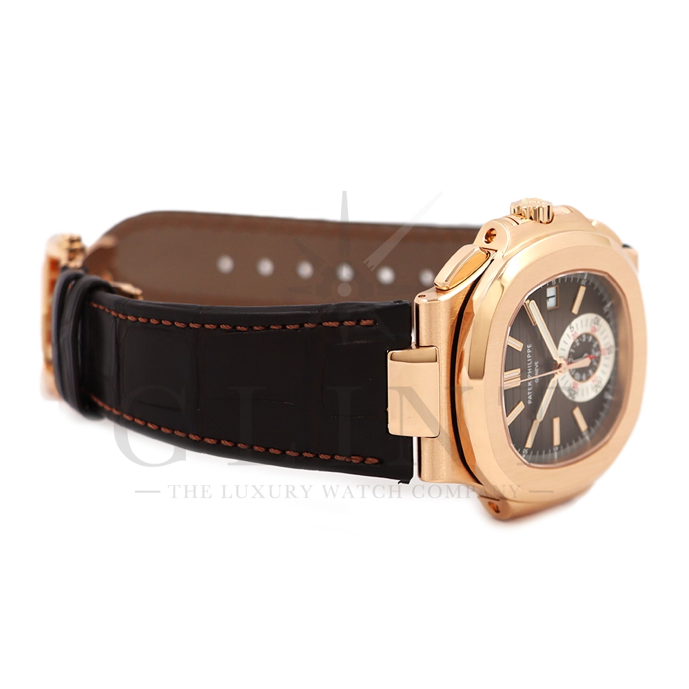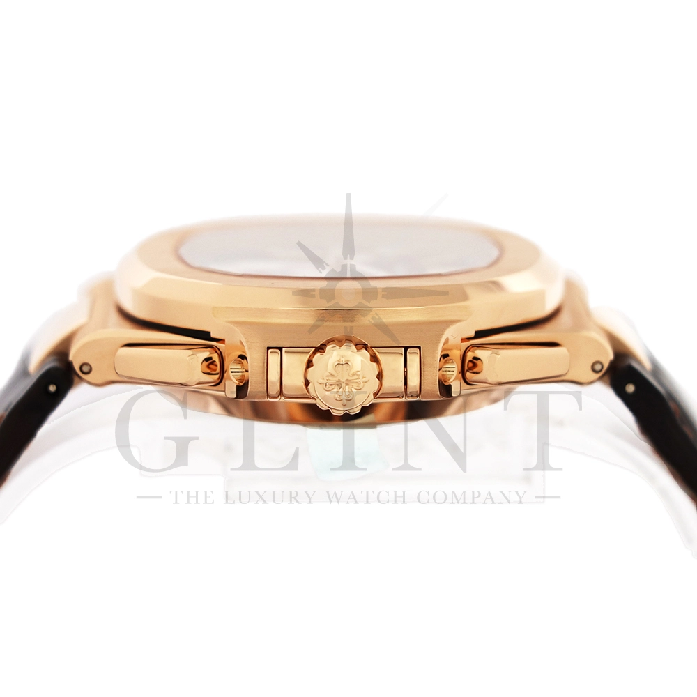 こちらはノーチラス誕生30周年を迎えた際に発表されたパテック・フィリップ ノーチラス クロノグラフです。素材に18Kローズゴールドを使用した高級感溢れるモデル。ローズゴールドモデルにしか配されないブラウンを基調としたグラデーションカラーの文字盤は特別な気持ちにさせてくれるでしょう。6時位置には60分計と12時間計を同軸で統合したクロノグラフ・サブダイアルが備えられており、パテック・フィリップらしい画期的なアイデアが詰め込まれております。ハンドメイドのアリゲーターベルトにはケースと同素材の折り畳み式バックルが付属。腕元にはめた時の装着感も考えられた仕上がりとなっており、ますますパテック・フィリップの虜になる事は間違いありません。世界最高峰の時計技術を堪能できる極上の一本をどうぞお楽しみください。