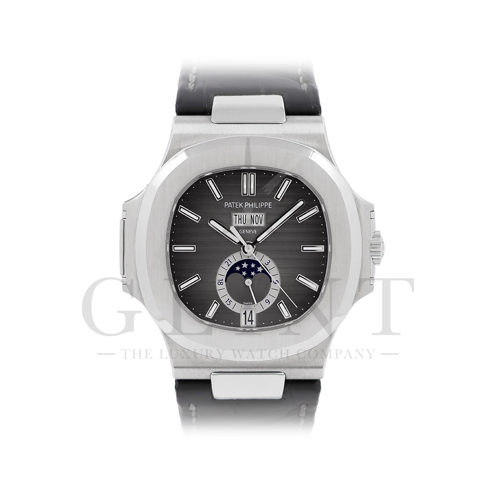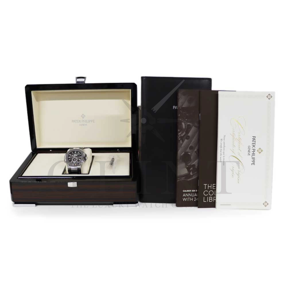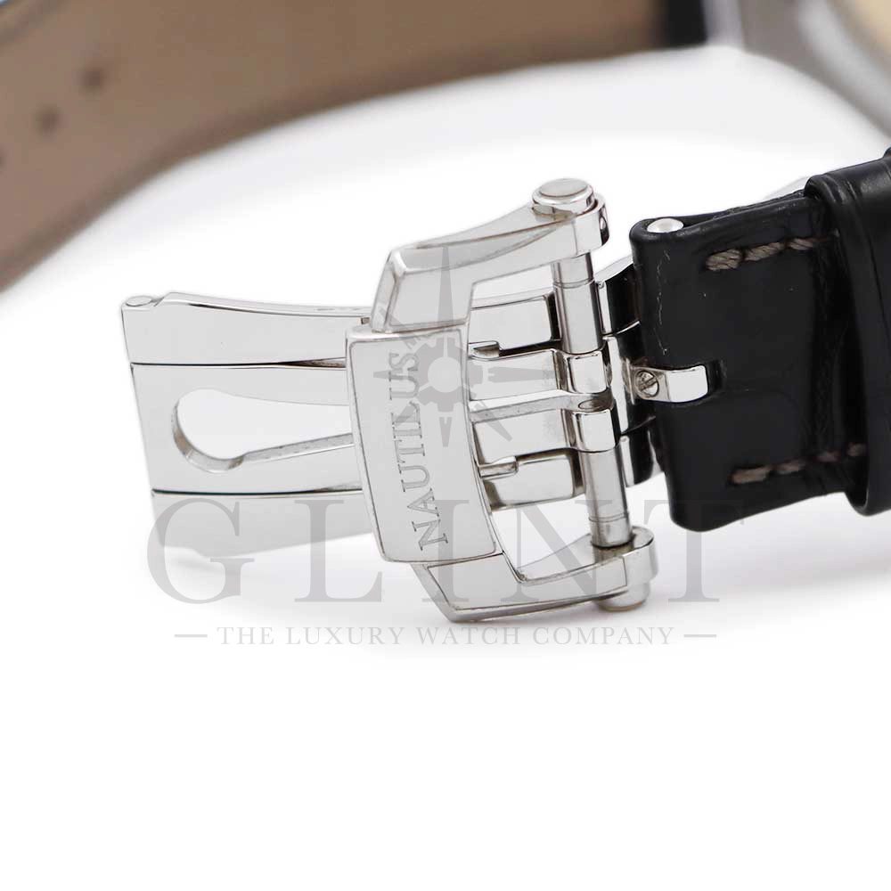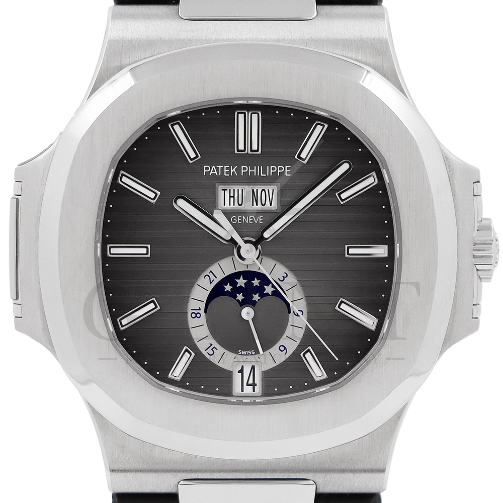 こちらはパテックフィリップ ノーチラス 5726A-001です。日付の調整は年に一度、3月1日に行うだけといったアニュアルカレンダーを搭載し、窓表示の曜日・日付・月、ムーンフェイズ、24時間表示サブダイヤルと多機能を備えておりますが、ノーチラスの特徴である水平エンボス文字盤の美しさを損ねることはない素晴らしいダイヤルレイアウトとなっております。また、多機能モデルでありながらもムーブメントを5.78mmまで薄く作り込んだことによってケース厚は11.3mmに抑え、3針モデルと遜色のないフィット感から使い心地は抜群です。マットブラックのアリゲーターベルトとの相性は非常に良く、スポーティーながら落ち着いた雰囲気を演出してくれます。ビジネスシーンやカジュアルに過ごす休日など、全てのシーンでワンランク上の存在感を味わえる希少な一本です。