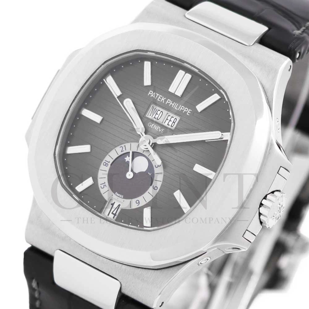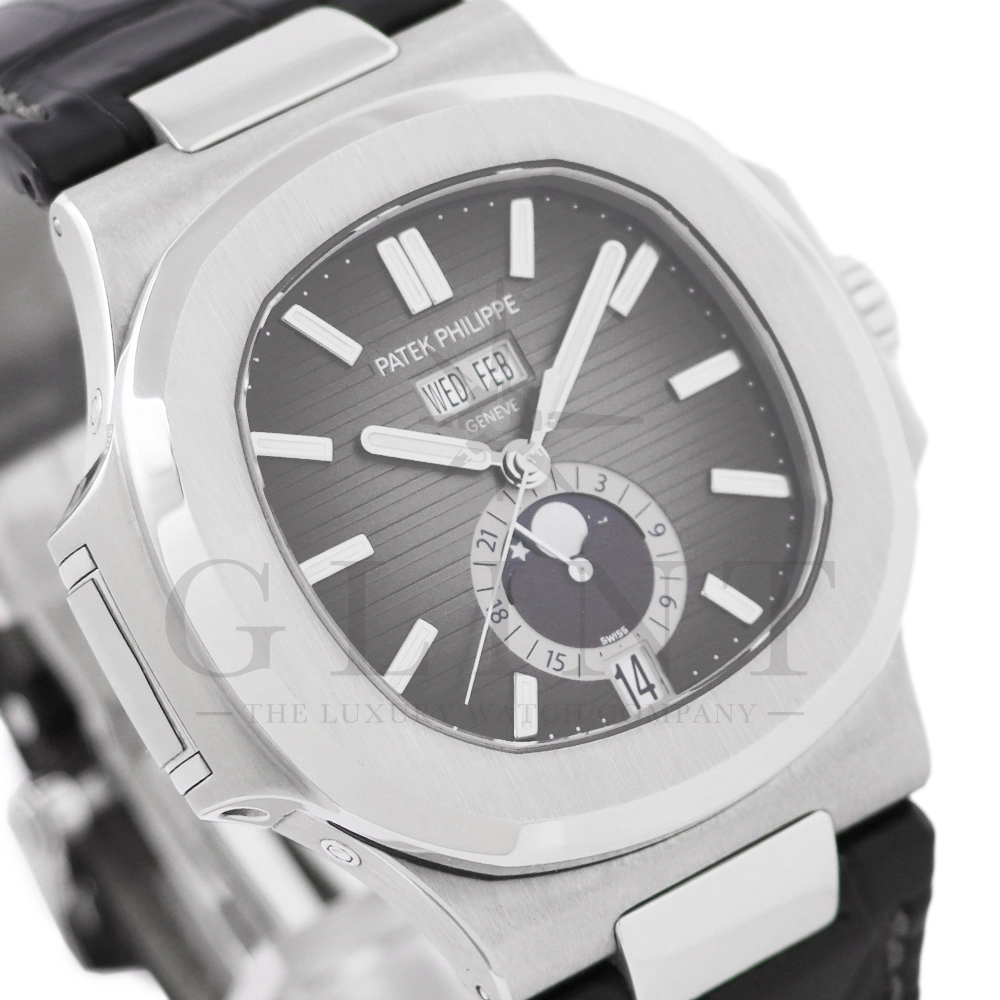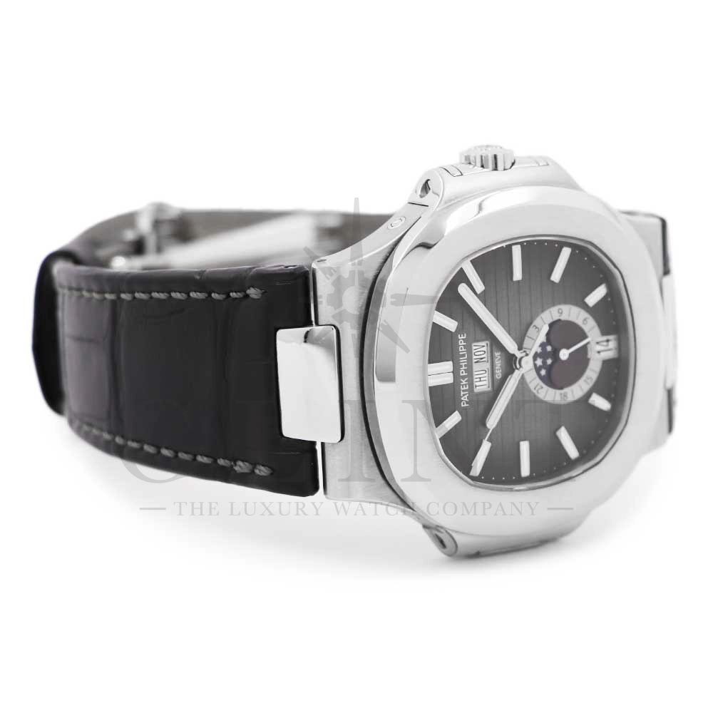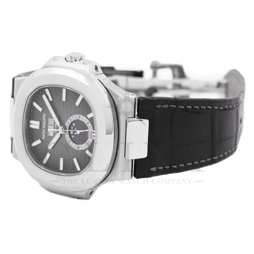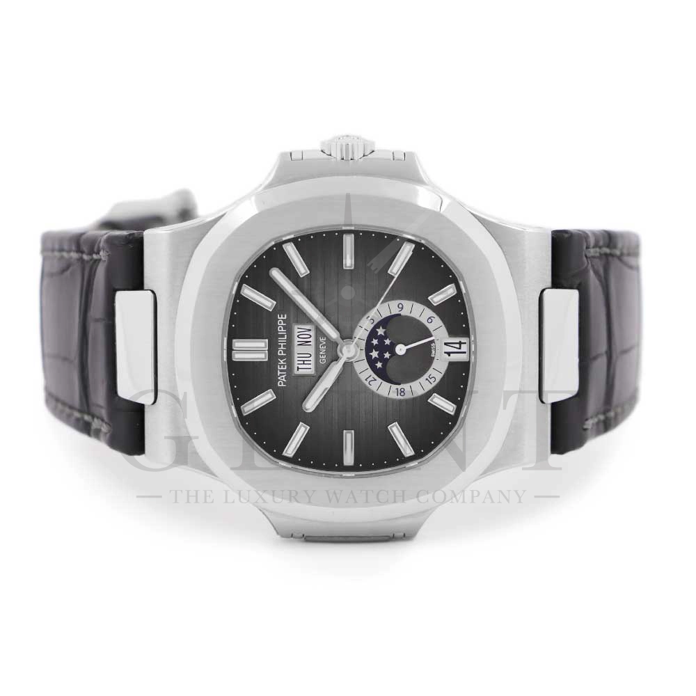 こちらはパテックフィリップ ノーチラス 5726A-001です。日付の調整は年に一度、3月1日に行うだけといったアニュアルカレンダーを搭載し、窓表示の曜日・日付・月、ムーンフェイズ、24時間表示サブダイヤルと多機能を備えておりますが、ノーチラスの特徴である水平エンボス文字盤の美しさを損ねることはない素晴らしいダイヤルレイアウトとなっております。また、多機能モデルでありながらもムーブメントを5.78mmまで薄く作り込んだことによってケース厚は11.3mmに抑え、3針モデルと遜色のないフィット感から使い心地は抜群です。マットブラックのアリゲーターベルトとの相性は非常に良く、スポーティーながら落ち着いた雰囲気を演出してくれます。ビジネスシーンやカジュアルに過ごす休日など、全てのシーンでワンランク上の存在感を味わえる希少な一本です。