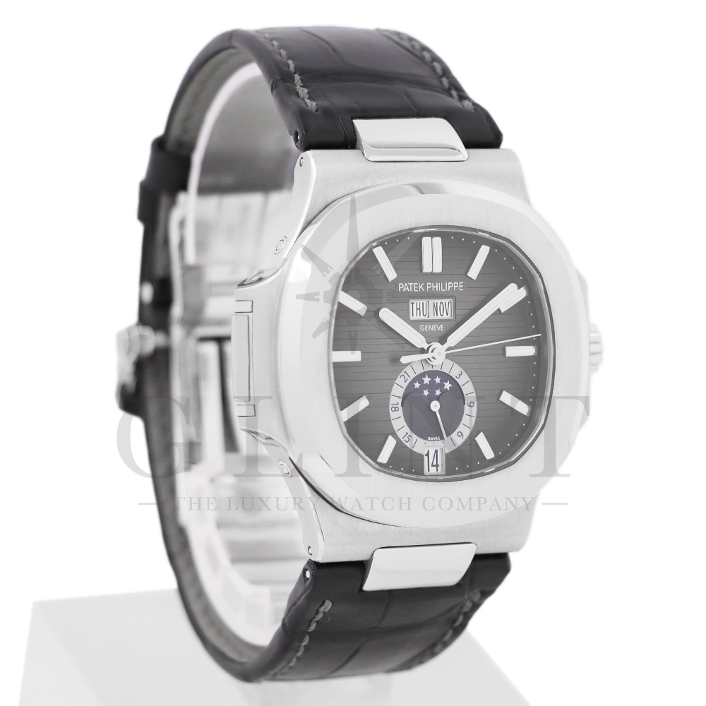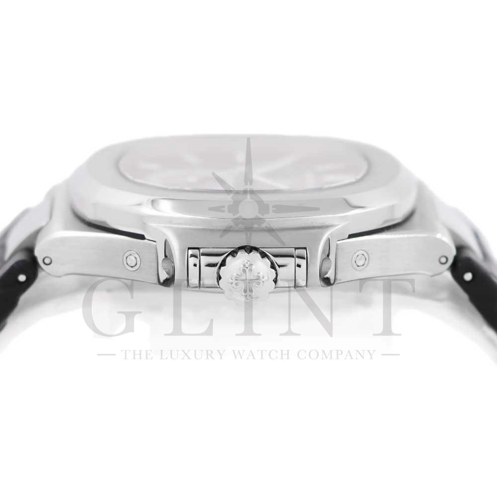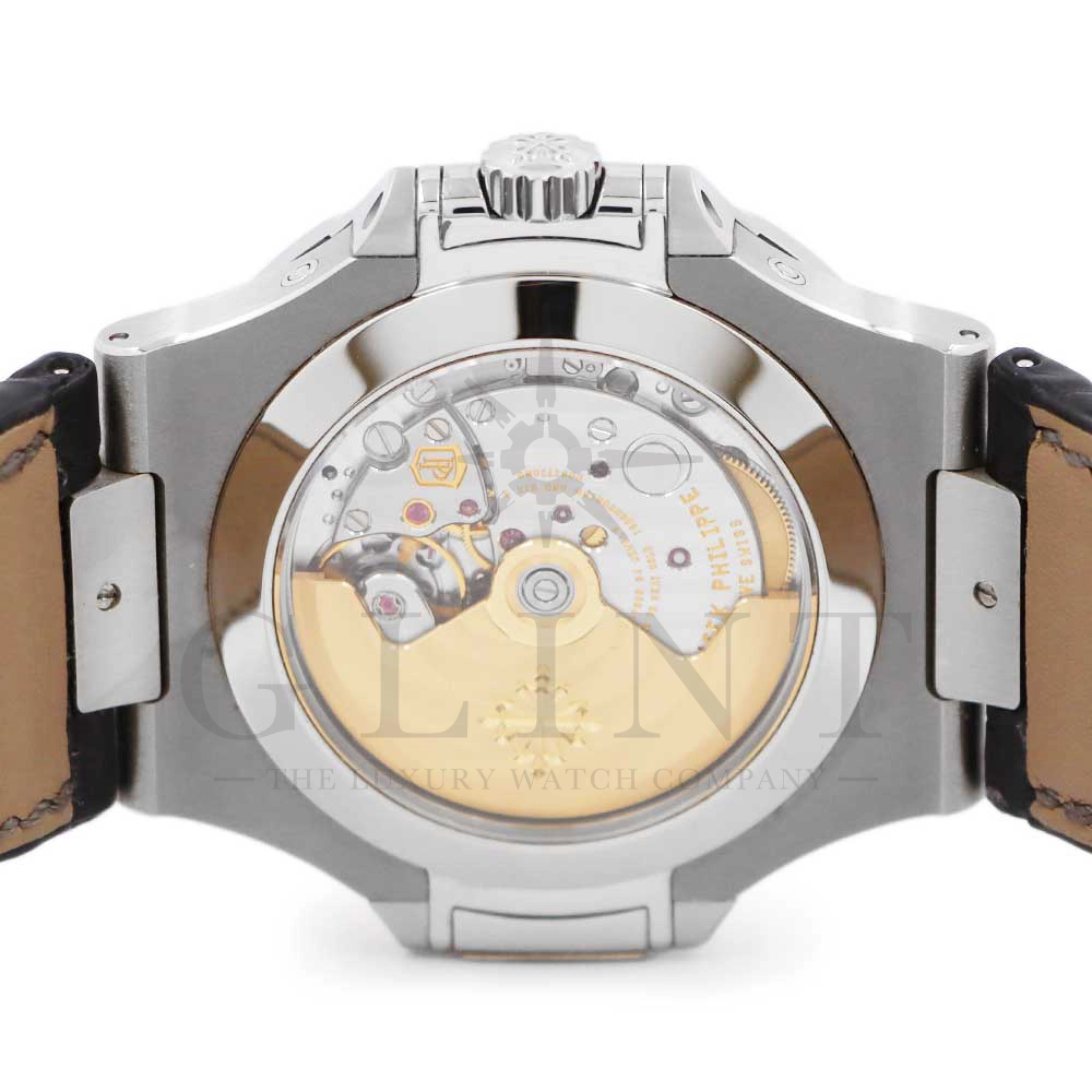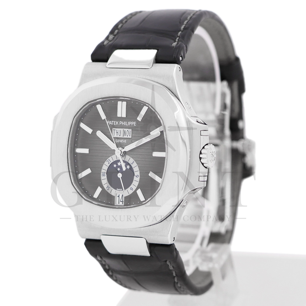こちらはパテックフィリップ ノーチラス 5726A-001です。日付の調整は年に一度、3月1日に行うだけといったアニュアルカレンダーを搭載し、窓表示の曜日・日付・月、ムーンフェイズ、24時間表示サブダイヤルと多機能を備えておりますが、ノーチラスの特徴である水平エンボス文字盤の美しさを損ねることはない素晴らしいダイヤルレイアウトとなっております。また、多機能モデルでありながらもムーブメントを5.78mmまで薄く作り込んだことによってケース厚は11.3mmに抑え、3針モデルと遜色のないフィット感から使い心地は抜群です。マットブラックのアリゲーターベルトとの相性は非常に良く、スポーティーながら落ち着いた雰囲気を演出してくれます。ビジネスシーンやカジュアルに過ごす休日など、全てのシーンでワンランク上の存在感を味わえる希少な一本です。