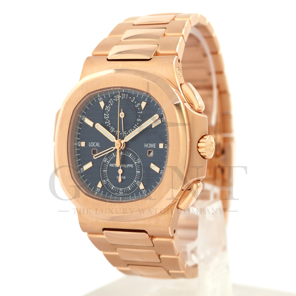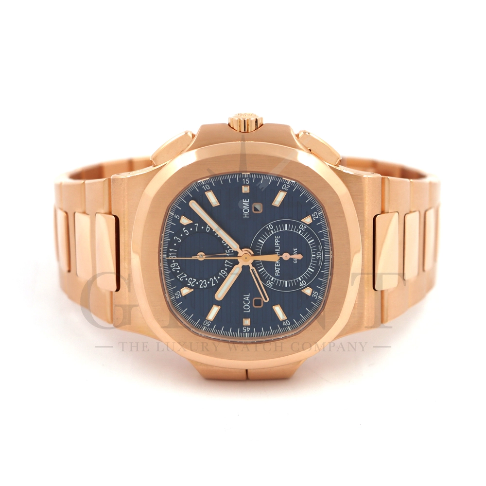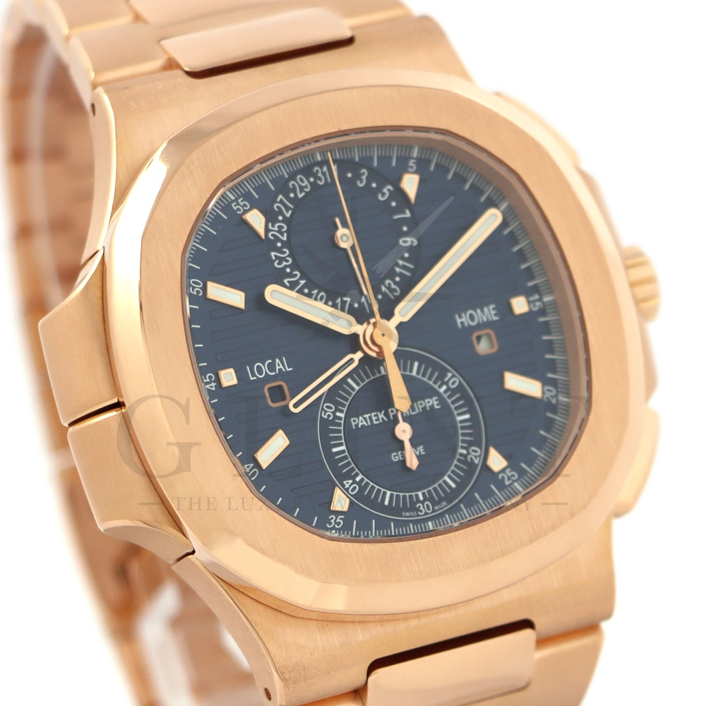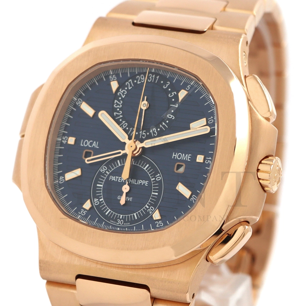こちらはノーチラス トラベルタイム クロノグラフです。2021年に登場した非常に魅力的なトラベルタイム・クロノグラフの最新の進化形、ローズゴールド製の5990/1R-001。暖かみのあるブルー・ソレイユのダイヤルには、ゴールドのアクセント、アプライドの夜光マーカー、ローズゴールドの針が配されており、多くのコレクターを夢中にさせるノーチラスのルック&フィールと共に、優れた視認性を実現しております。トラベルタイムは重なり合う2本の時針により、2つの異なったタイムゾーンの時刻を一目で判るように表示する機構で、こちらのモデルは出発地と現地の2つの昼夜窓表示を搭載。12時位置には日付を指針表示されており、実用性に優れております。搭載されている自動巻きクロノグラフムーブメント Cal.CH 28-520 C FUSの垂直クラッチが非常に優れており、クロノグラフ作動時のエネルギーロスがほとんど無い為、6時側に位置するクロノグラフ秒針を通常秒針として使用する事も可能です。機械式時計の最高峰を追及した名門パテックフィリップの卓越した技術を心ゆくまで堪能できる至極の一本と言えるでしょう。