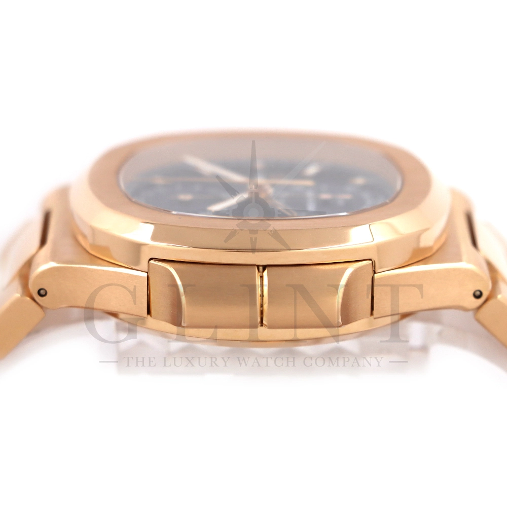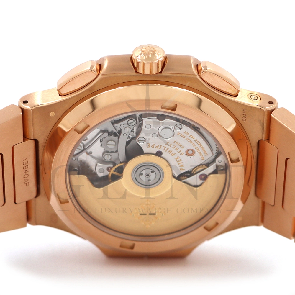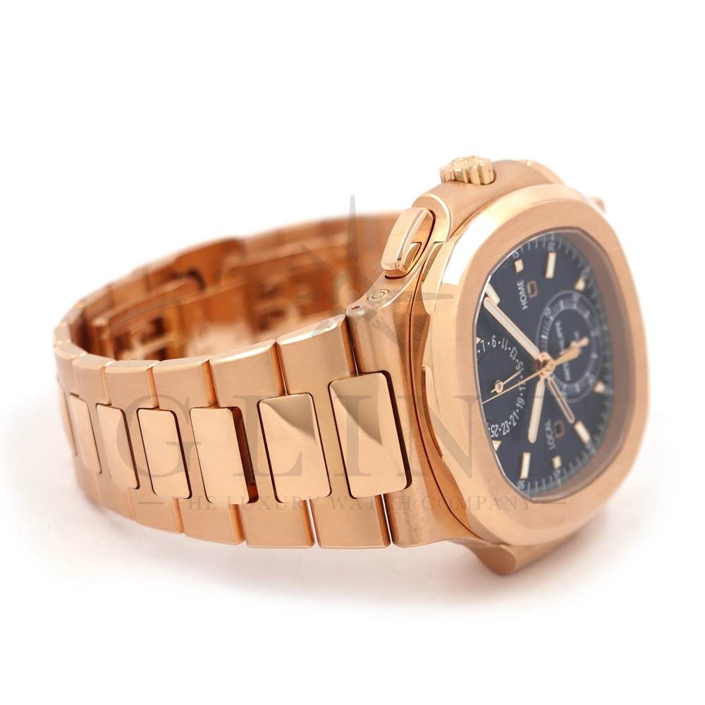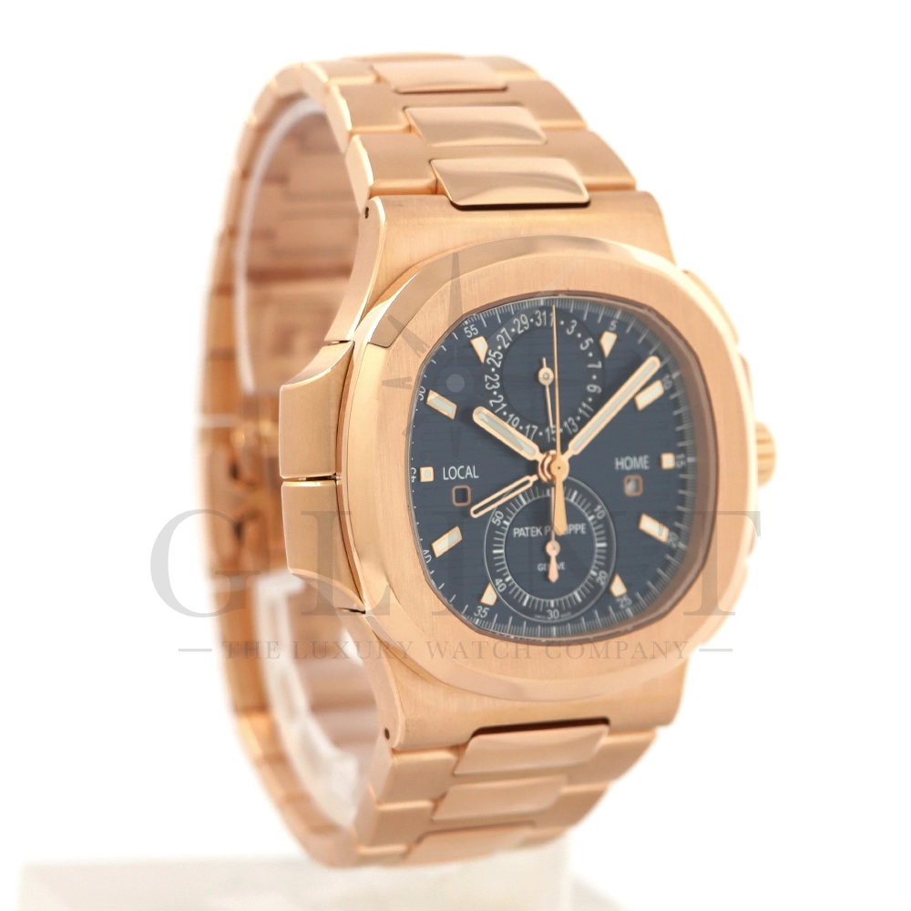 こちらはノーチラス トラベルタイム クロノグラフです。2021年に登場した非常に魅力的なトラベルタイム・クロノグラフの最新の進化形、ローズゴールド製の5990/1R-001。暖かみのあるブルー・ソレイユのダイヤルには、ゴールドのアクセント、アプライドの夜光マーカー、ローズゴールドの針が配されており、多くのコレクターを夢中にさせるノーチラスのルック&フィールと共に、優れた視認性を実現しております。トラベルタイムは重なり合う2本の時針により、2つの異なったタイムゾーンの時刻を一目で判るように表示する機構で、こちらのモデルは出発地と現地の2つの昼夜窓表示を搭載。12時位置には日付を指針表示されており、実用性に優れております。搭載されている自動巻きクロノグラフムーブメント Cal.CH 28-520 C FUSの垂直クラッチが非常に優れており、クロノグラフ作動時のエネルギーロスがほとんど無い為、6時側に位置するクロノグラフ秒針を通常秒針として使用する事も可能です。機械式時計の最高峰を追及した名門パテックフィリップの卓越した技術を心ゆくまで堪能できる至極の一本と言えるでしょう。