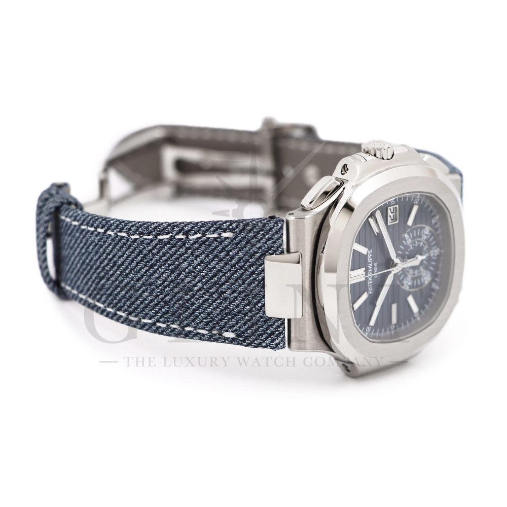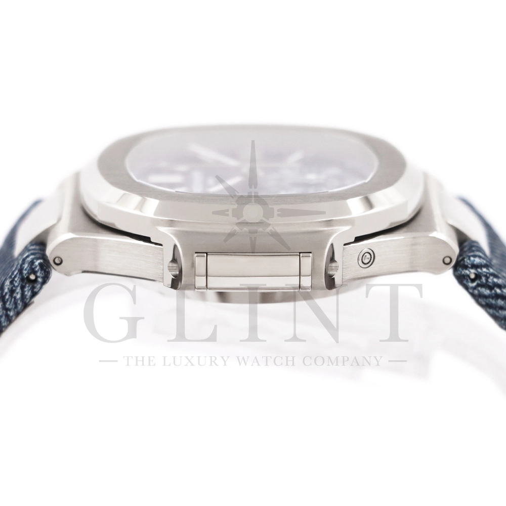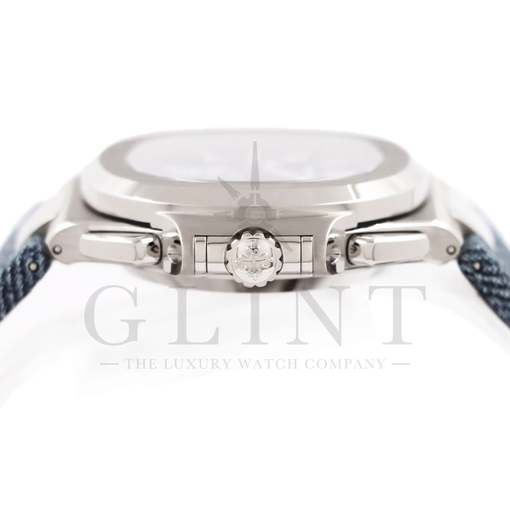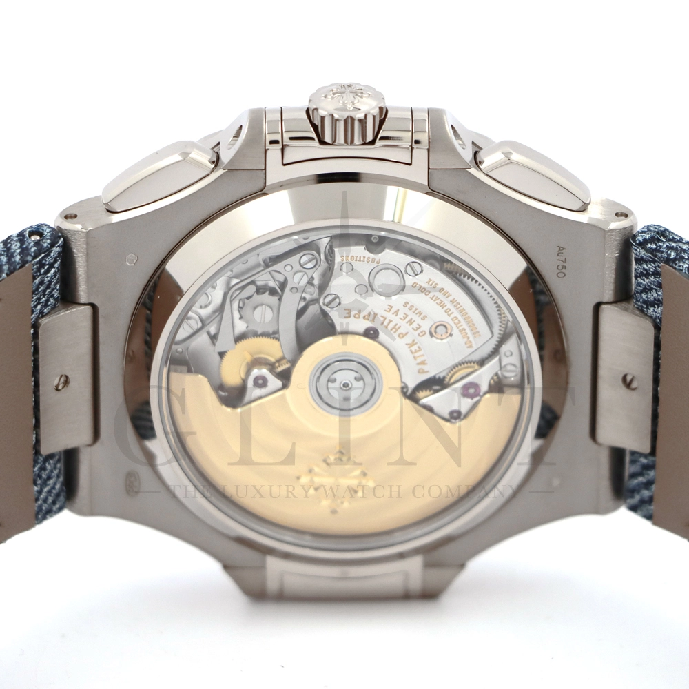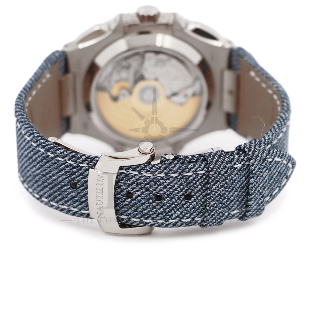 ストラップ:デニム柄、ハンド・ステッチのブルーグレー・カーフスキン・バンド ホワイトゴールド・ノーチラス折り畳み式バックル