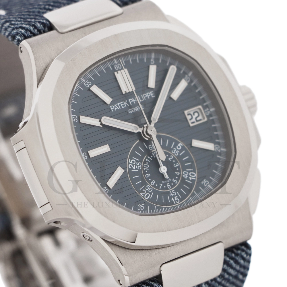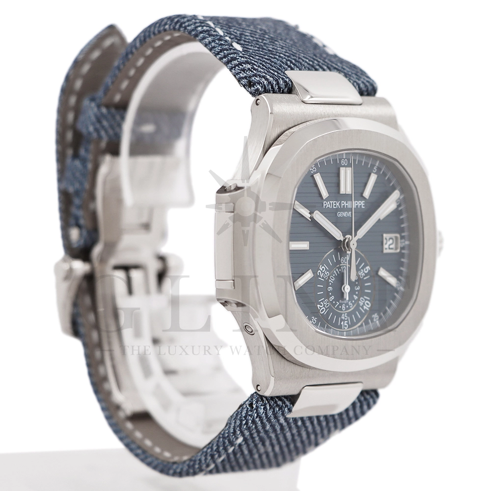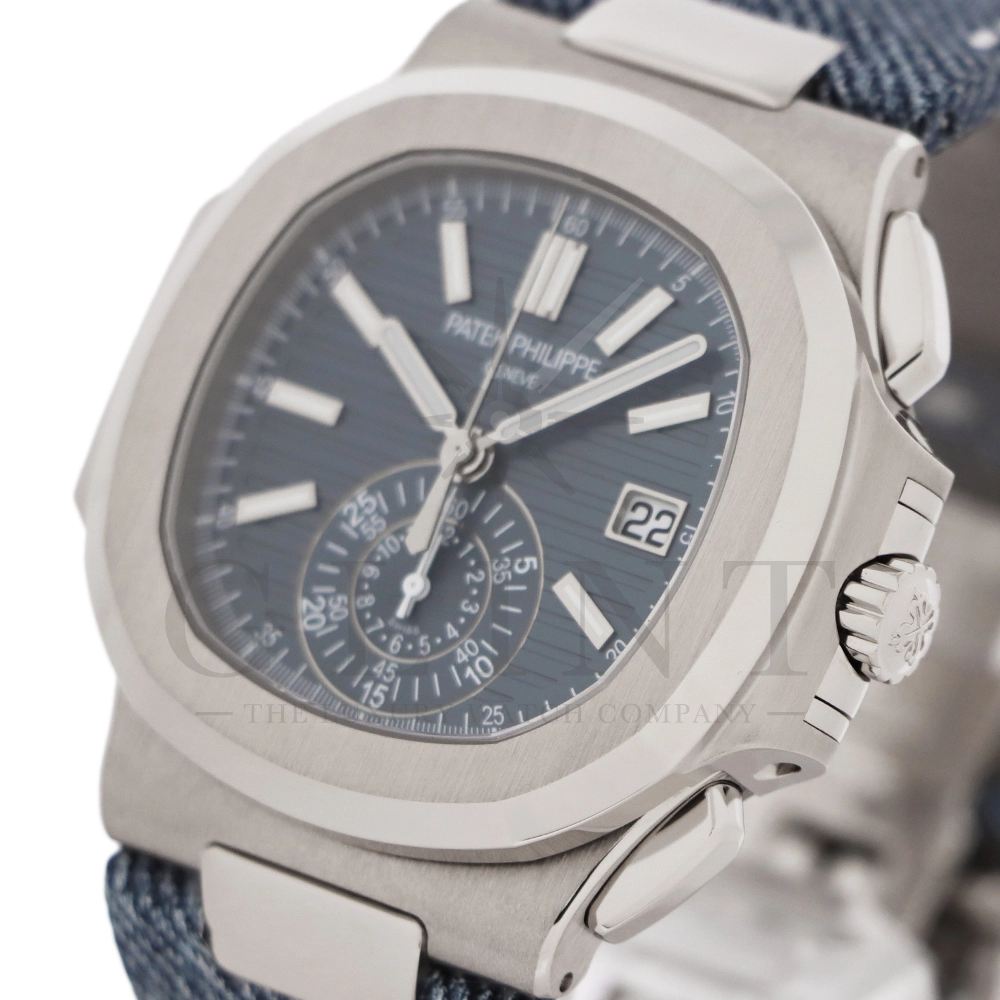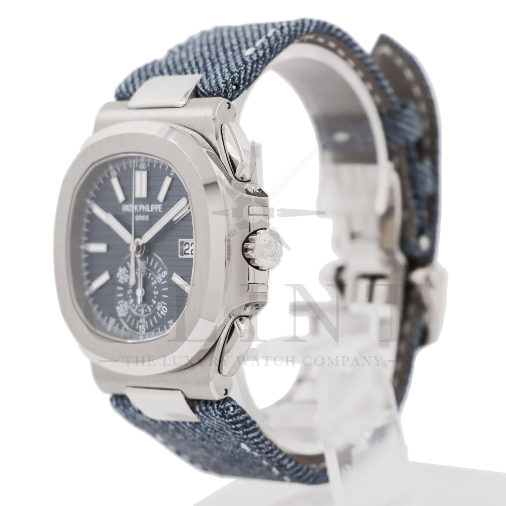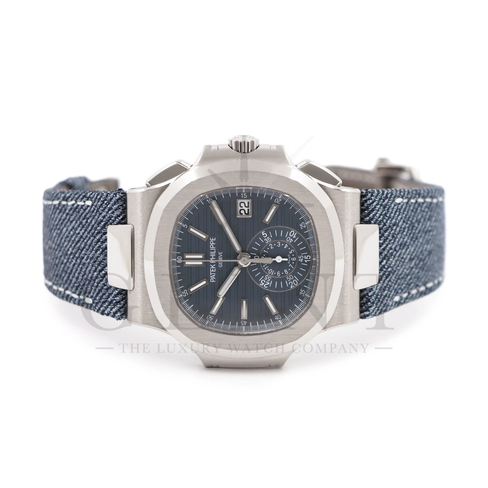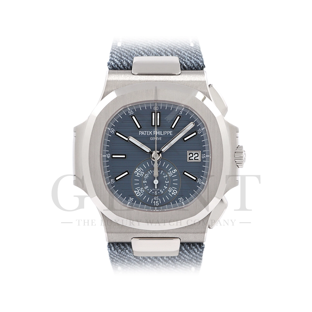 ストラップ:デニム柄、ハンド・ステッチのブルーグレー・カーフスキン・バンド ホワイトゴールド・ノーチラス折り畳み式バックル