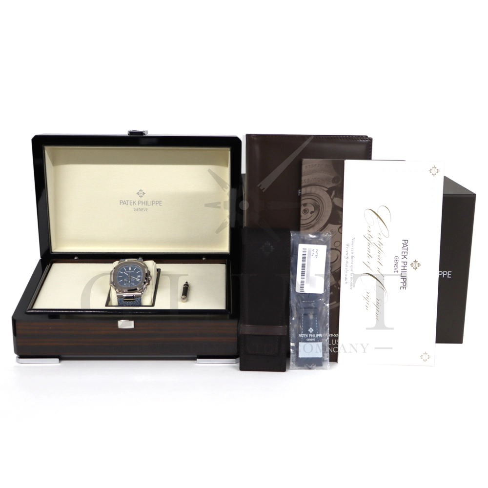 こちらはパテックフィリップ ノーチラス クロノグラフです。2024年新作モデルとして登場し、素材にホワイトゴールドを使用した5980/60G-001。ホワイト・ステッチを施したブルーグレーのデニム柄カーフスキン・バンドに、ブルーグレー・オパーリン文字盤との相性も抜群です。3つの同心円状の目盛を備えたクロノグラフ表示は、独自の読みやすい大きな6時位置の一体型サブダイヤル上にグループ化されており、センター・クロノグラフ秒針は、常時作動させてセンターセコンドとしても使用できます。ファブリック柄のブルーグレー・コンポジット・バンドも同梱されており、気分によって付け替えが可能。クラシックなモノトーンブルーのデザインを全面に打ち出すことでより落ち着いた高級感を演出してくれるでしょう。世界最高峰の時計技術を堪能できる極上の一本をどうぞお楽しみください。