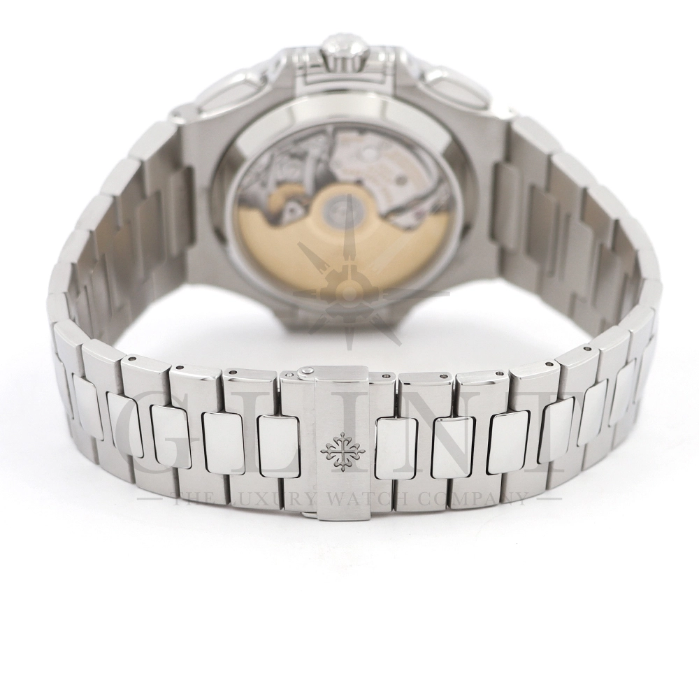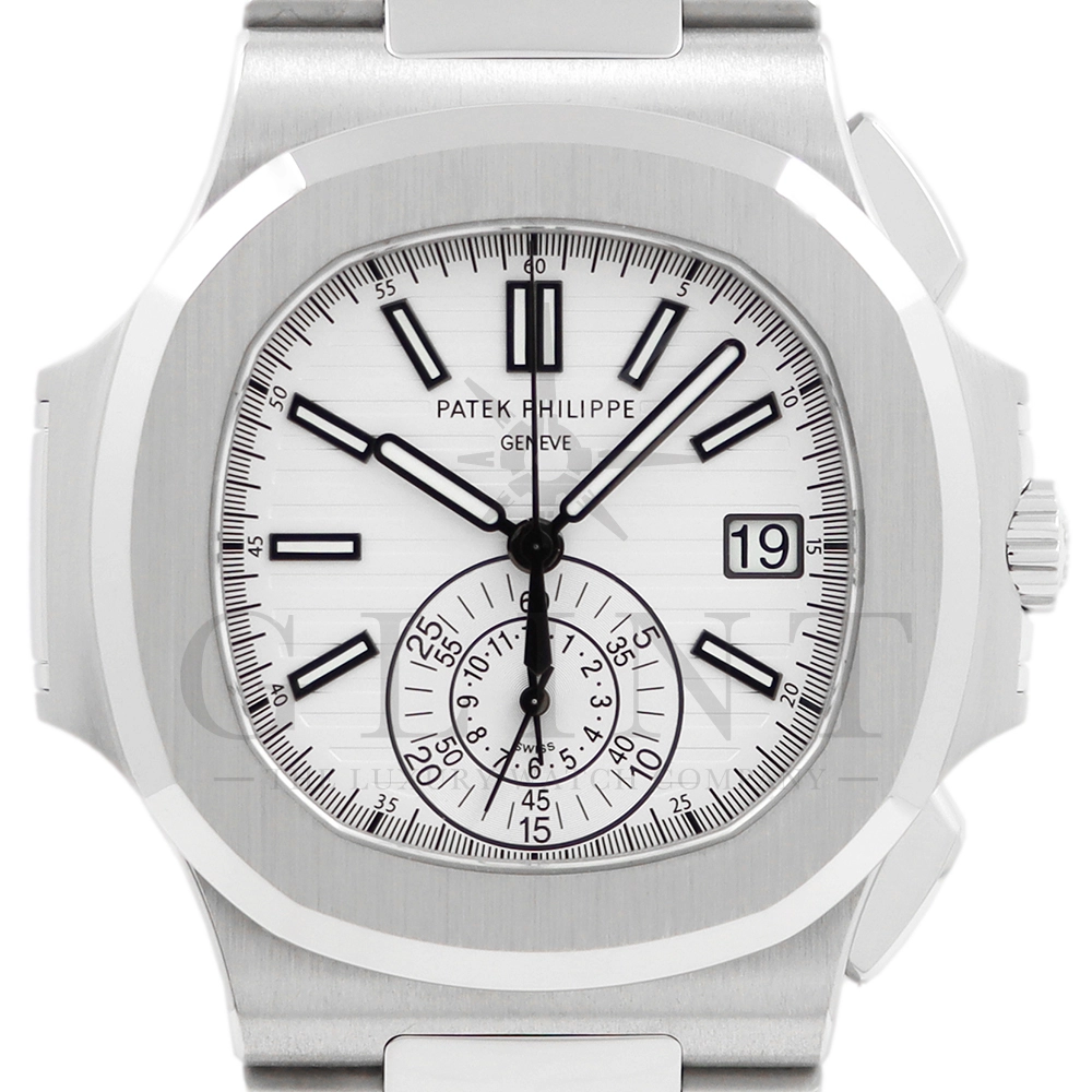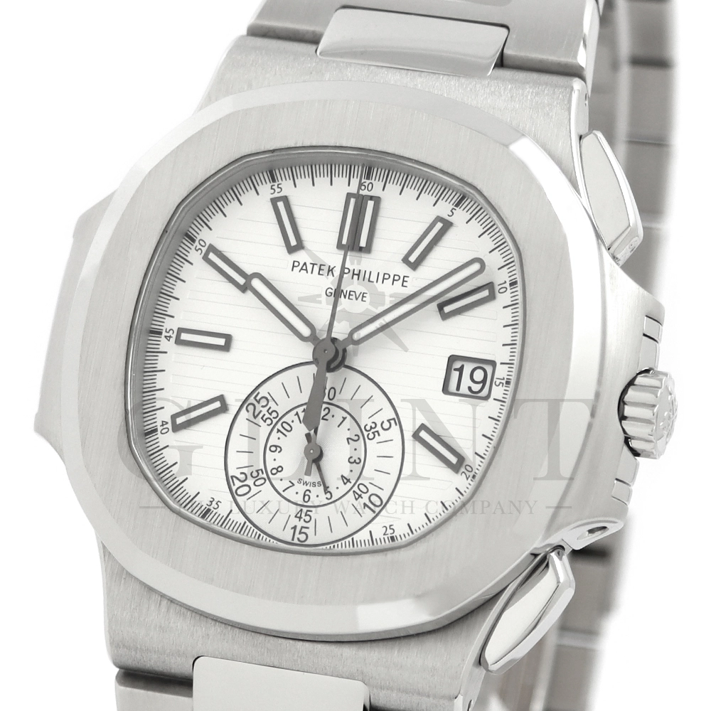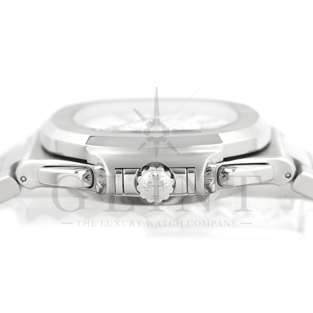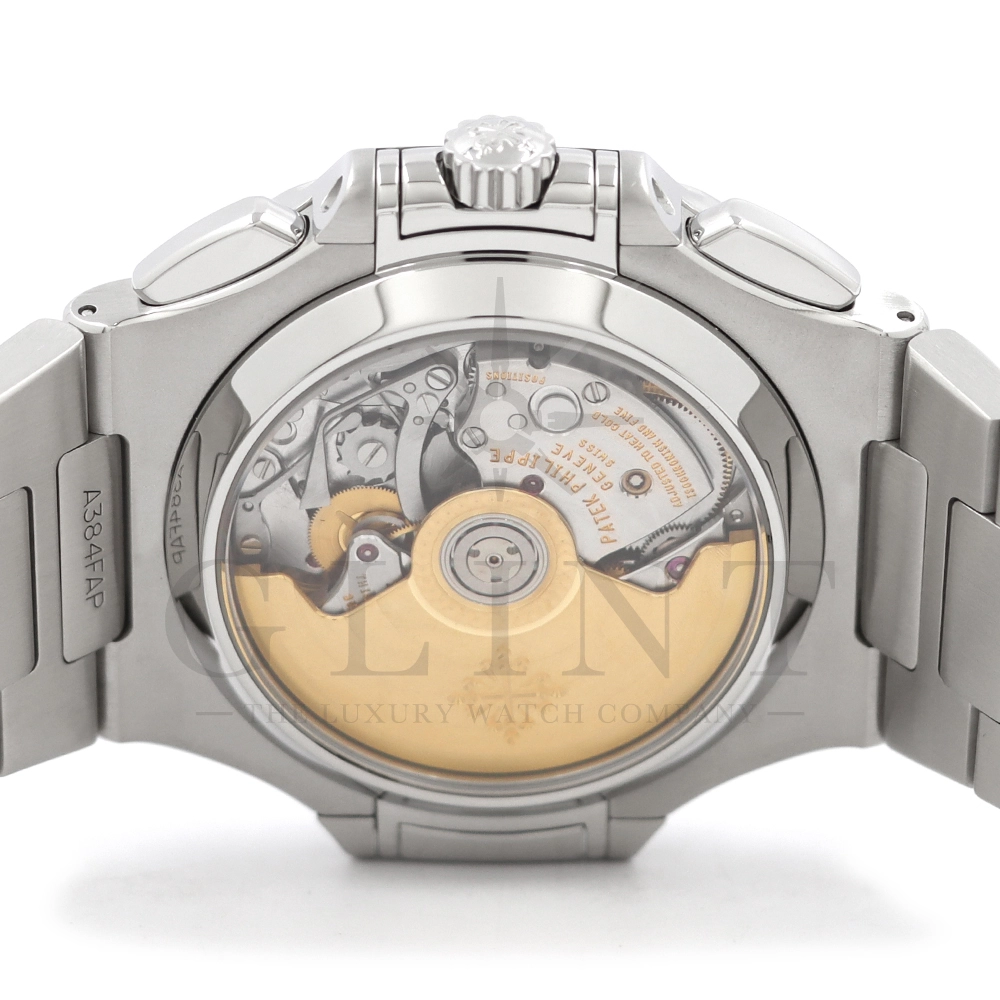 こちらはノーチラス クロノグラフです。爽やかで光沢感のあるホワイト文字盤が目を惹くこちらは、2012年に登場し僅か2年程の製造期間となっているため、希少性の高いモデルのひとつとして数えられています。シースルーのケースバックからは、自社開発自動巻きクロノグラフ「Cal.CH28-520」を覗き見る事ができ、機械式時計の最高峰を追及した名門パテックフィリップが作り出す独自の世界観を存分に堪能することができるでしょう。ビジネスシーンやカジュアルに過ごす休日など、全てのシーンでワンランク上の存在感を味わえる希少な一本です。