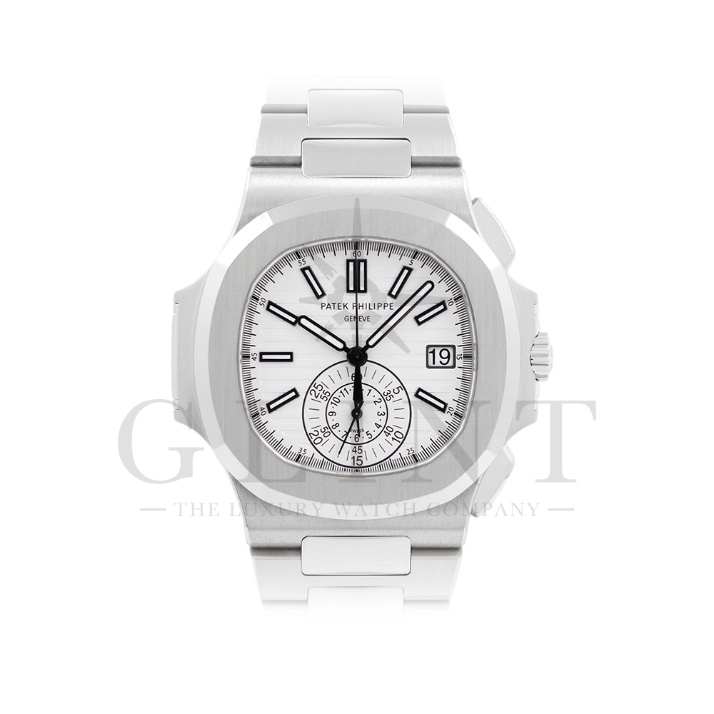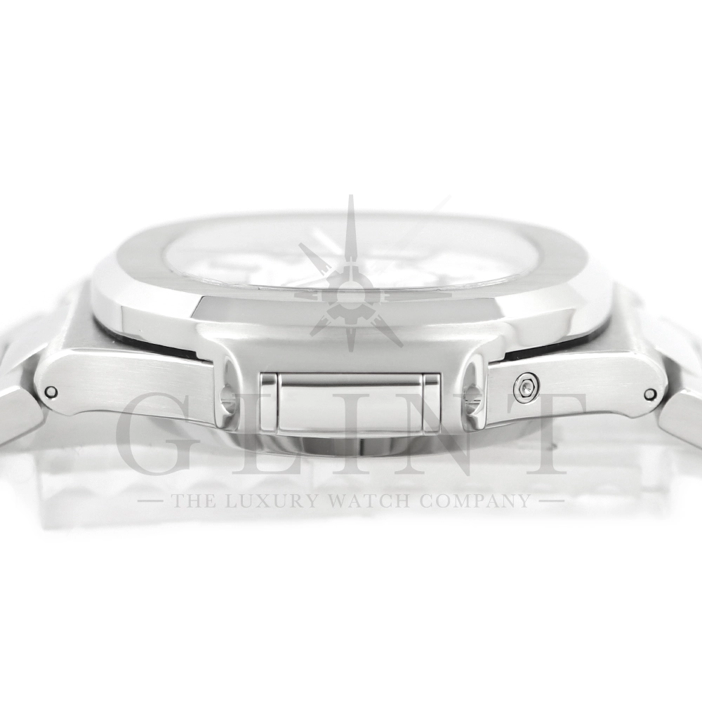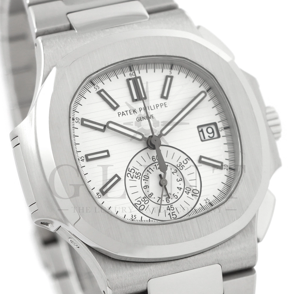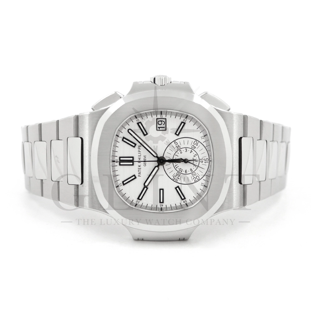 こちらはノーチラス クロノグラフです。爽やかで光沢感のあるホワイト文字盤が目を惹くこちらは、2012年に登場し僅か2年程の製造期間となっているため、希少性の高いモデルのひとつとして数えられています。シースルーのケースバックからは、自社開発自動巻きクロノグラフ「Cal.CH28-520」を覗き見る事ができ、機械式時計の最高峰を追及した名門パテックフィリップが作り出す独自の世界観を存分に堪能することができるでしょう。ビジネスシーンやカジュアルに過ごす休日など、全てのシーンでワンランク上の存在感を味わえる希少な一本です。