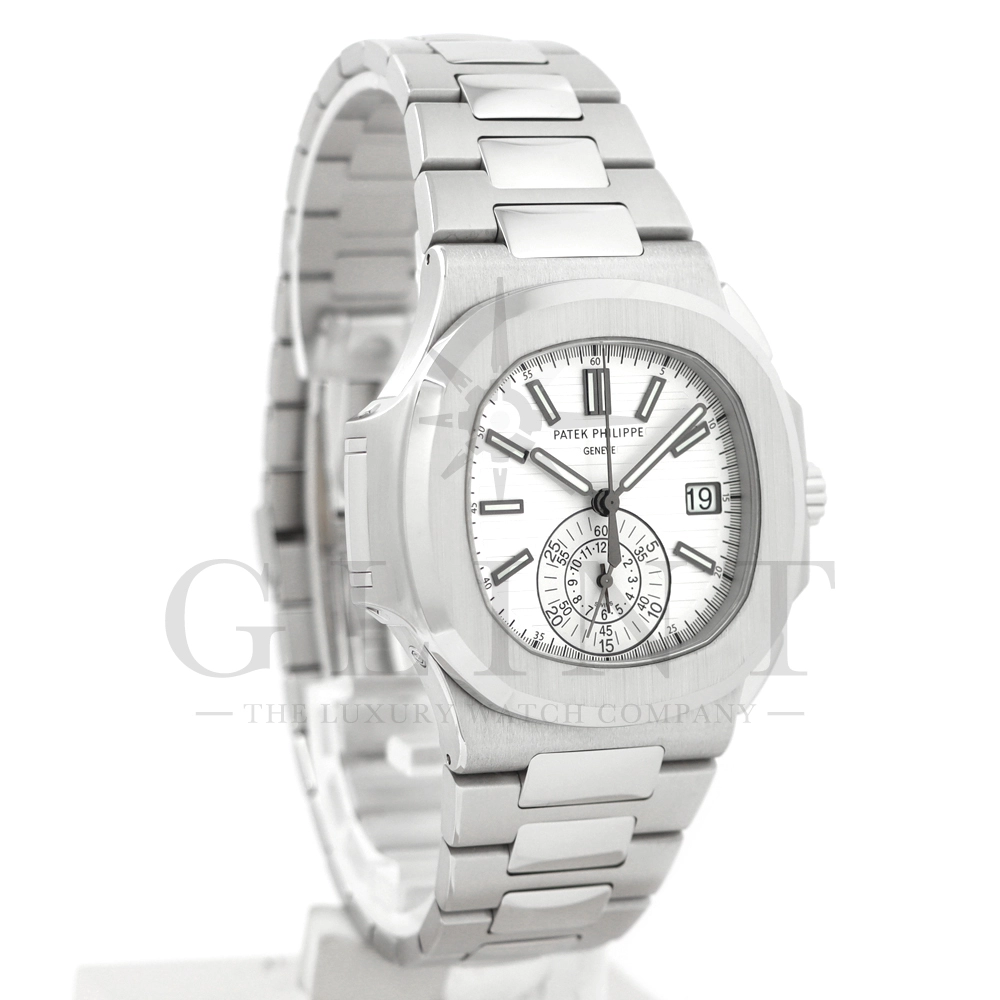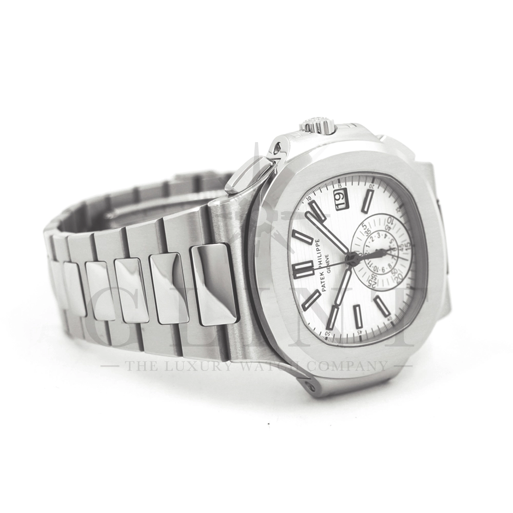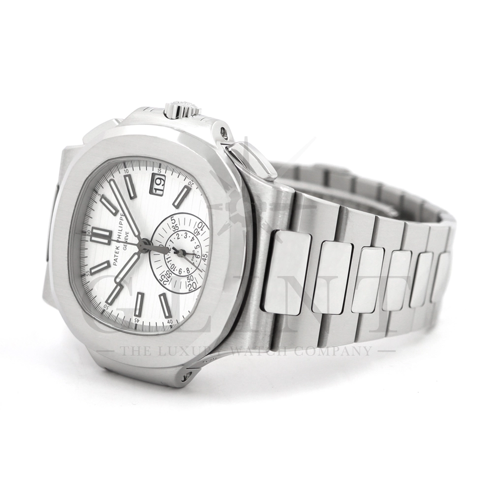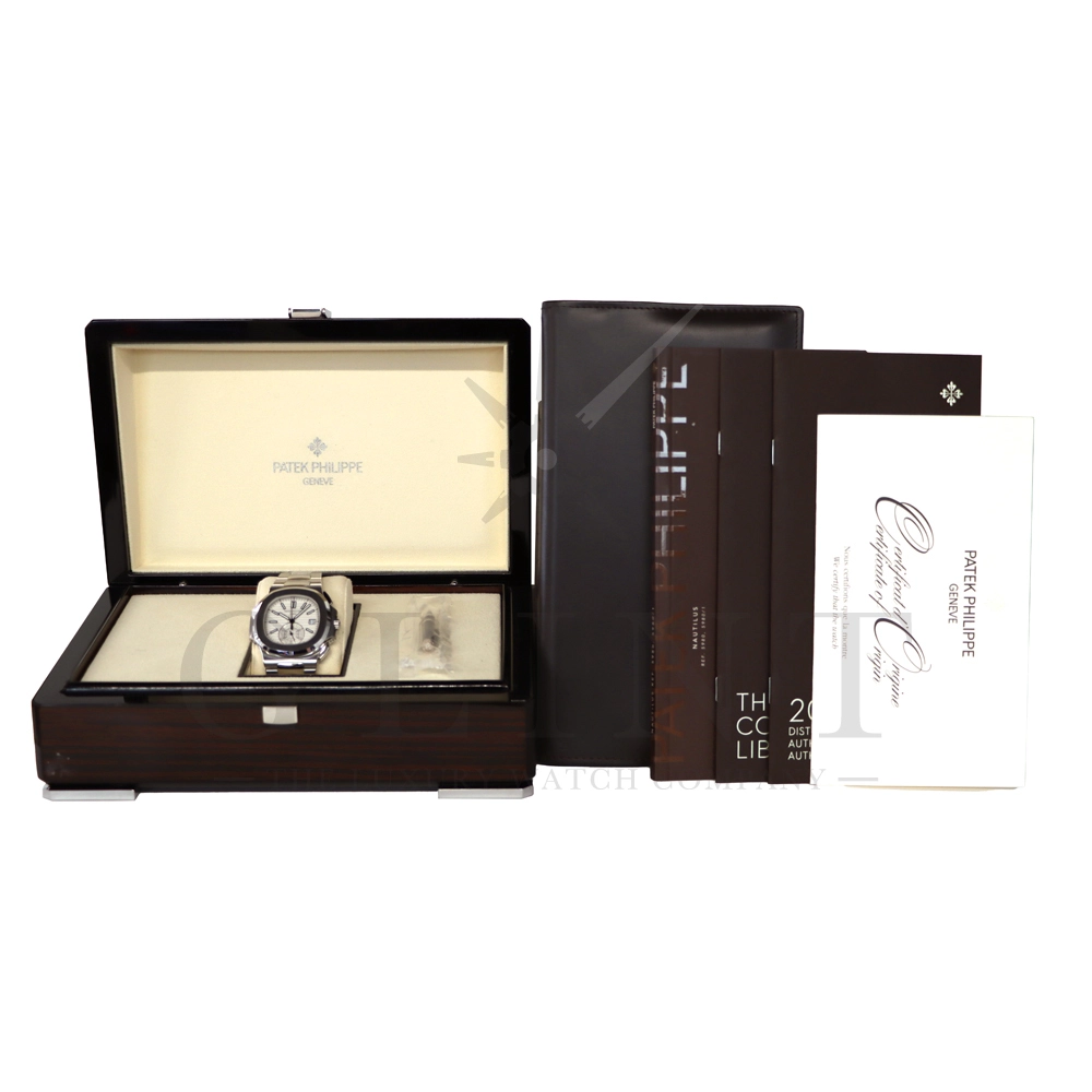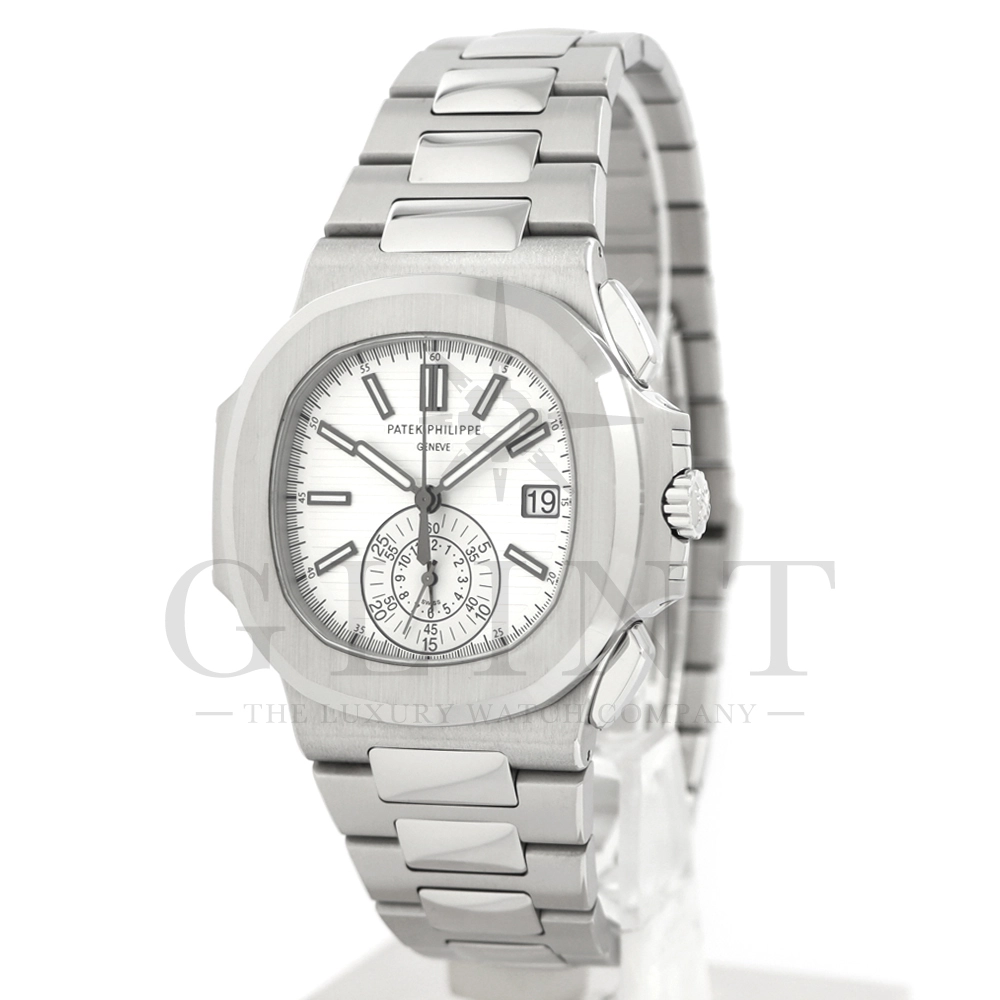 こちらはノーチラス クロノグラフです。爽やかで光沢感のあるホワイト文字盤が目を惹くこちらは、2012年に登場し僅か2年程の製造期間となっているため、希少性の高いモデルのひとつとして数えられています。シースルーのケースバックからは、自社開発自動巻きクロノグラフ「Cal.CH28-520」を覗き見る事ができ、機械式時計の最高峰を追及した名門パテックフィリップが作り出す独自の世界観を存分に堪能することができるでしょう。ビジネスシーンやカジュアルに過ごす休日など、全てのシーンでワンランク上の存在感を味わえる希少な一本です。