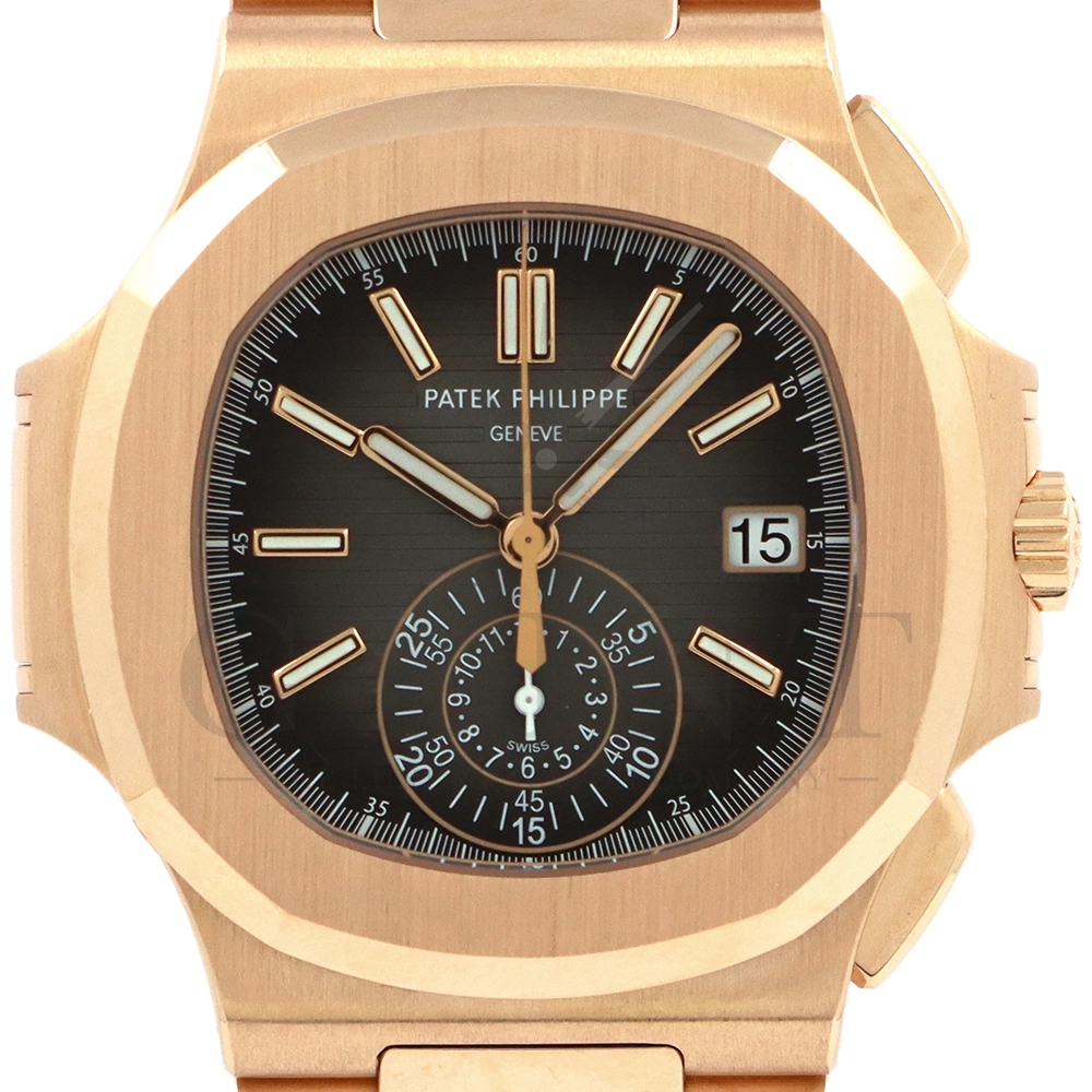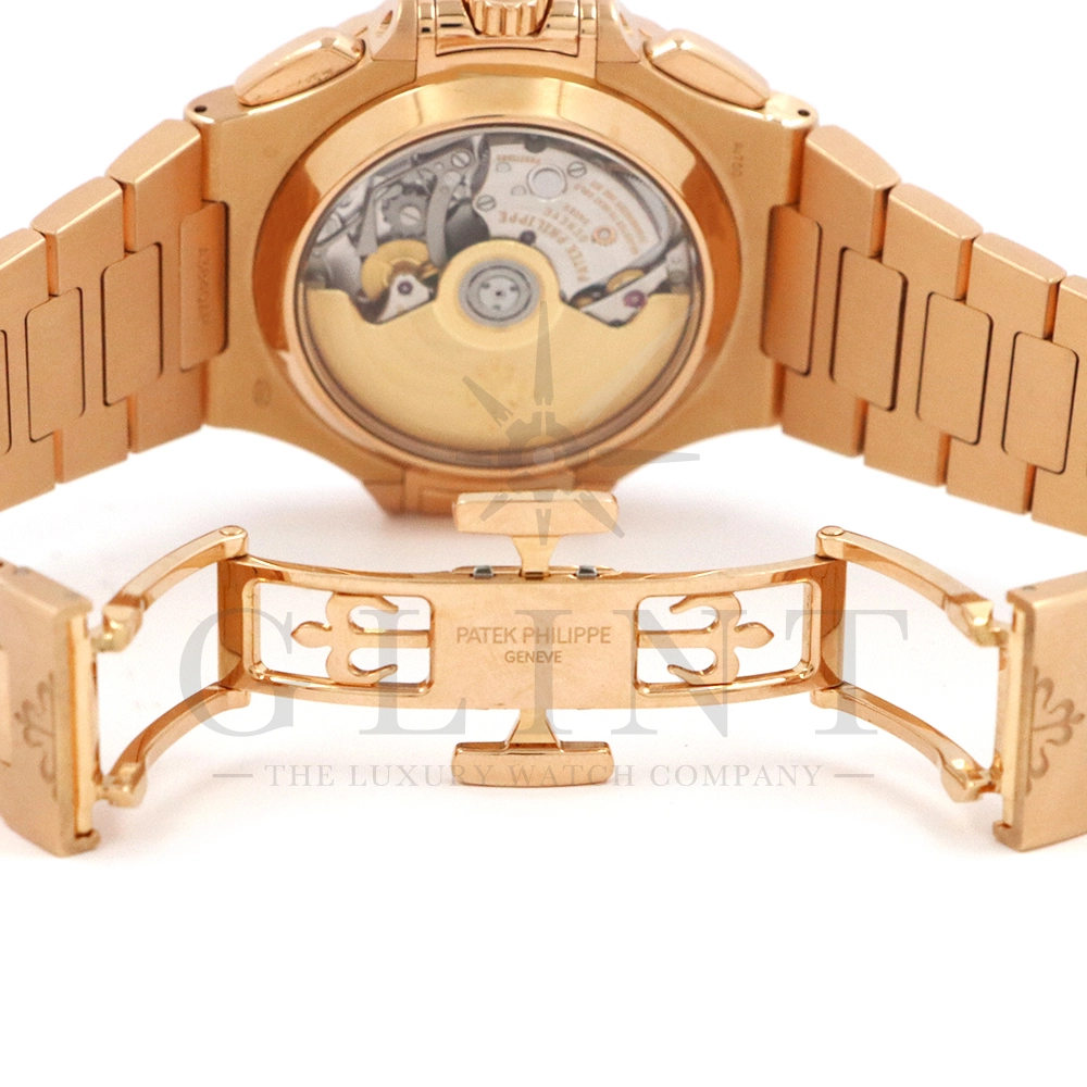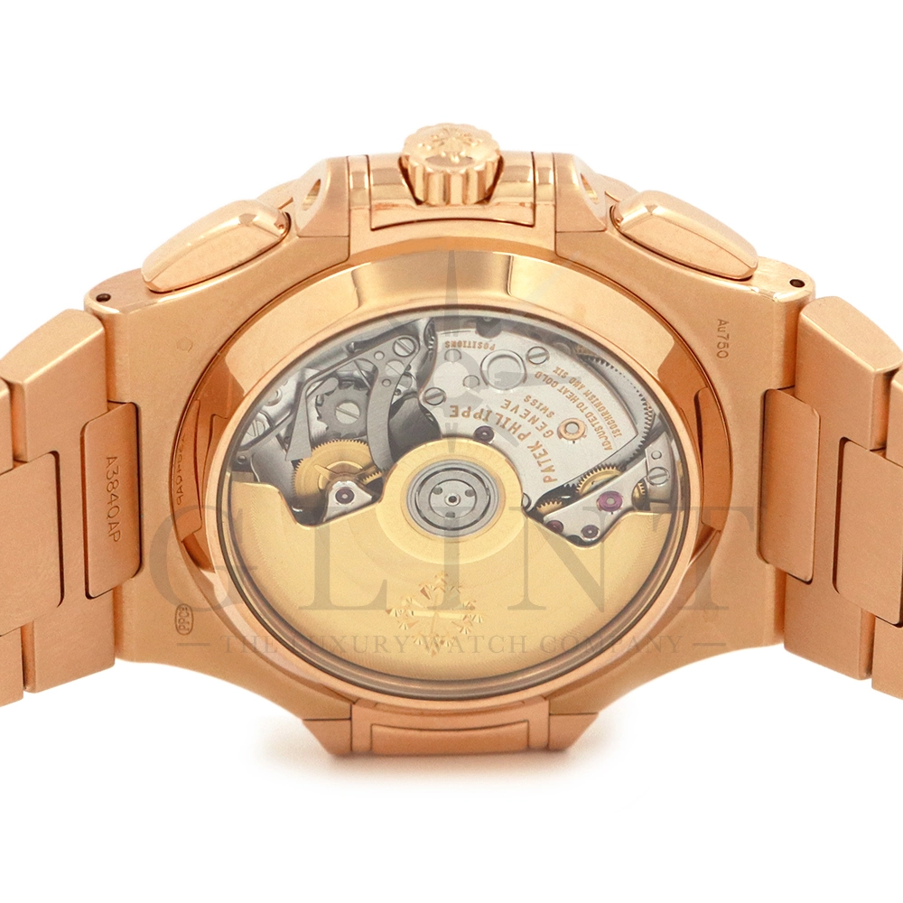 こちらはノーチラス初のスポーツクロノグラフ Ref.5980/1R-001。ケースとベルトにローズゴールドを使用したラグジュアリーなモデルながらも、ブラック・グラデーション文字盤との組み合わせによってシックで上品な雰囲気を演出してくれます。また、見た目の華やかさのみならず、言わずと知れた機能性と信頼性が凝縮された珠玉の一本であり、他のクロノグラフとは一線を画す唯一無二のモデルです。シースルーのケースバックからは、自社開発自動巻きクロノグラフ「Cal.CH28-520」を覗き見る事ができ、機械式時計の最高峰を追及した名門パテックフィリップが作り出す独自の世界観を存分に堪能することができるでしょう。誰もが羨む極上の一本です。