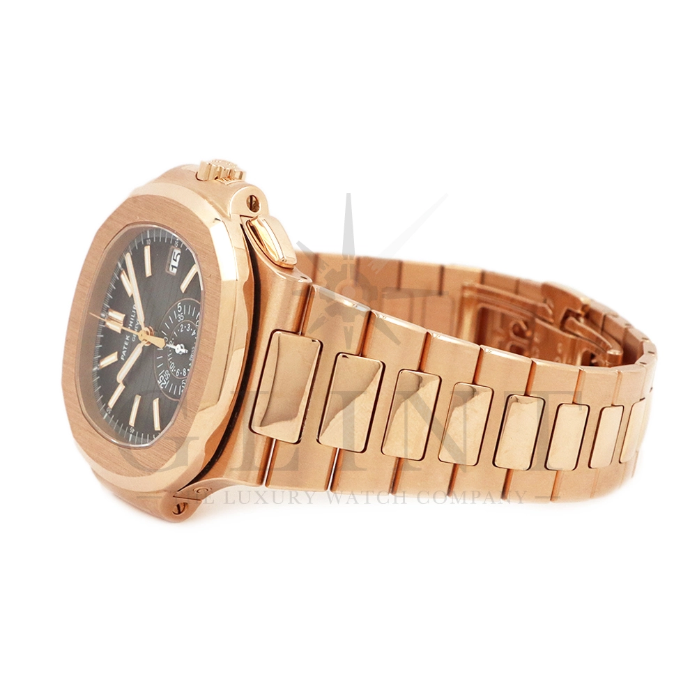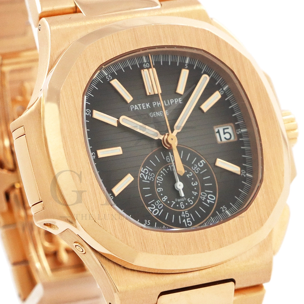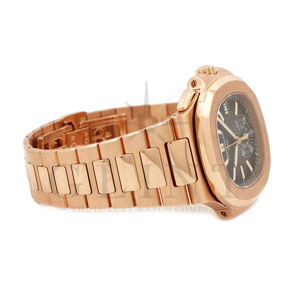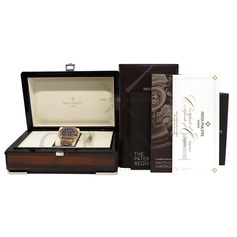 こちらはノーチラス初のスポーツクロノグラフ Ref.5980/1R-001。ケースとベルトにローズゴールドを使用したラグジュアリーなモデルながらも、ブラック・グラデーション文字盤との組み合わせによってシックで上品な雰囲気を演出してくれます。また、見た目の華やかさのみならず、言わずと知れた機能性と信頼性が凝縮された珠玉の一本であり、他のクロノグラフとは一線を画す唯一無二のモデルです。シースルーのケースバックからは、自社開発自動巻きクロノグラフ「Cal.CH28-520」を覗き見る事ができ、機械式時計の最高峰を追及した名門パテックフィリップが作り出す独自の世界観を存分に堪能することができるでしょう。誰もが羨む極上の一本です。